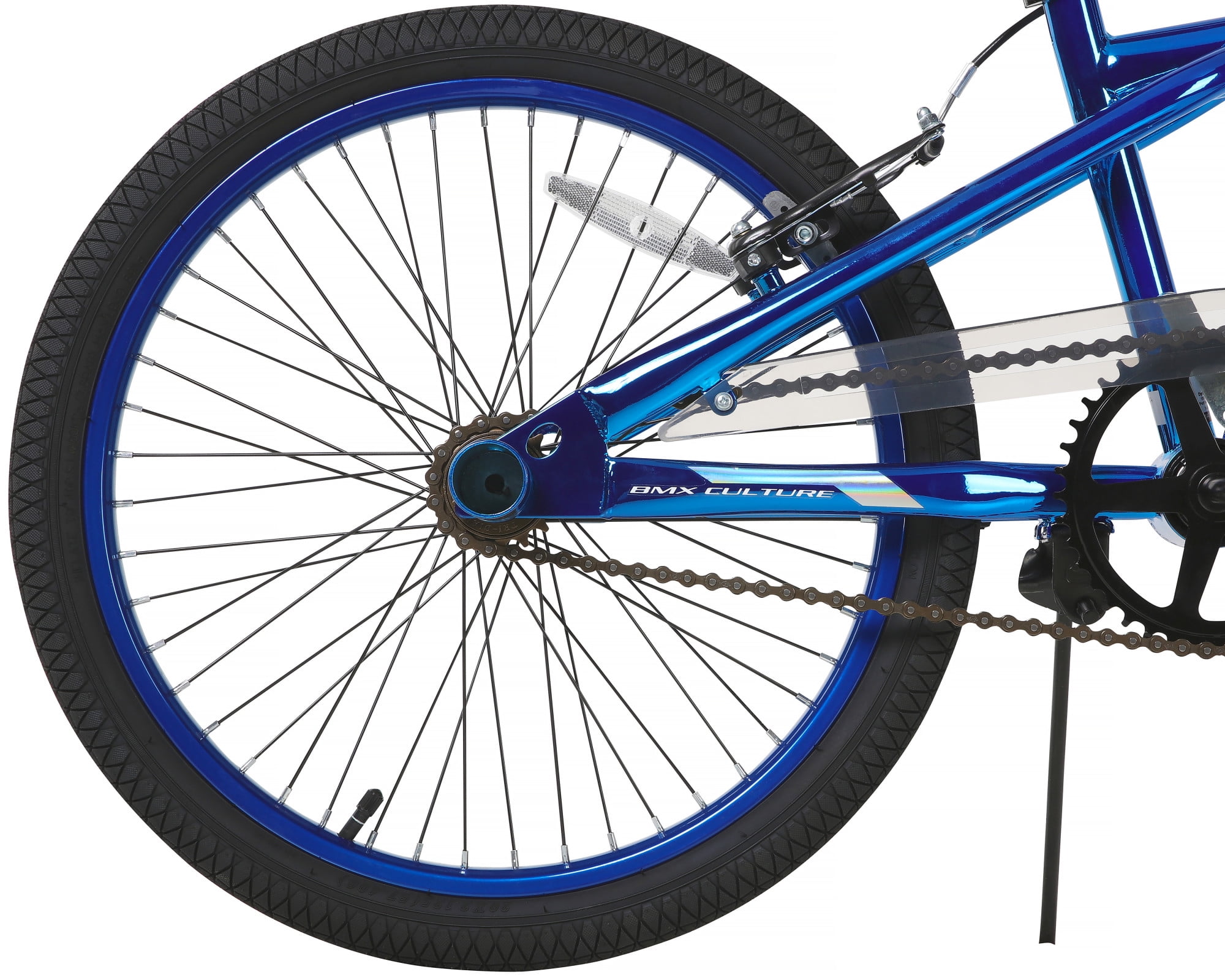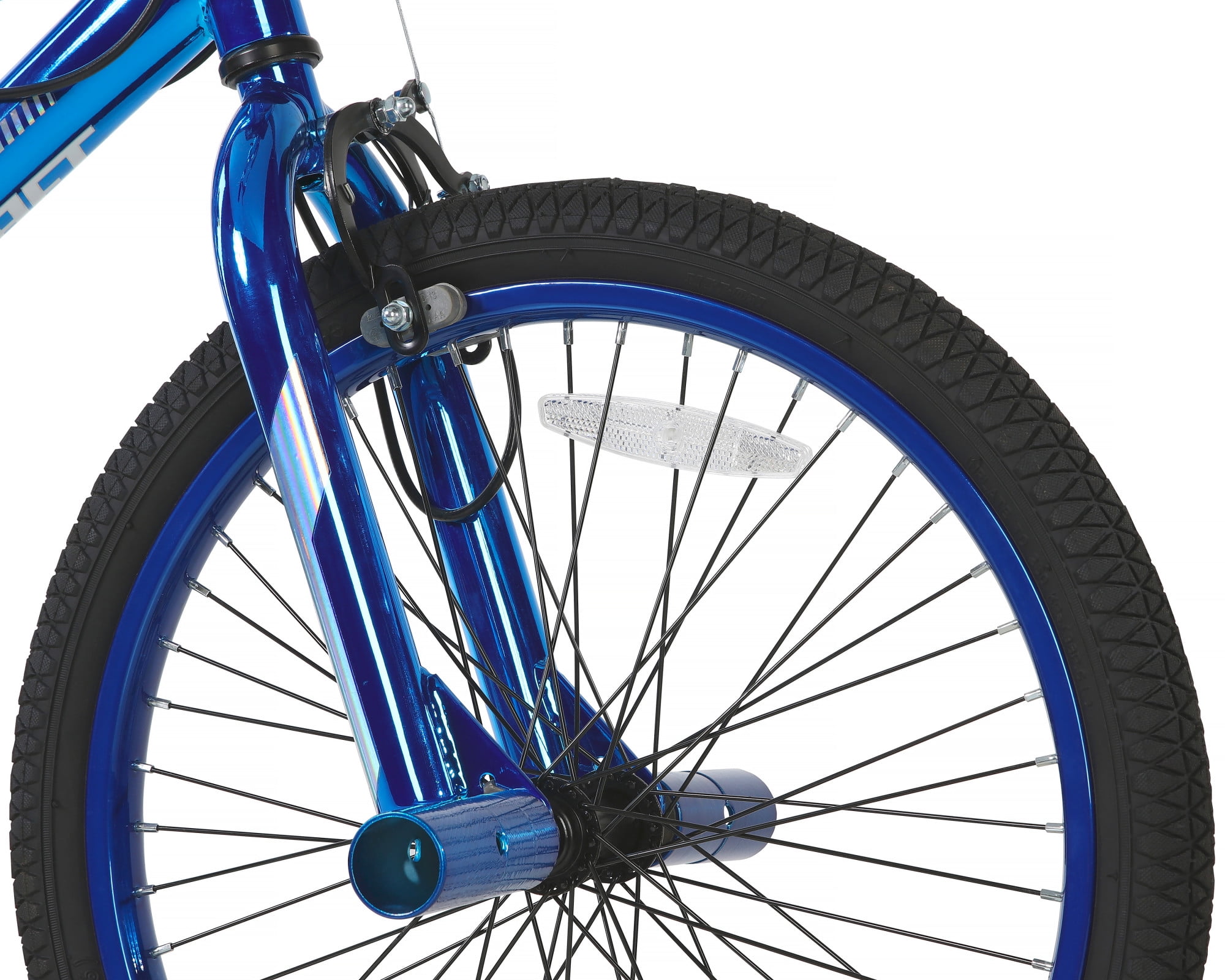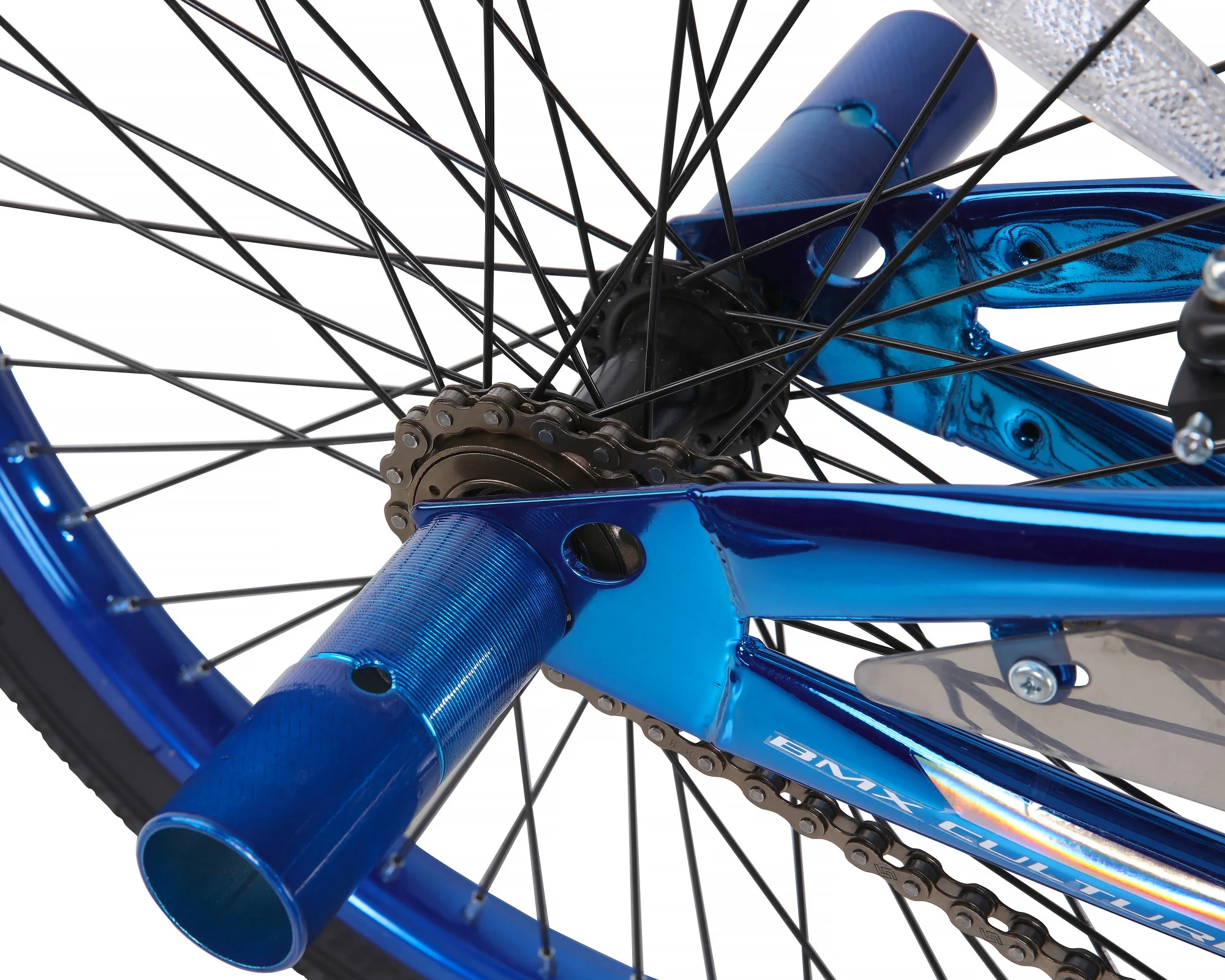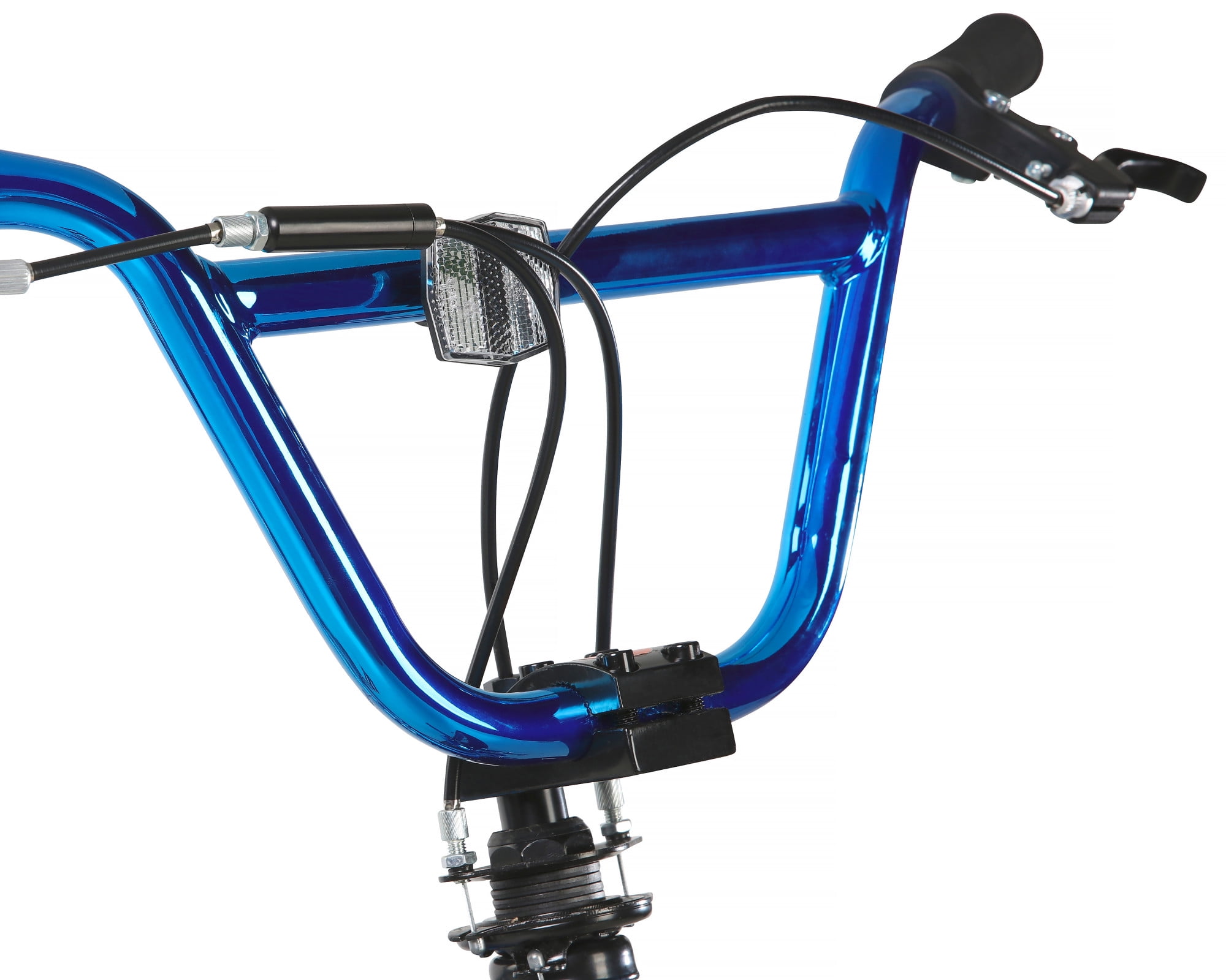 - Sleek Style: This 20-inch boys’ blue bike combines sleek and stylish design with a durable chrome blue steel frame adorned with energetic white graphics, creating an eye-catching and dynamic appearance.
