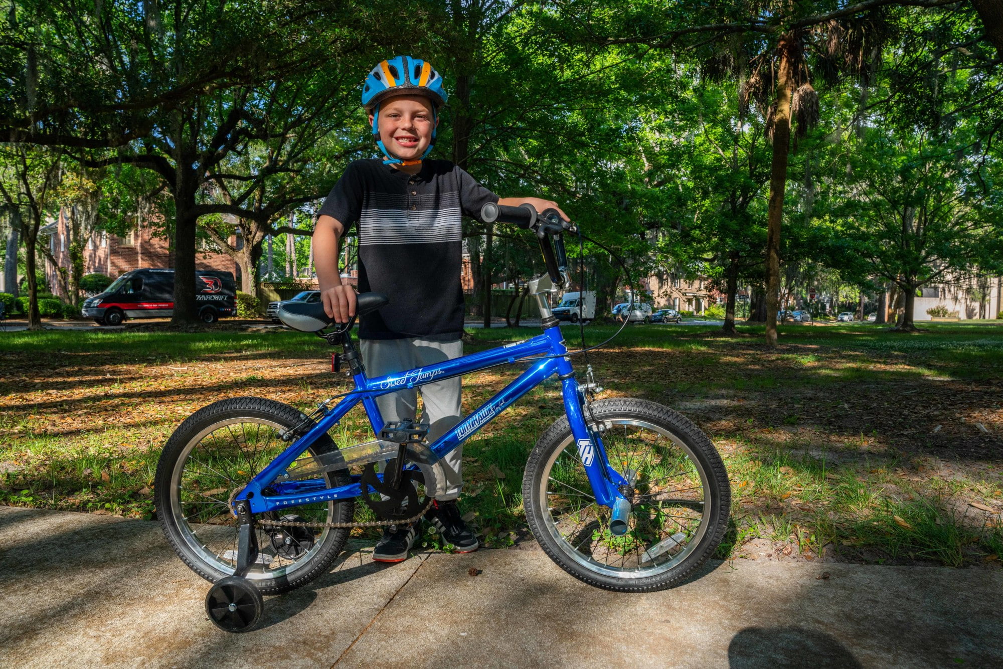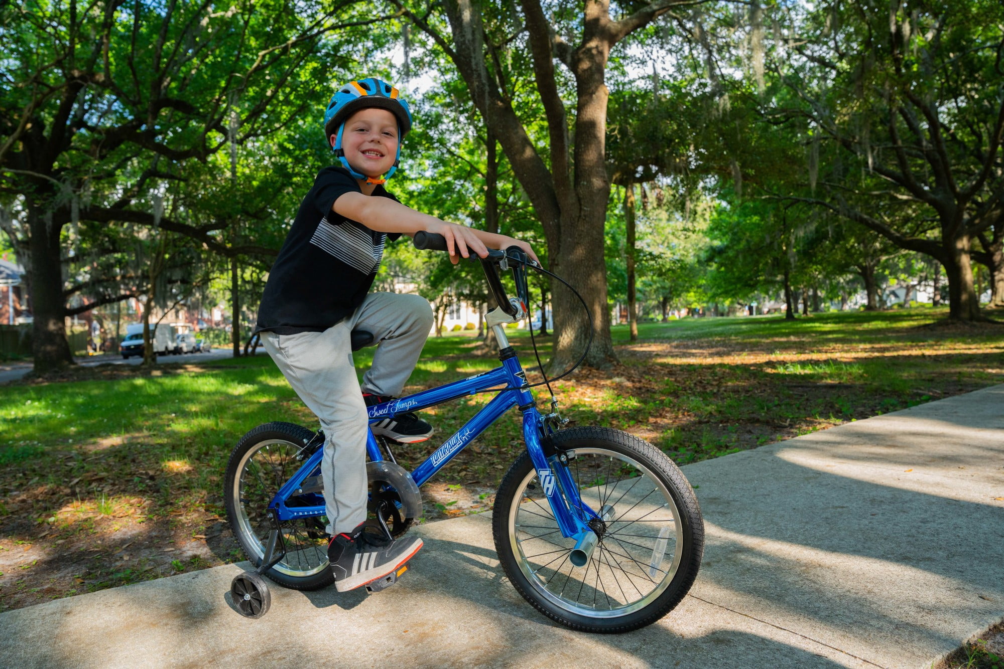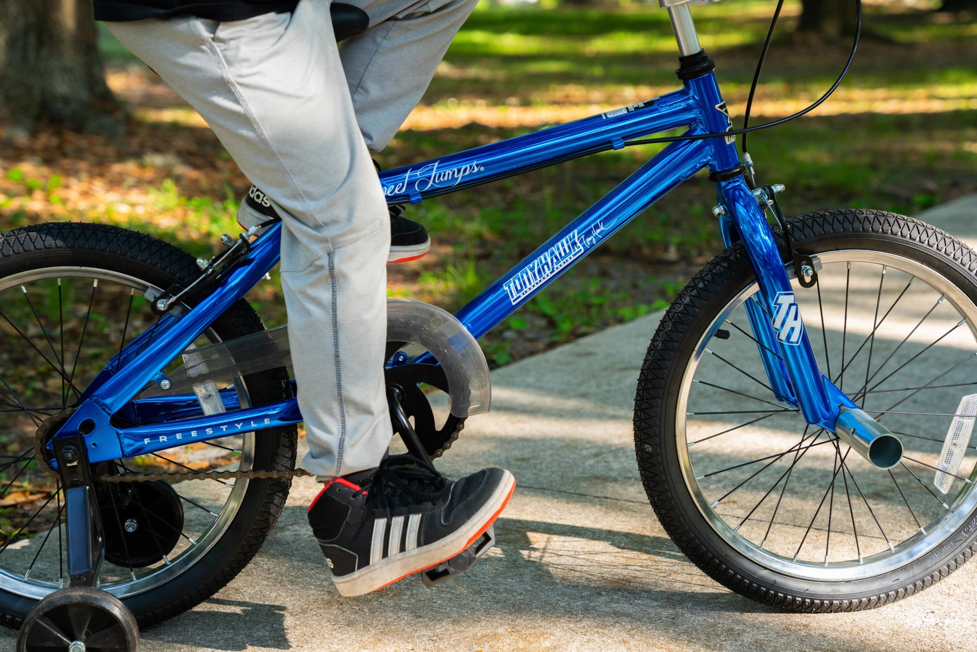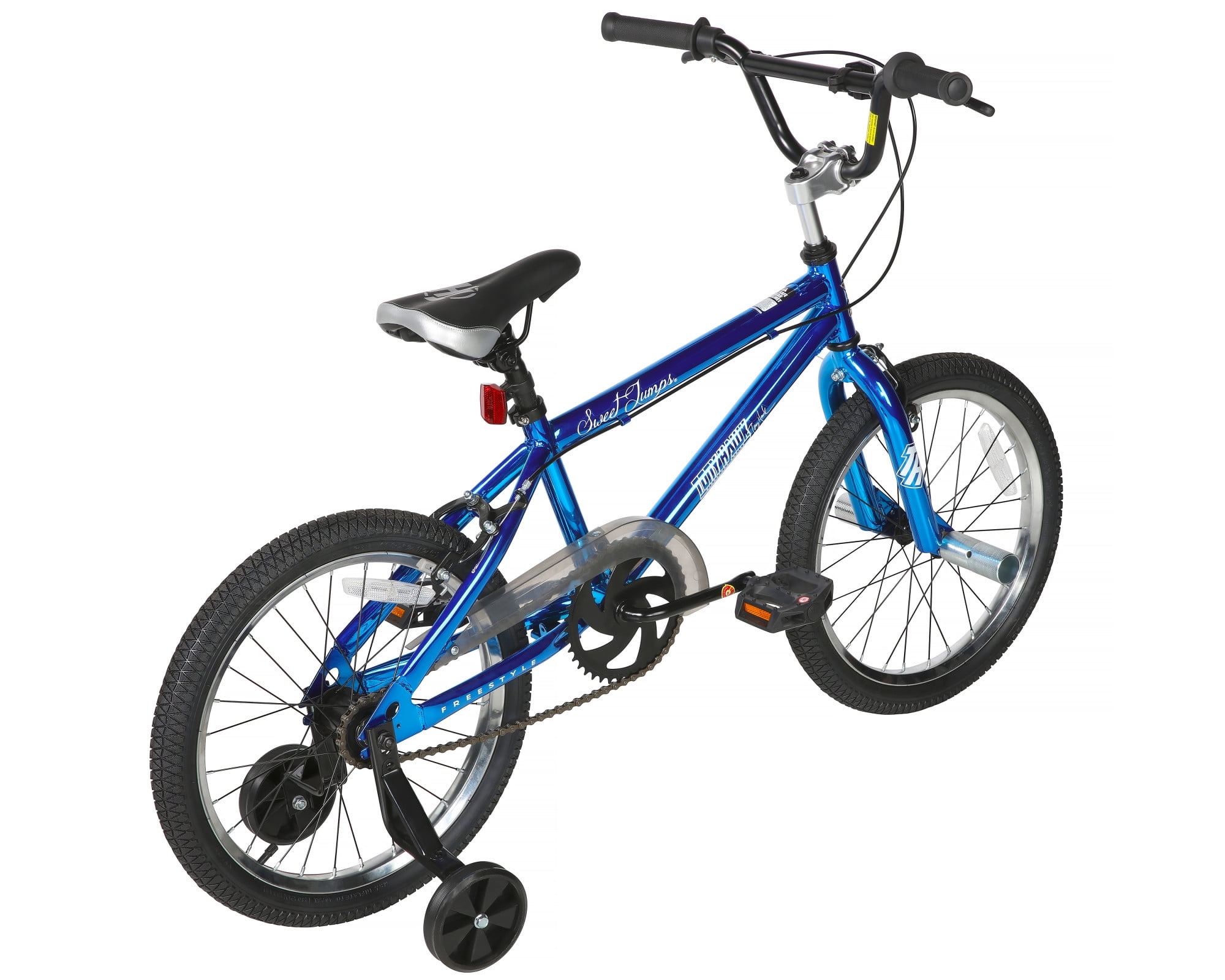 Sturdy Steel Frame with Blue Chrome-Effect Paint Finish by Dynacraft with Authentic Tony Hawk Graphics 18-inch Wheel Size for Male Riders Aged 6-9 or 40-48″ Tall Front and Rear Caliper Brakes for Safety and Control Includes Front BMX Freestyle Pegs Removable and Adjustable Training Wheels Allowing Confident Riding Progression Limited Lifetime Warranty on Frame and Fork