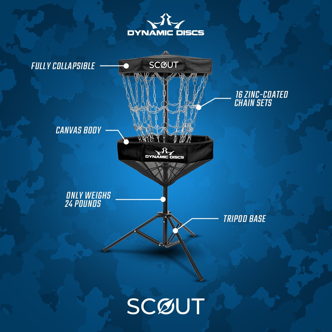 The Dynamic Discs scout disc golf basket is perfect for getting in a putting practice session anywhere you go. This foldable disc golf target comes with a carrying bag so it can be easily stored wherever you go. It is also lightweight weighing 24 lbs so it can be easily moved from place to place without much effort. Sturdy construction and a sturdy base make it great for outdoor putting practice in most weather conditions. It is also perfect for indoor putting practice with a quick setup and cleanup process. 16 zinc-coated chains canvas basket collapsible tripod-style base. Measures 55″ tall and 24″ wide assembled. Measures 55″ tall and 12″ wide when not assembled. Not designed for long-term outdoor use.