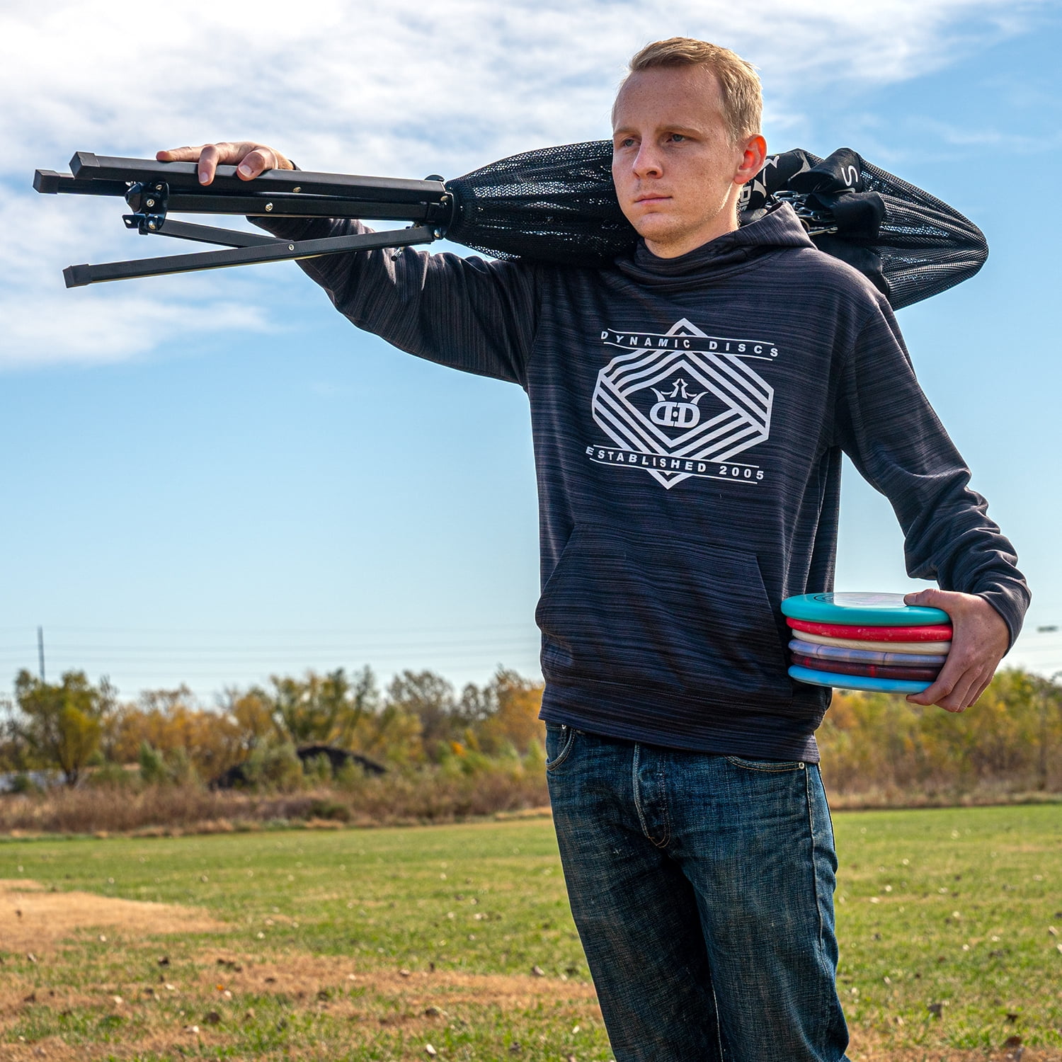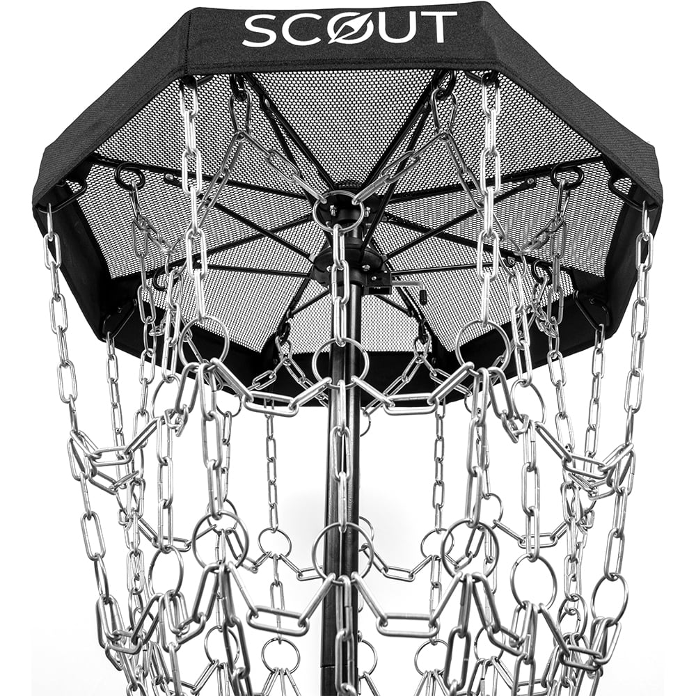 We want everyone to go out, get active, and play disc golf. Sometimes, especially if a course is a ways away, you might be taking that enjoyment to your yard or over to the park. For this reason, we’ve developed the scout basket, a portable, affordable, and easy-to-assemble solution designed to get you playing disc golf anywhere and improving your score whenever you have the time. A durable canvas top and 16 zinc-coated chains form the top assembly to ensure longevity and a sturdy center pole helps the scout to catch putts better. The tripod base and basket lock into place from a collapsed position for quick assembly, and disassembly is just as simple. The scout weighs only 24 pounds, so you can set up for practice putts and shots with ease. If you’re looking for portable quality in a basket, pick up a scout, and look out for those falling scores.