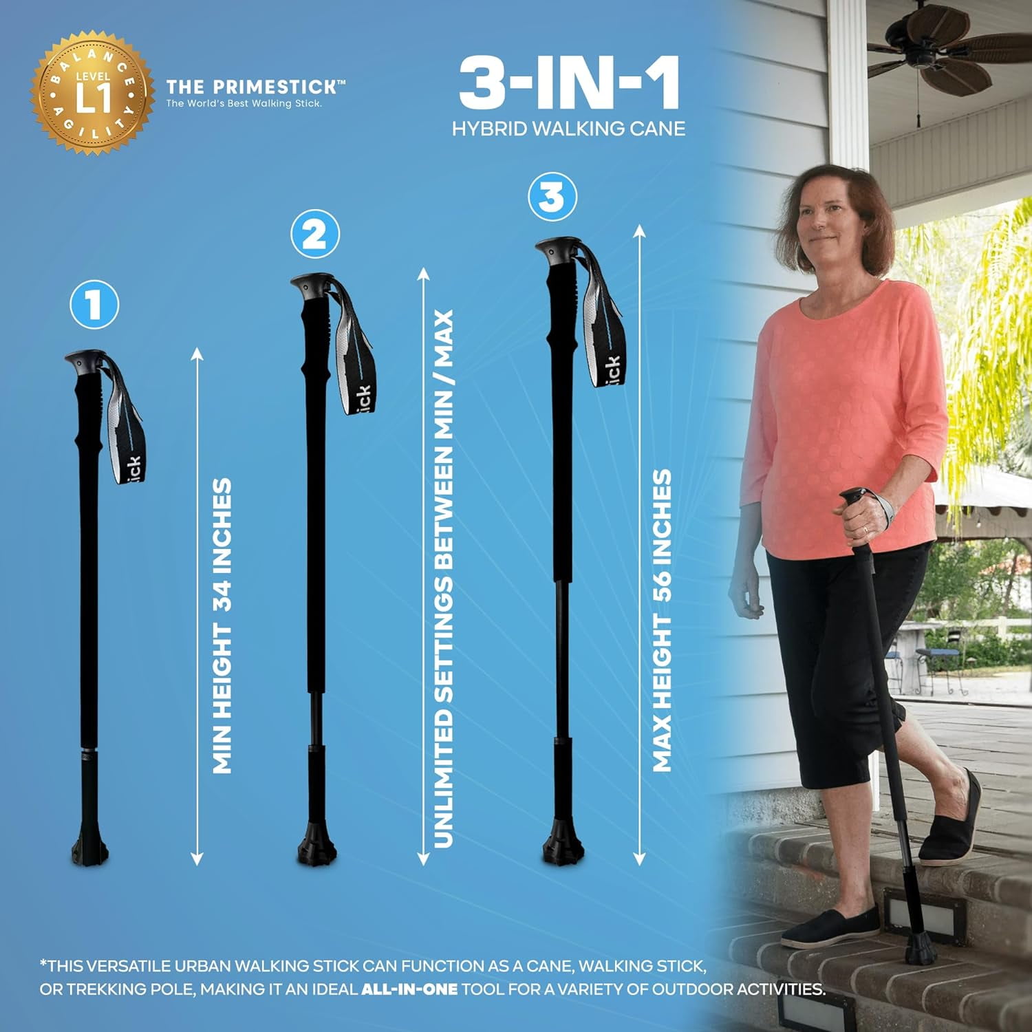 ADJUSTABLE WALKING CANE FOR SAFETY AND COMFORTABLE MOBILITY: Designed to provide optimal comfort and stability with its adjustable height feature, ranging from 34″ to 56″. Its foam-covered grip ensures a comfortable and easy adjustment. It promotes better posture and reduces back strain. Ideal for indoor and outdoor making it perfect for appointments, shopping trips, strolls, hiking and walking activities that require balance. ALL-WEATHER ALL-TERRAIN WALKING CANE: The Prime Stick’s Cyclone Tip base has grippy, open, and flexible channels that offer excellent traction on any terrain and in any weather condition, ensuring surface contact and stability. Its top-to-bottom foam covering allows for a comfortable grip anywhere along the post, making it suitable for men, women and seniors. This walking stick with flex channels provides ultimate stability and balance during hiking and walking. LIGHTWEIGHT AND STRONG SUPPORT:Crafted with an aluminum frame, the Dynamo Prime Stick Cane is incredibly lightweight, weighing only 1LB, which is less than the weight of a typical glass of water. Despite its lightness, the cane can endure up to 150 pounds of pressure on both its grip and shaft. It is highly recommended for men, women seeking improved balance, posture, and mobility, especially seniors. 3-in-1 URBAN WALKING STICK: This versatile urban walking stick can function as a cane, walking stick, or trekking pole, making it an ideal all-in-one tool for a variety of outdoor activities. With all the features you could ever need in a walking aid, this beautifully designed stick is sure to become your go-to trail buddy for walking, hiking, or trekking. WALK WITH CONFIDENCE ANYWHERE: Excellent choice for seniors, men, and women seeking a lightweight walking cane that offers enhanced balance, posture, and mobility, even when hiking. the Prime Stick comes with foam coverage and is adjustable from 34″ to 56″ with ease making it highly versatile. It promotes better posture, encouraging users to stand up straight, and it’s perfect for both indoor and outdoor use. The Dynamo Prime Stick Walking Cane is an ideal companion to have by your side. VERTICAL GRIP WITH BONUS TETHER – the vertical grip is made of soft foam that is very comfortable and has a wide adjustable tether to make your walks even more pleasant. ANYWHERE GRIP – This foam covers your cane from top to bottom allowing you to grip it anywhere you need to, to get the job done. Be creative!