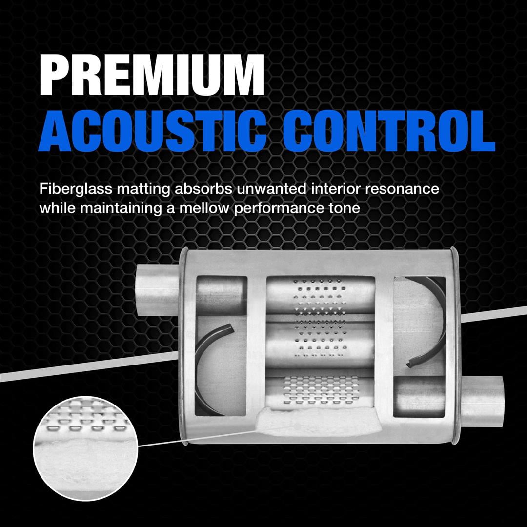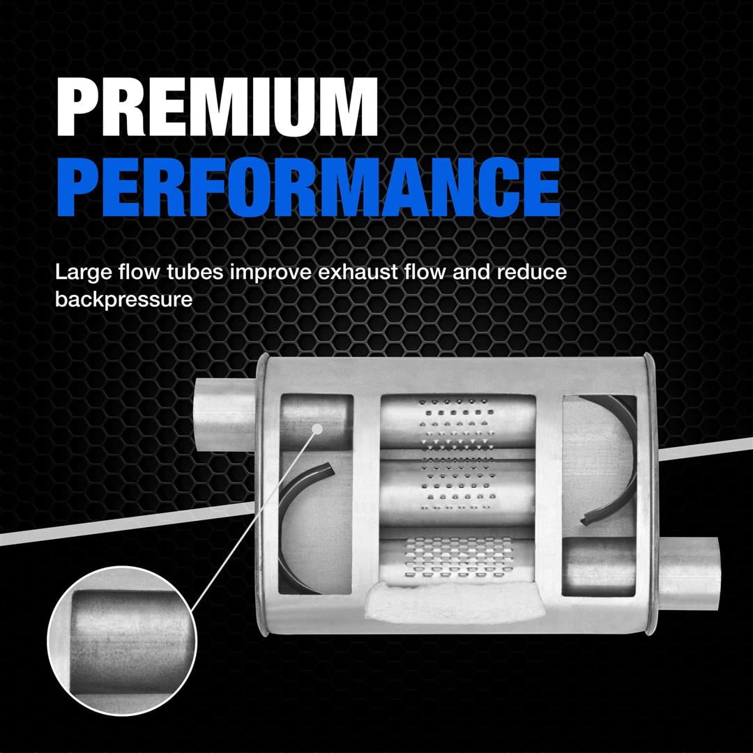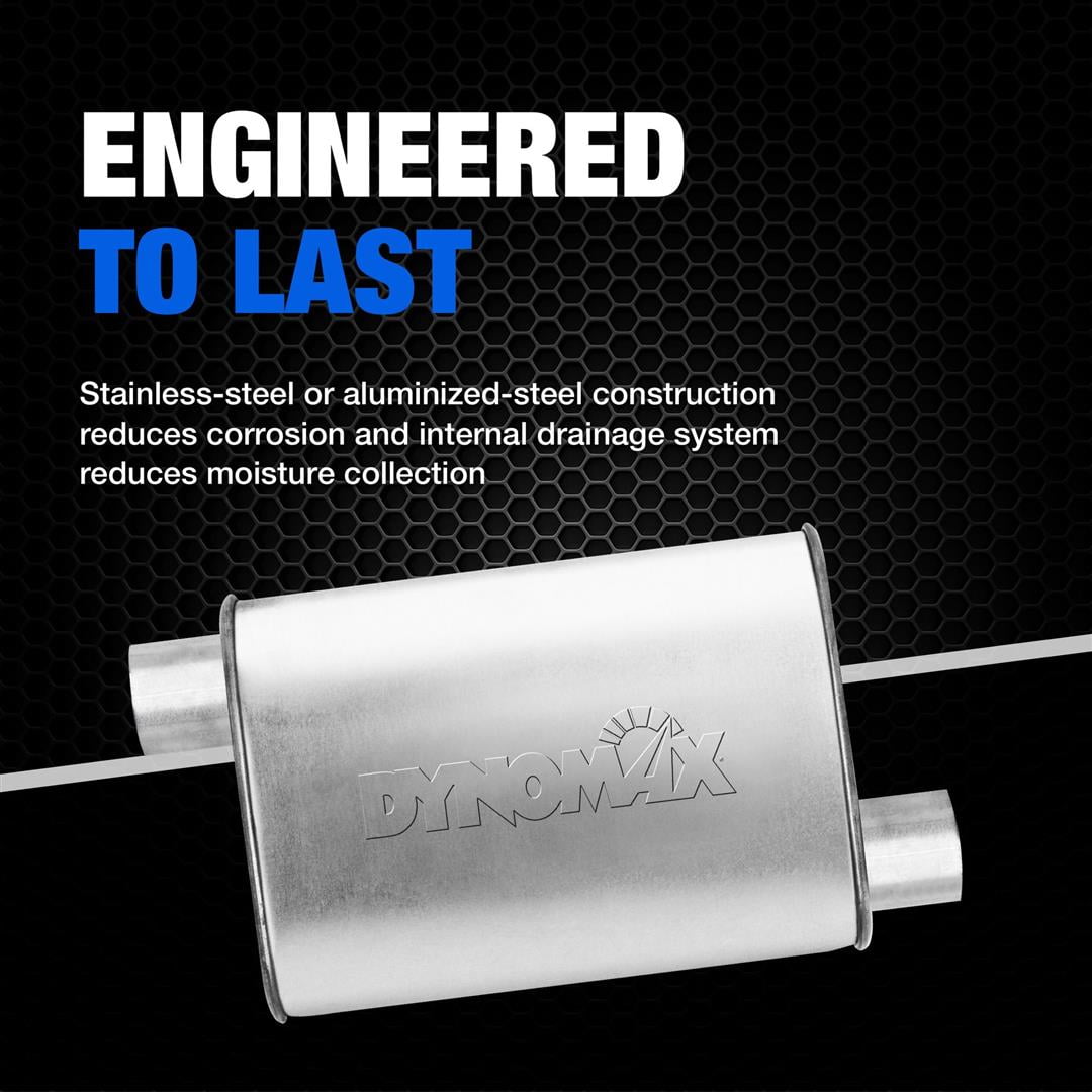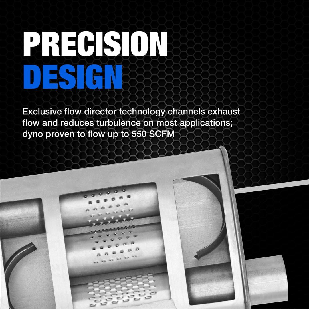 PREMIUM ACOUSTIC CONTROL: Fiberglass matting absorbs unwanted interior resonance while maintaining a mellow performance tone PRECISION DESIGN: Exclusive flow director technology channels exhaust flow and reduces turbulence on most applications, dyno proven to flow up to 550 SCFM PREMIUM PERFORMANCE: Large flow tubes improve exhaust flow and reduce backpressure ENGINEERED to LAST: 100 percent stainless-steel construction delivers longer life versus aluminized mufflers while an internal drainage system reduces moisture collection FLEXIBLE SOLUTION: Customizable design offered in a variety of styles and sizes for universal fitment (may require specialized fabrication and/or welding) COMPLETE PERFORMANCE UPGRADE: Use premium DynoMax accessories when installing DynoMax Super Turbo mufflers for a complete exhaust system upgrade