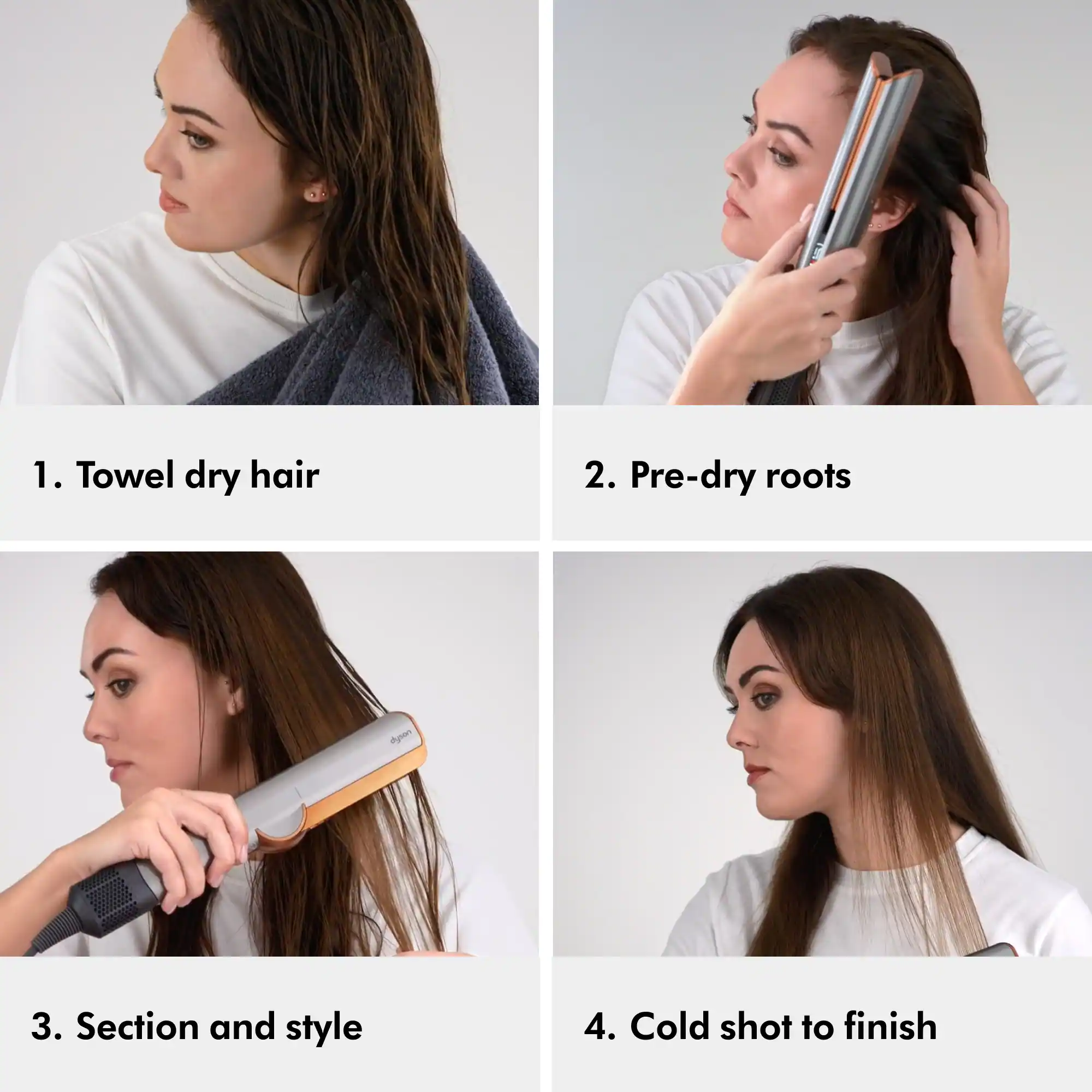 The Dyson Airstrait dries and straightens hair simultaneously. Take hair from wet to a finished look – with one machine.