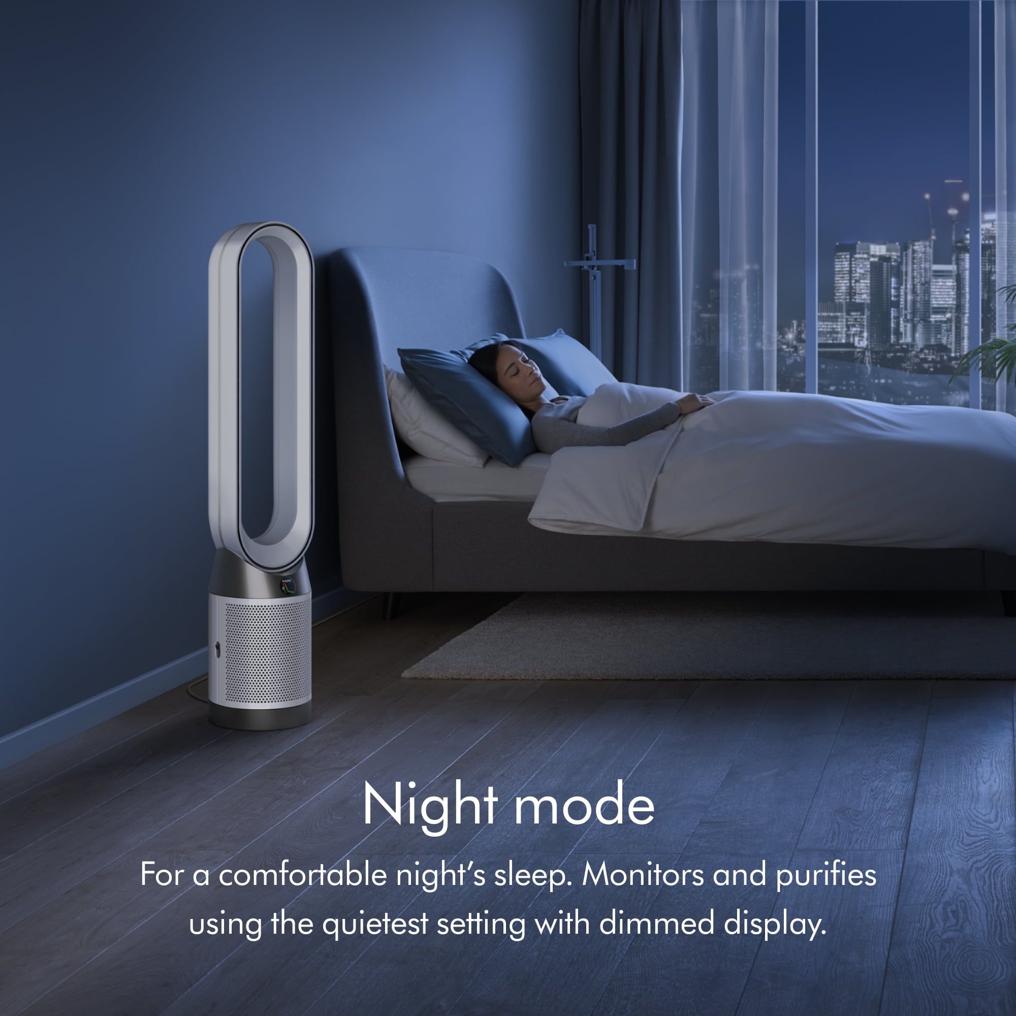 Cools you³ | Whole-room purification¹ | Removes 99.97% of particles as small as 0.3 microns Removes airborne pollutants. HEPA and activated carbon filtration removes 99.97% of particles as small as 0.3 microns. Whole-room purification. Air Multiplier™ technology generates the circulation to purify the whole room.¹ Cools you in summer³. A powerful stream of purified airflow cools you during warmer weather. Night mode. Operates quietly to monitor and purify your room while you sleep.
