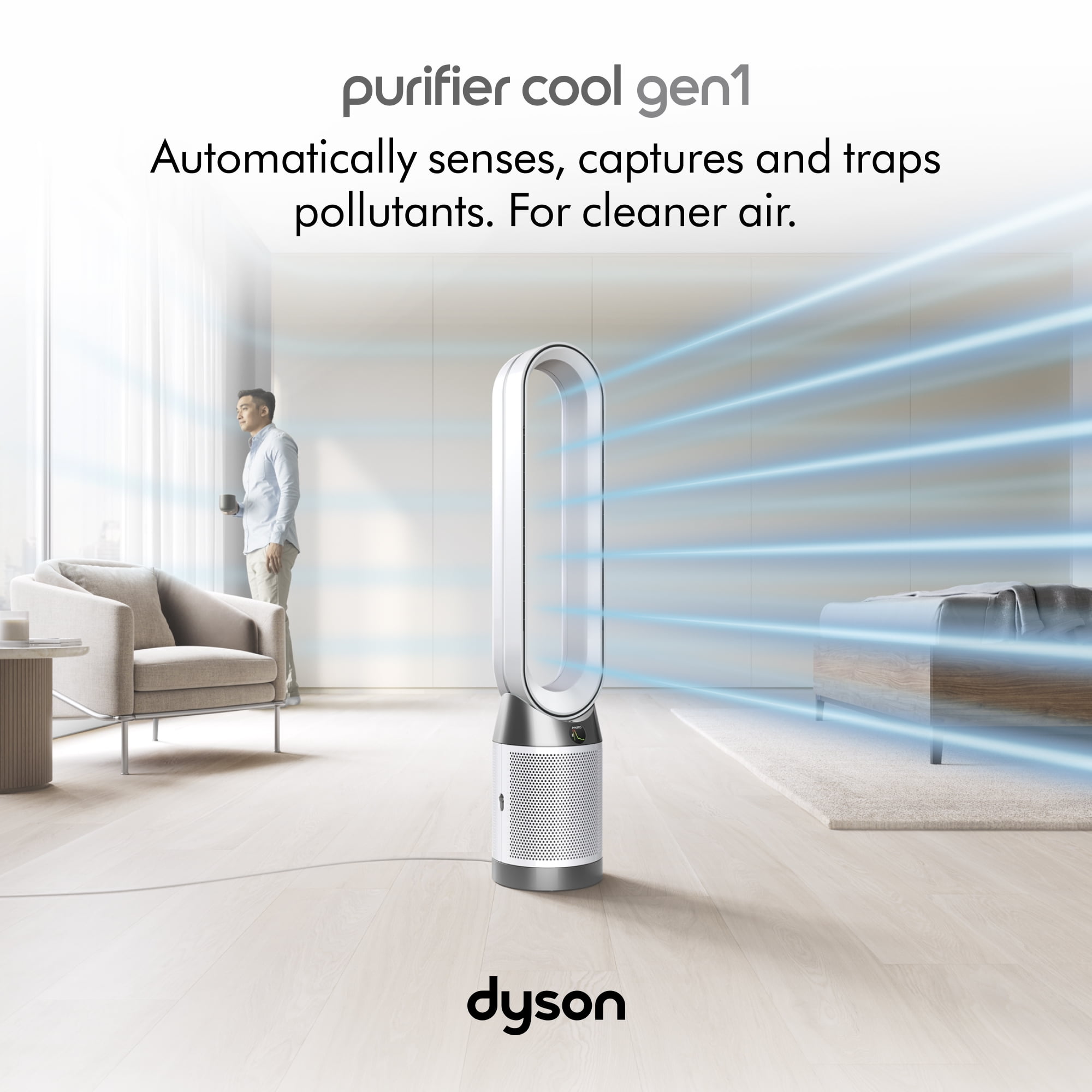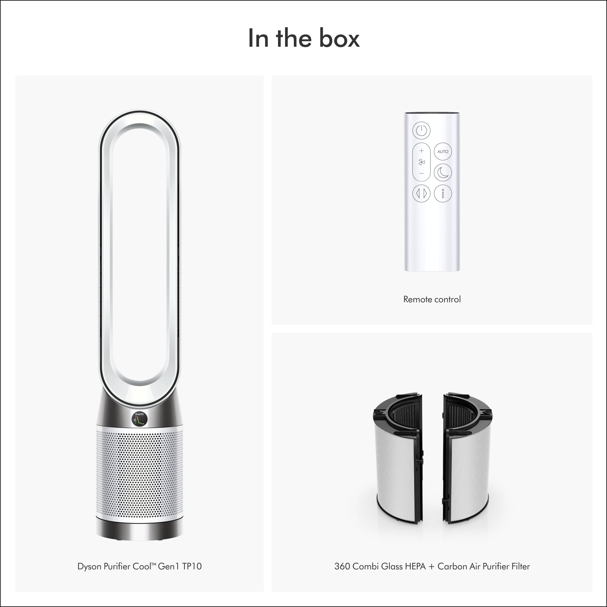 The Dyson Purifier Cool™ Gen1 purifying fan automatically senses, captures and traps pollutants to purify your whole room¹, while removing 99.97% of particles as small as 0.3 microns.² ¹Tested per Dyson internal test standards for whole-room air projection (TM-005021) and purification coverage (TM-003711) ²Tested per ISO 29463. ³Fan, not an air conditioning unit. In the box: Remote Control, 360 Combi Glass HEPA + Carbon air purifier filter.