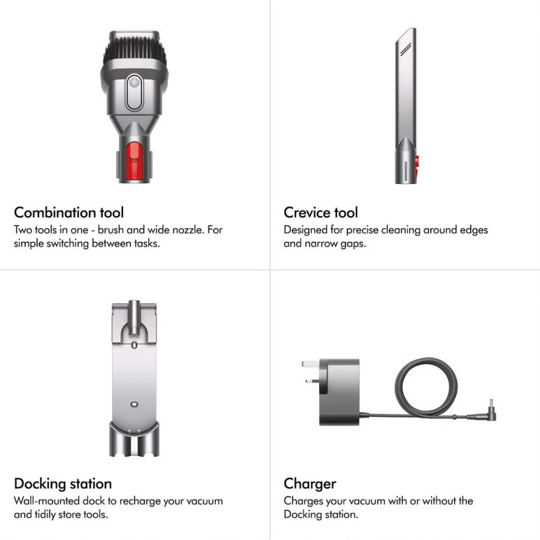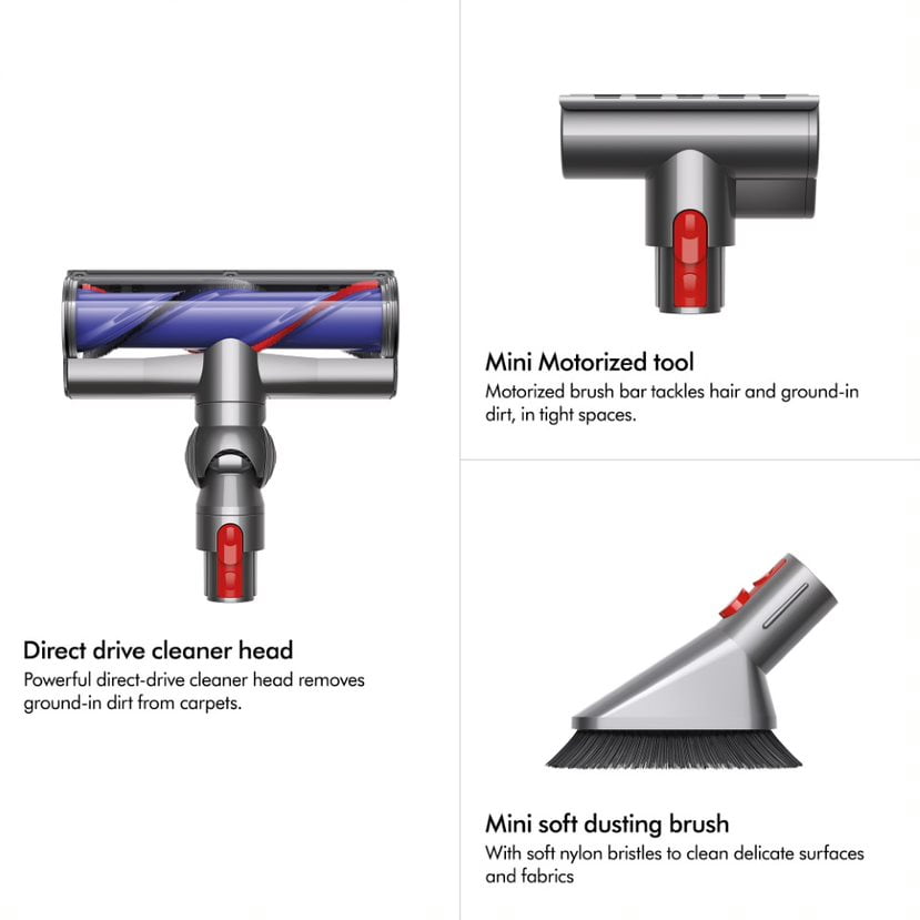 Handle Controls Height Adjustment Telescopic Handle Powered by the Dyson digital motor V8 Up to 40 minutes of fade-free power* Two power modes Whole machine filtration Combination tool Crevice tool Mini motorized tool Easily reaches up high Quickly transforms to a handheld No-touch bin emptying