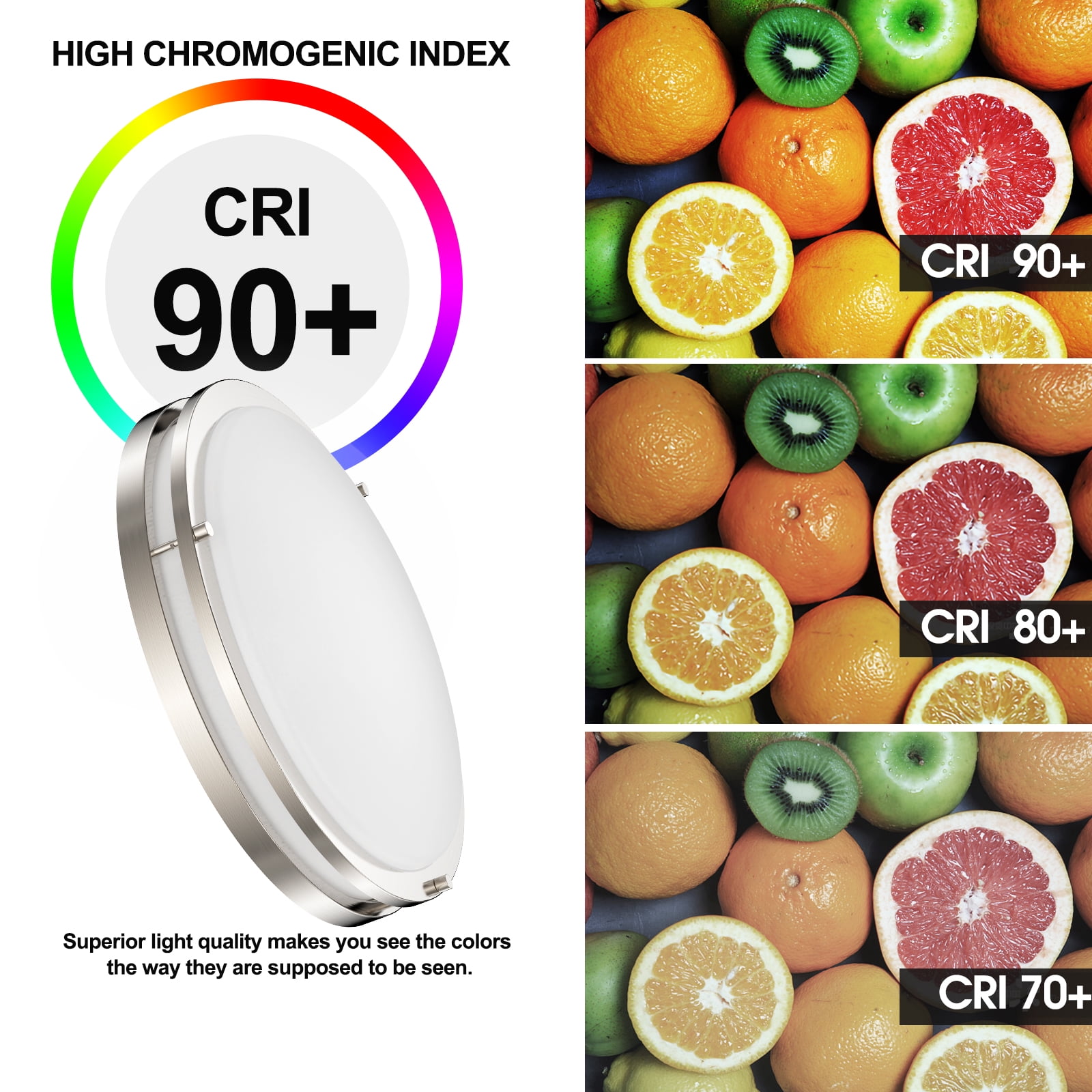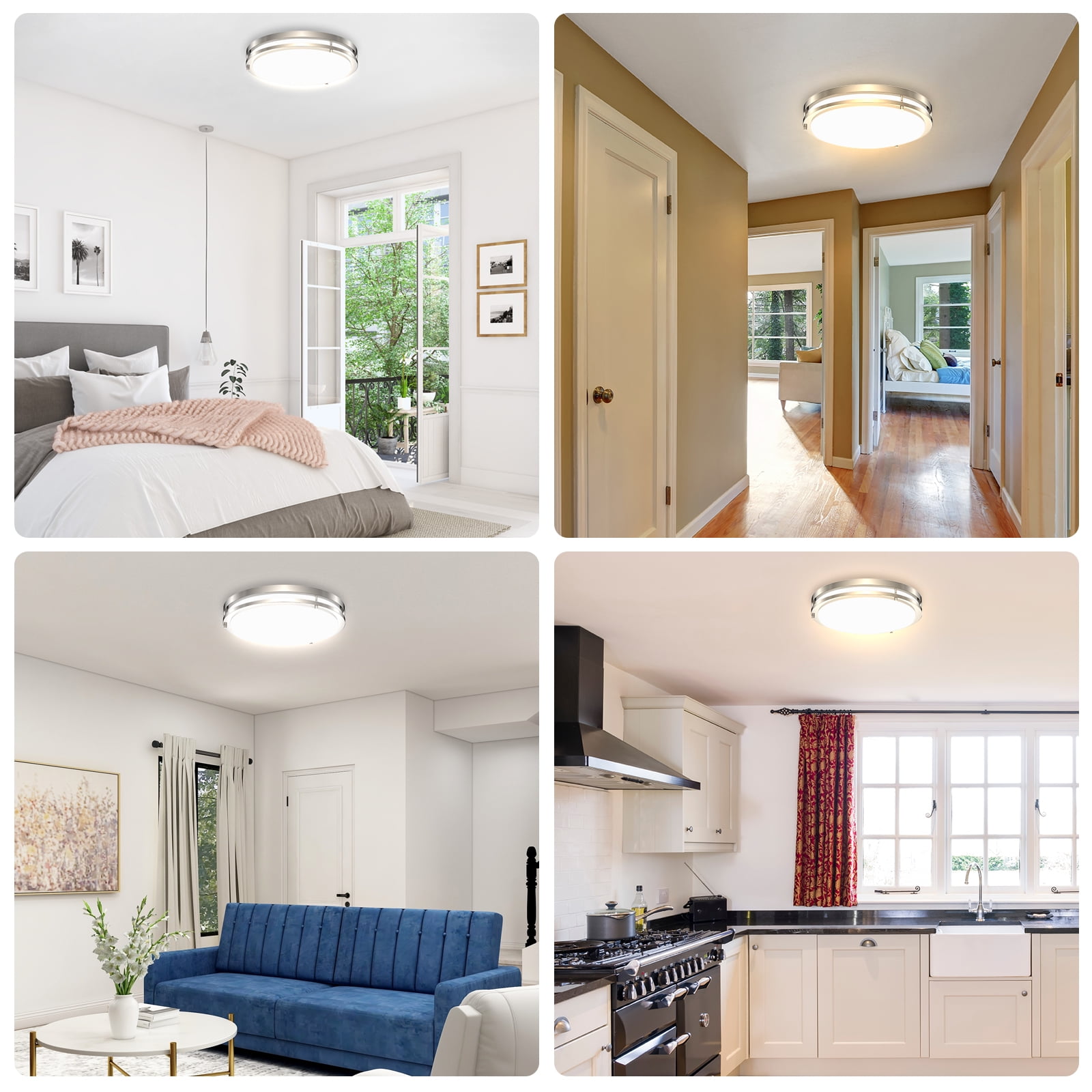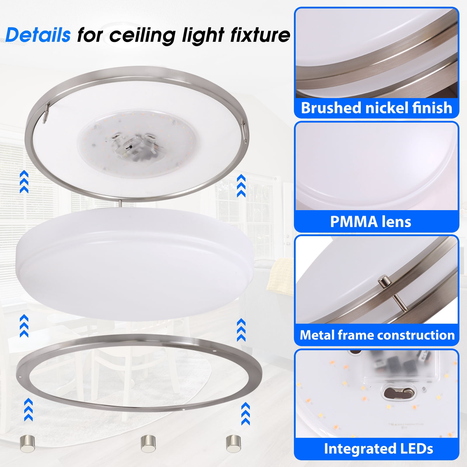 E Energetic Lighting ENERGETIC 13″ Dimmable Brushed Nickel Flush Mount Lights 5-in-1 Color Temperature – Offers a range of 5 color temperatures from 2700K to 6500K, including soft white, warm white, cool white, daylight, and cool daylight, allowing for versatile indoor applications Dimmable & High CRI90+ – Compatible with most triac dimmers (5% to 100%), enabling you to adjust brightness and create the desired ambiance. High color rendition restores true colors for a vivid lighting effect One-Person Installation – Comes with a detailed installation guide and mounting hardware, designed for easy installation that can be completed by one person, saving time compared to traditional fixtures Long-lasting & Wide Application – With an average lifespan of 50,000 hours (up to 45.7 years at 3 hours per day), this light is ideal for various spaces including hallways, kitchens, bedrooms, living rooms, bathrooms, and more Quality Assurance – Made with high-density acrylic material and certified by ETL, ensuring safety against electric shock and fire hazards. No dark spots or shadows when lit