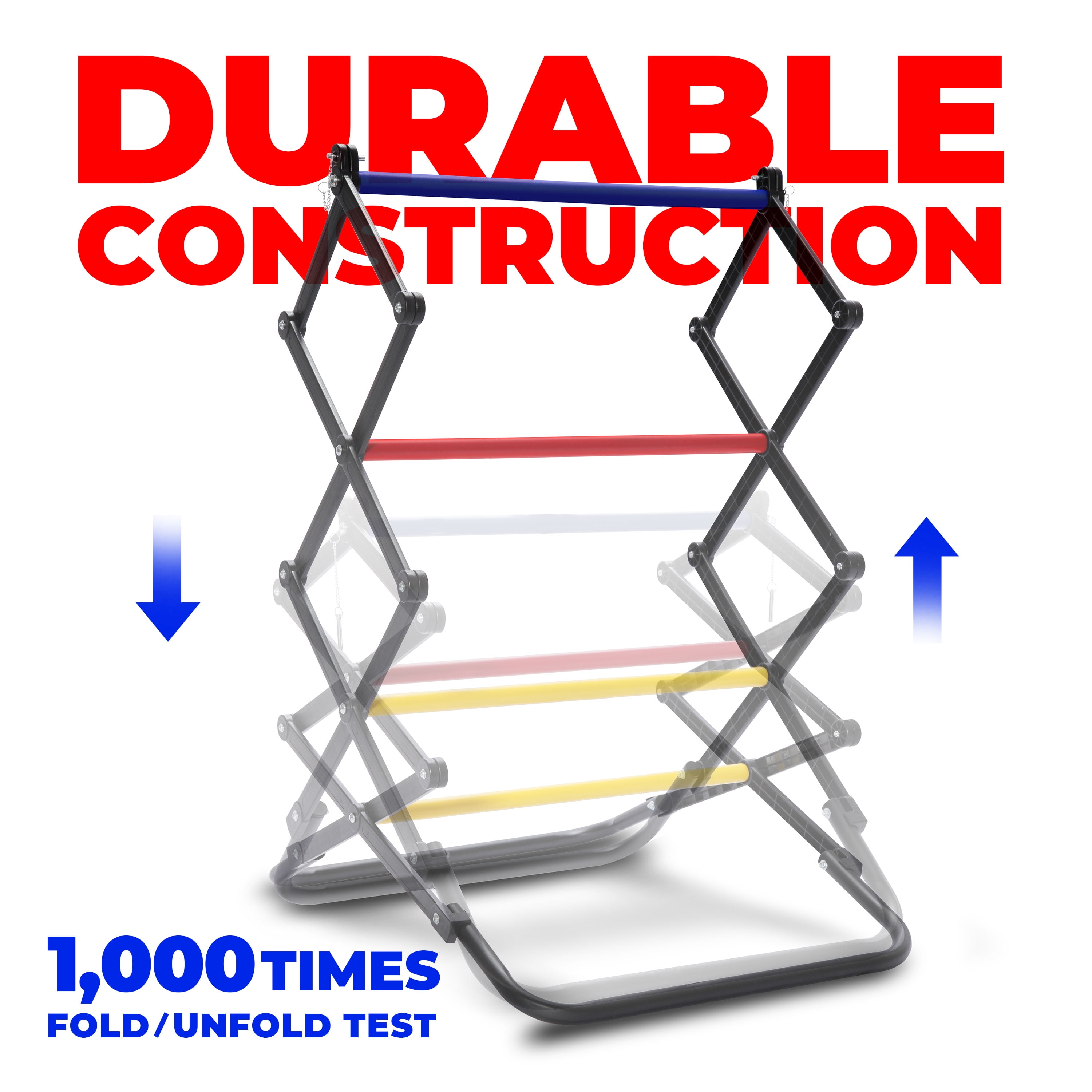 Folding Ladder Toss Games adapting a patented folding structure makes it become the most outstanding Ladder Toss in the market. The easy and fast-fold design allows it to set up and fold down the steel frames super quick. Perfect lawn game for backyard fun. Unlike the traditional one which requires assembling tubes one by one every time before starting the game, this premium foldable ladder toss only needs less than 10 seconds to set up. Allows players to quickly start their game anytime without assembly mess. Adopting heavy-duty steel and PVC frames makes it durable to use. The cross leg design further enhanced the stability of the Ladder Toss. It remains stable when you throw the bolas to the target when compared to the traditional one. No missing parts anymore. Simply fold down the Ladder Toss by pressing the first tube to the ground, and putting it back into the carrying bag. Perfect for storing it in a tight space, especially for apartment storage. With a deluxe carrying bag provided, you can easily bring the Ladder Toss anywhere. It is lightweight and portable. Put it in your room, backyard, or even take it to the park, beach to have fun with your friends and family. Only minimal first-time assembly is required, much faster and easier than the traditional assembly method. It doesn’t even require assembly every time. Just assemble it for the first time easily and quickly fold it up to start your game from now on. Product Details Ladder Toss Frame x 2 Blue Ladder Toss Ball x 3 Red Ladder Toss Ball x 3 Ground Peg x 8 Carrying Bag x 1 Assembly Instruction x 1 (Pin Lock x 4, Wrench x 1, Screwdriver x 1, U-shaped tube x 4, Yellow Tube x 2, Red Tube x 2, Blue Tube x 2) Open Size: L24.2 x W24.5 x H39.2 in.