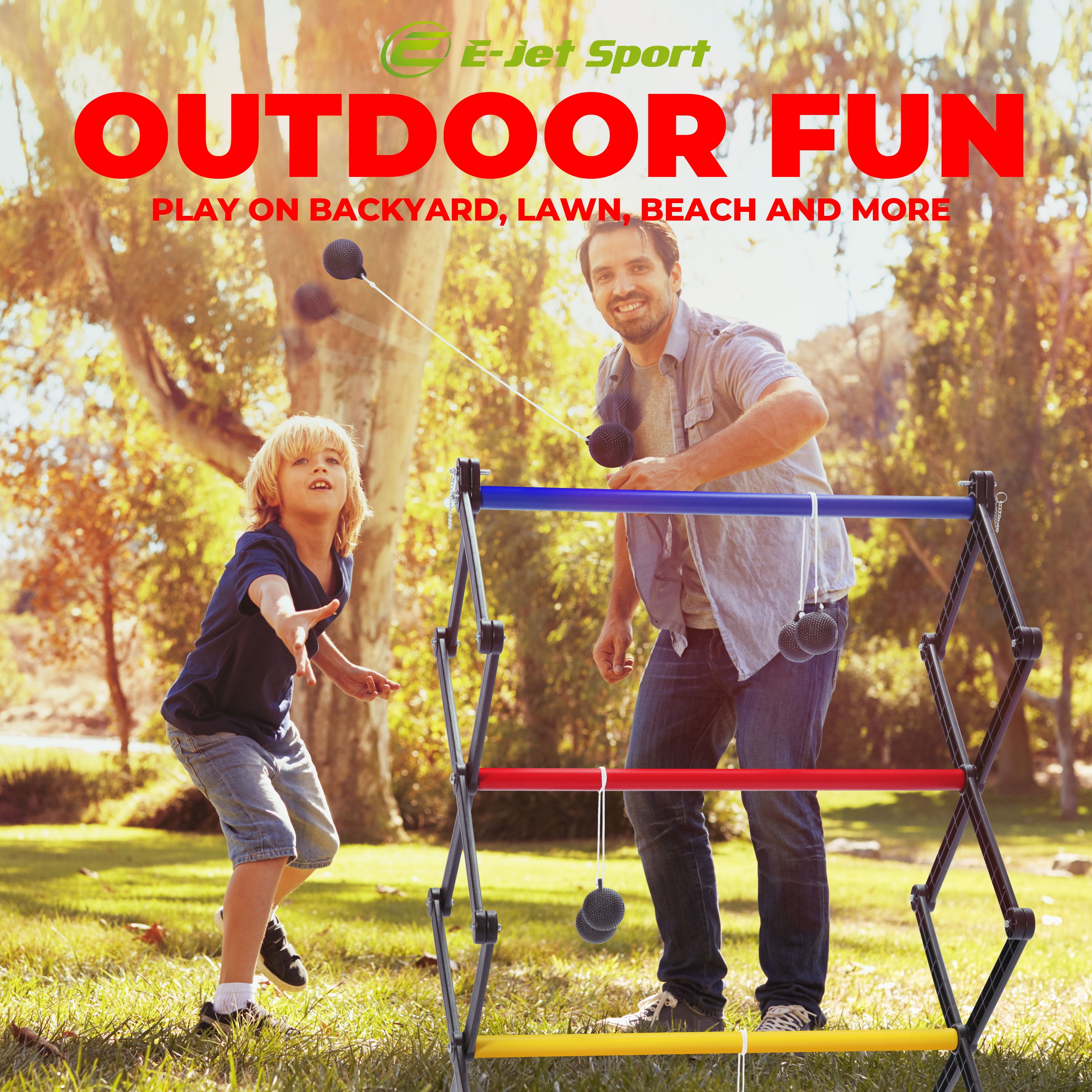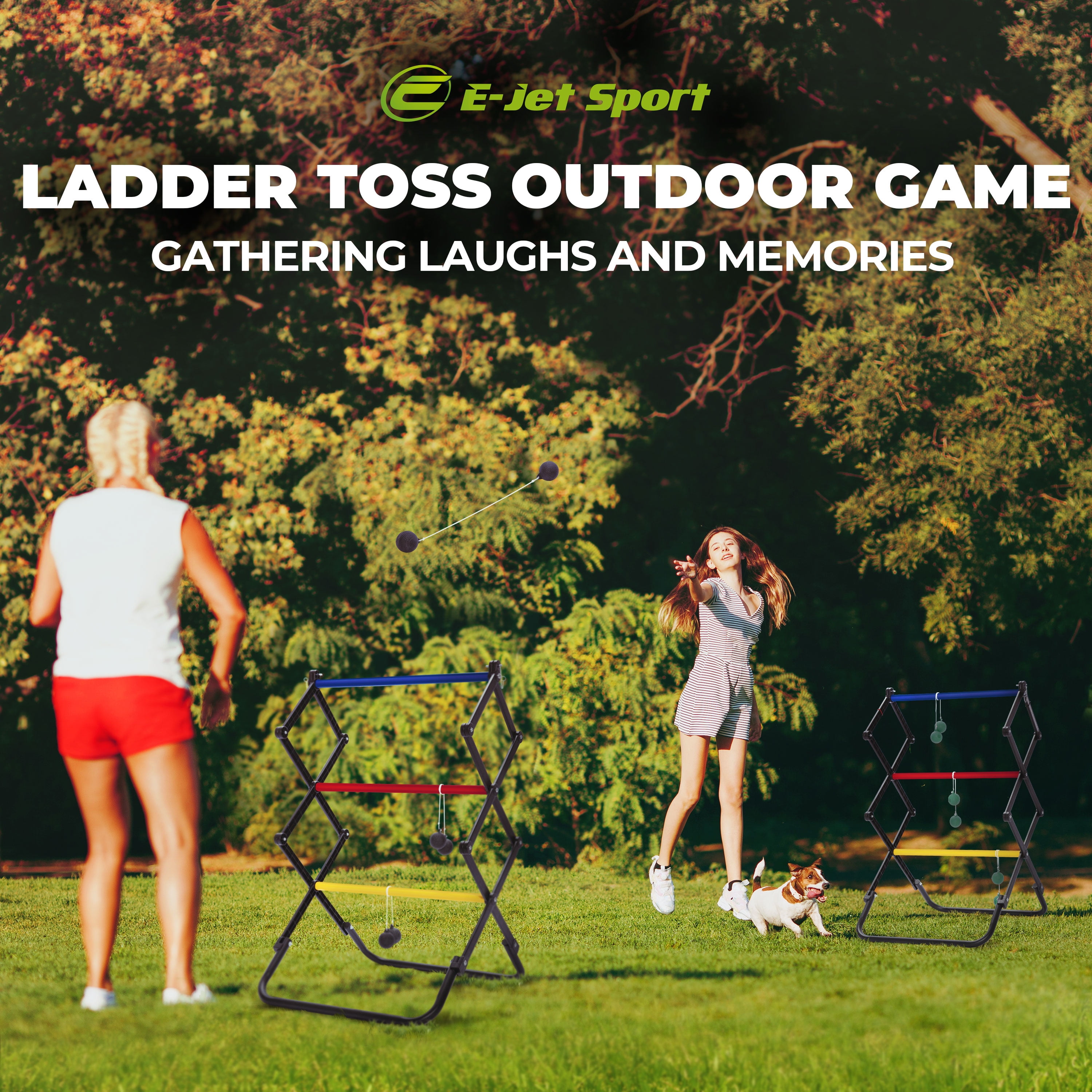 E-Jet Sport Adult Foldable Ladder Ladder Ball Sets, Steel,PVC Black, 11 lb 24.52 E-Jet Sport Adult New Steel PVC 24.52″ Patented foldable structure for quick setup and takedown Set up in less than 10 seconds, allowing for immediate gameplay Constructed with heavy-duty steel and PVC frames for durability Cross leg design enhances stability during play No disassembly required; simply fold and store in the included carrying bag Lightweight and portable, perfect for backyard, park, or beach outings Includes all necessary components: Ladder Toss Frame x 2, Blue Ladder Toss Ball x 3, Red Ladder Toss Ball x 3, Ground Peg x 8, Carrying Bag x 1, and Assembly Instruction x 1 Open size: L24.2 x W24.5 x H39.2 in
