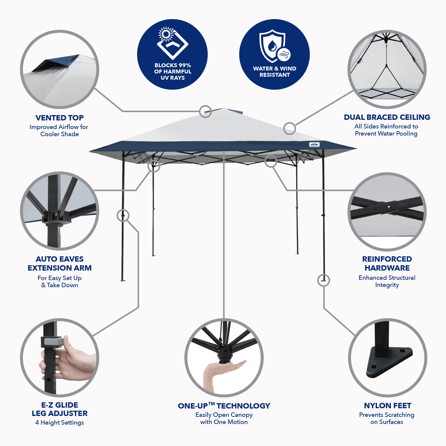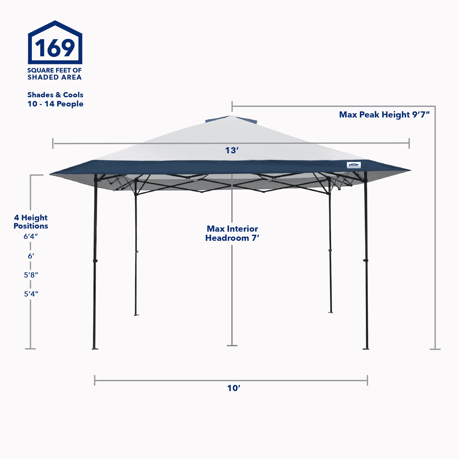 Provides 169 Square Feet of Shade to Protect and Cool 10-14 People ONE-UP™ Technology – Easily Open Canopy in One Motion with 1-2 People Patent Pending Dual Braced Ceiling- Provides Added Support & Strength While Reducing Water Pooling Durable Powder-Coated Steel Frame with Reinforced Hardware for Enhanced Structural Integrity Blocks 99% of Harmful UV Rays for Sun Protection Folds down to 50” and Weighs 48 lbs. E-Z Glide Toggle Leg Adjusters with 4 Height Settings Vented Top for Improved Airflow & Cooler Shade- Water Resistant & Fire Retardant Fabric Dual Zippered Roller Bag for Easy Transport and Storage Stake Kit and Guy-line Ropes Included to Anchor Canopy to Ground Eaves height: 76″ Peak height: 115.5″ Meets CPAI-84 and NFPA-701 Fire-Resistance Codes