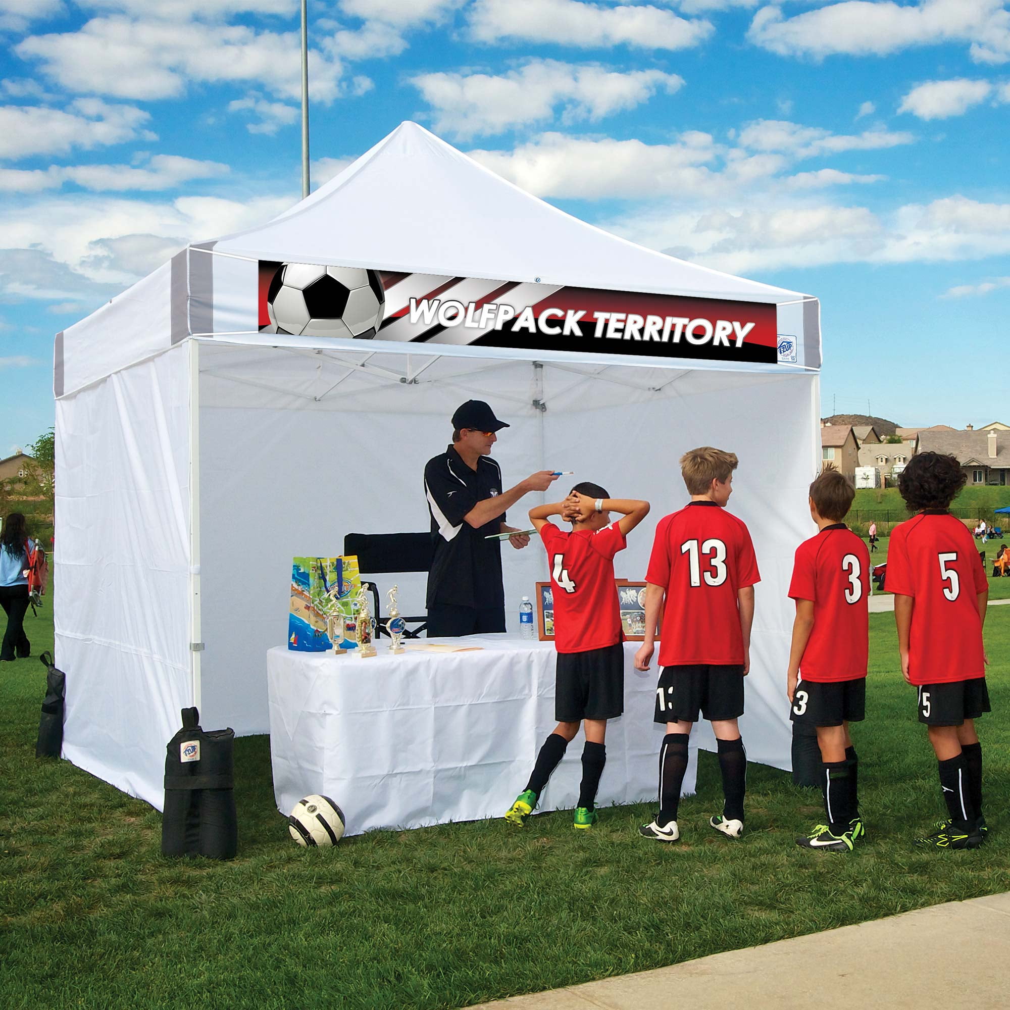 The E-Z UP ES100S™ instant shelter canopy 10′ x 10′ is a completely upgraded package for the small business entrepreneur or local organization. With 100 square feet of shade coverage, there is plenty of room to show off your products and wares in cool style & comfort. The package also features 3 Dura-Lon® Plus Sidewalls and 1 Mid- Zip Dura-Lon® Plus Sidewall to maximize shade, security and privacy. Upgrade your shelter with the All-NEW fully customizable, digitally printed Name Banner Add-On* that easily attaches to the shelter top to start branding your business and stand out from the crowd to draw in more customers. E-Z UP ES100S instant commercial canopy 10′ x 10′ with sidewalls, is a completely upgraded package for the small business entrepreneur or local organization. With 100 square’ of shade coverage, there is plenty of room to show off your products & wares in cool style & comfort. The package also features 3 dura-long plus sidewalls & 1 mid- zip dura-long. Plus sidewall to maximize shade, security & privacy. E-Z UP ES100S instant commercial canopy tent does it all and provides coverage for any business or entertainment need. This shelter is so versatile it could be used for business in the morning and a party at night.
