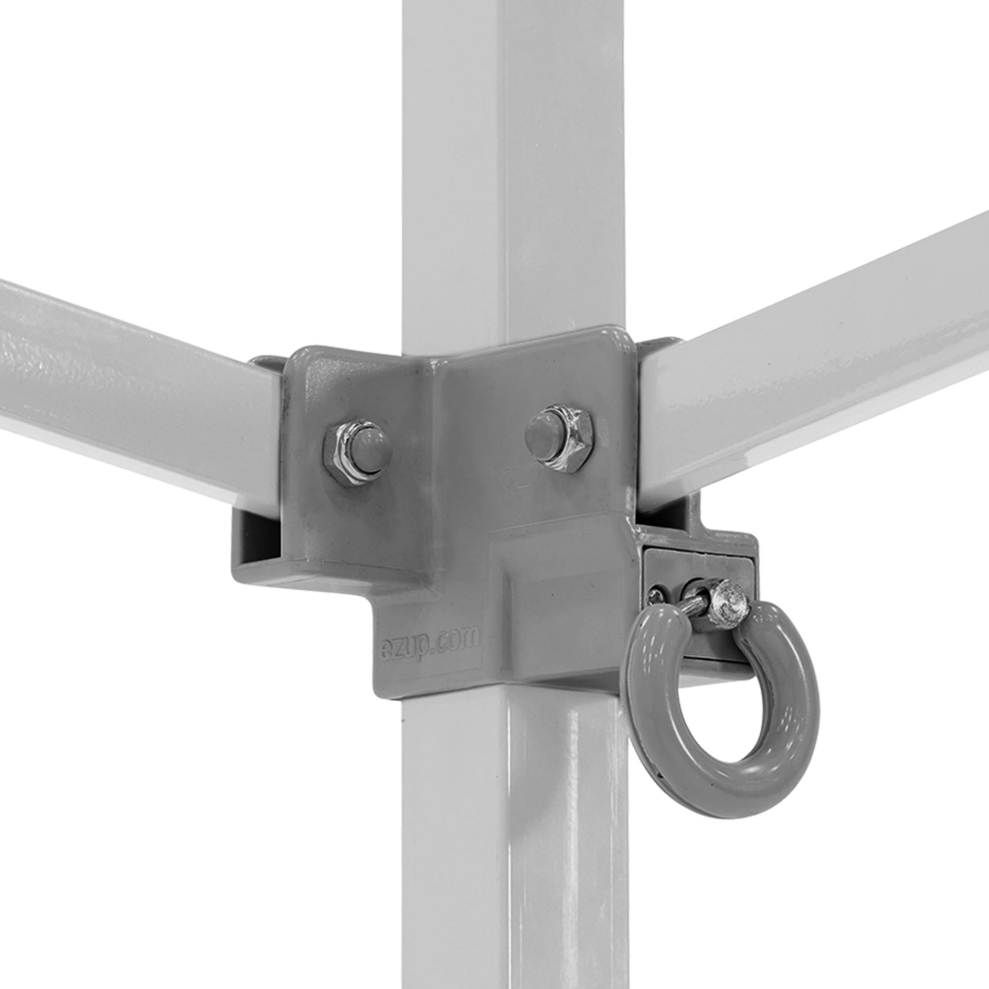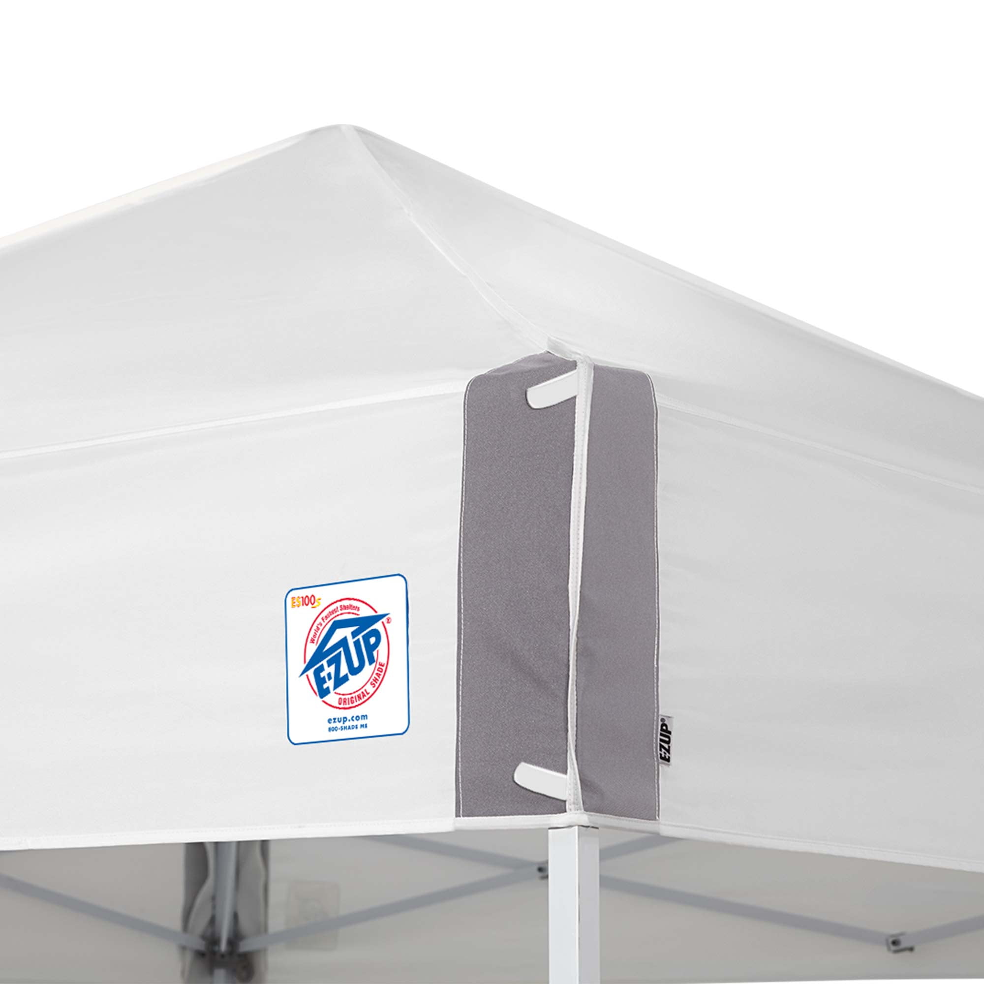 100 Square Feet of Shaded Area E-Z UP ES100S™ instant shelter canopy Includes Shelter, White Powder-Coated Steel Frame, New Commercial Wide-Trax™ Roller Bag with storage pockets for sidewalls. 3 Dura-Lon® Plus Sidewalls, 1 Mid- Zip Dura-Lon® Plus Sidewall & 4 Piece Spike Kit E-Z UP ES100S™ instant shelter canopy includes Upgraded Durable Wide-Trax™ Roller Bag with High Density Wheels and Rubberized Sure-Grip Handles E-Z UP toggle Leg Adjustment: Adjustable legs with 5 height options 4 corner loops pre-installed for (Optional Add-On) Name Banner attachment to the shelter top Bolt On Top: Securely attaches the top to the frame adding more protection & support Three different height settings allow you to pick the height that best suits your needs. Peak Height Options: High 11’5”, Low 10’11”. Valance clearance heights: High 6’10”, Low 6’6″. Meets CPAI-84, NFPA-701 and CAN/ULC-S109 Fire Resistant Requirements Sets up in seconds! 3-year warranty