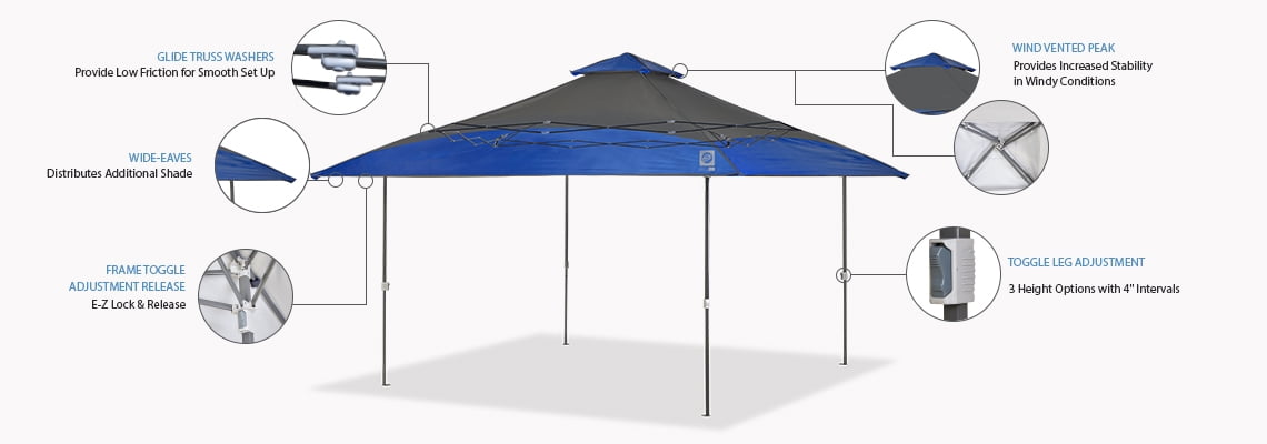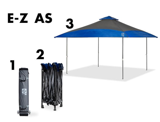 The spectator pop up Shelter provides 169 square Of instant shade. This 13 By 13 foot lightweight canopy sets up in S. This E-Z UP canopy provides extra shade from foldable overhanging eaves & is perfect for a large gathering but collapses small enough to fit in the back of your trunk. This portable Instant shelter is perfect for the sideline, shoreline or park. The spectator shelter also features a vented roof for increased wind resistance & maximum air flow. Maximum coverage The Spectator 13 foot x 13 foot instant canopy E-Z UP shelter offers 169 square feet of shade and coverage. The 13 by 13 offers maximum E-Z UP headroom of 9 feet 7 inches with a maximum interior valance clearance of 6 feet 2 inches. Collapsed size 8. 75 L x 8. 75 W x 48. 5 H. Extra features The spectator offers two very useful features: wide eaves and Wind-vented peak. The wide eaves help to increase the shaded areas by allowing additional areas of the top to overhang the frame. The Wind-vented peak has a dual purpose, It helps to ventilate The interior of the canopy helping to release trapped heat and also provides increased stability in windy conditions by allowing the wind to pass through the vent. Sets up in seconds The E-Z UP canopy shelter product sets up in seconds with no tools required. Just take the fully assembled frame with top out of the roller bag, pull open and extend the legs and you are done. Breakdown is just as easy with the push button toggle leg adjustments and frame toggle adjustment release. Collapse and fold in to place into the wheeled storage bag. Spectator optional equipment includes: Deluxe Stake Kit, E-Z UP Weight Bags and Event Light. Wide-trax roller bag Best in class wheels. The wide-trax high density wheel system is ready for any surface Condition and makes it easy for you to arrive at your destination. Provides an extra wide base for stability over uneven surfaces. The sure-grip large rubberized carry handles adds extra padding for carrying and allows for an easy grip. Heavy-duty zipper for E-Z open & close. Cross stitched Reinforcements at key sewn stress points. Roller bag Dimensions: 9″ L x 9″ W x 49 H. Fire resistant/ 99% UV protection The canopy meets CPAI-84 and nfpa-701 fire resistant requirements as well as offers 99% UV protection. Care instructions: Use a mild soap (not detergent) and plenty of water to clean your E-Z UP top.