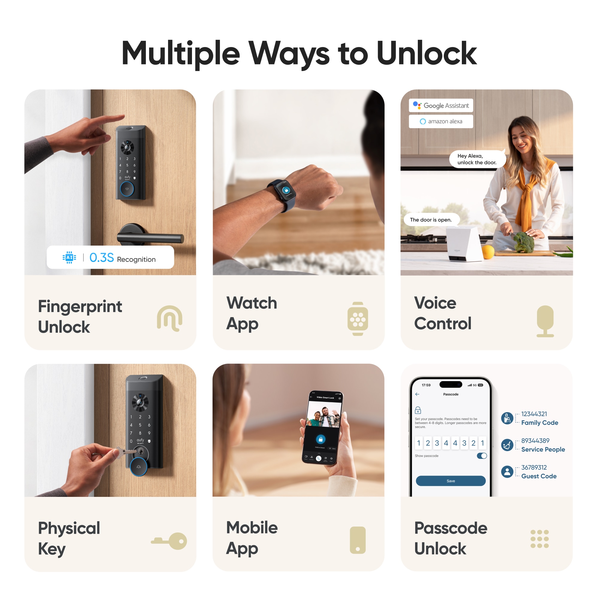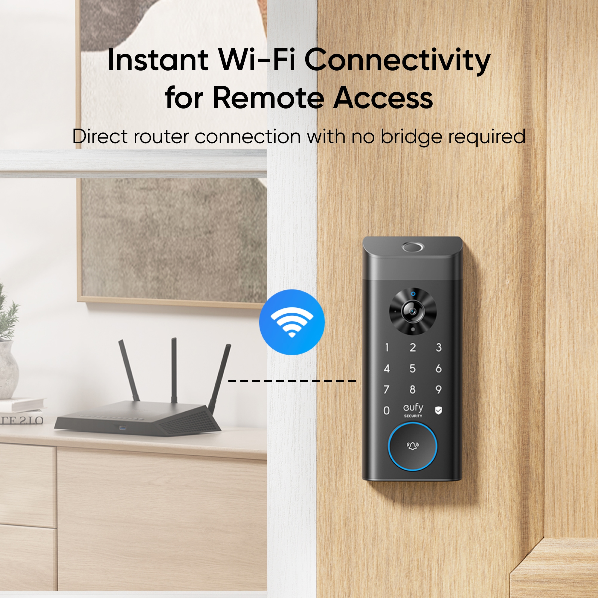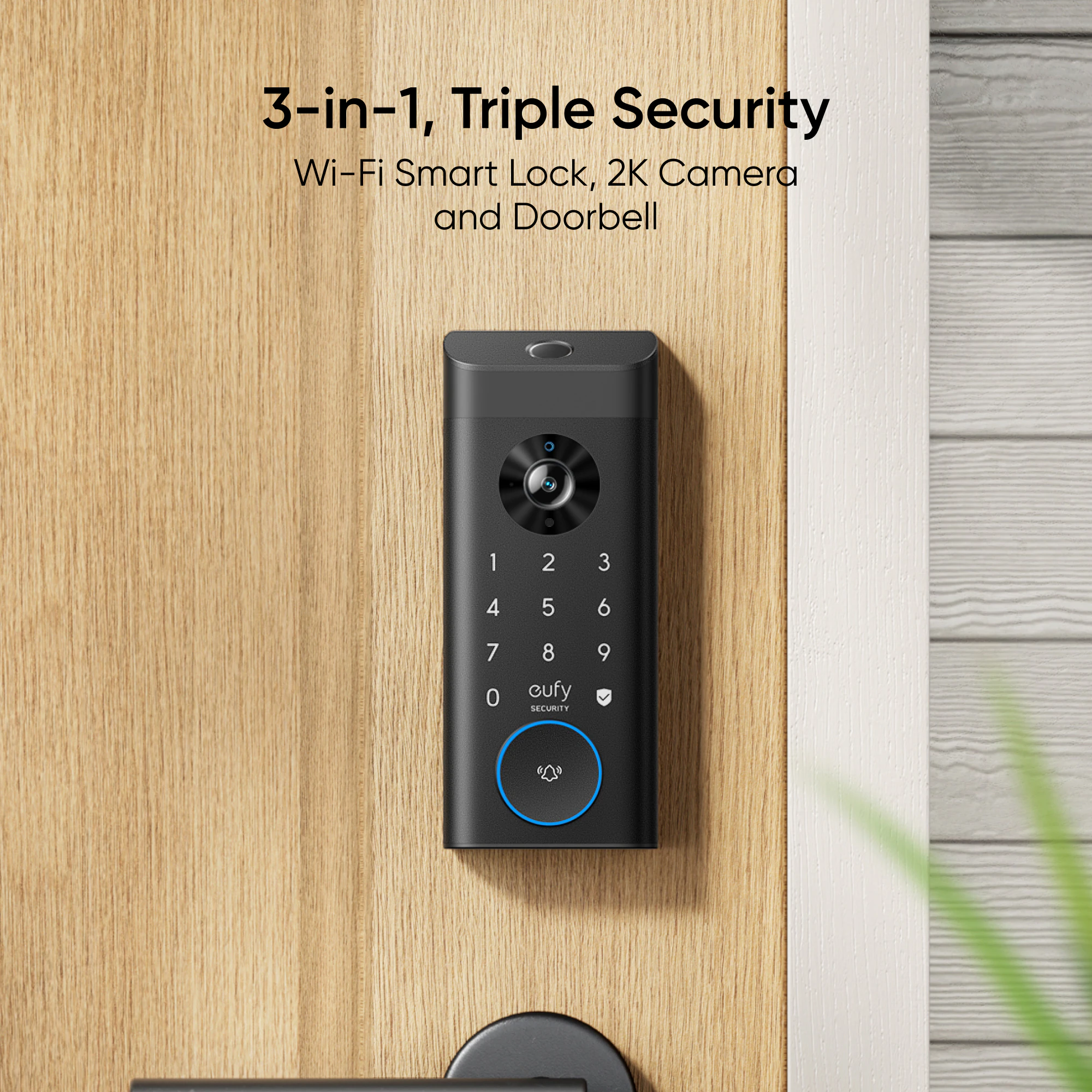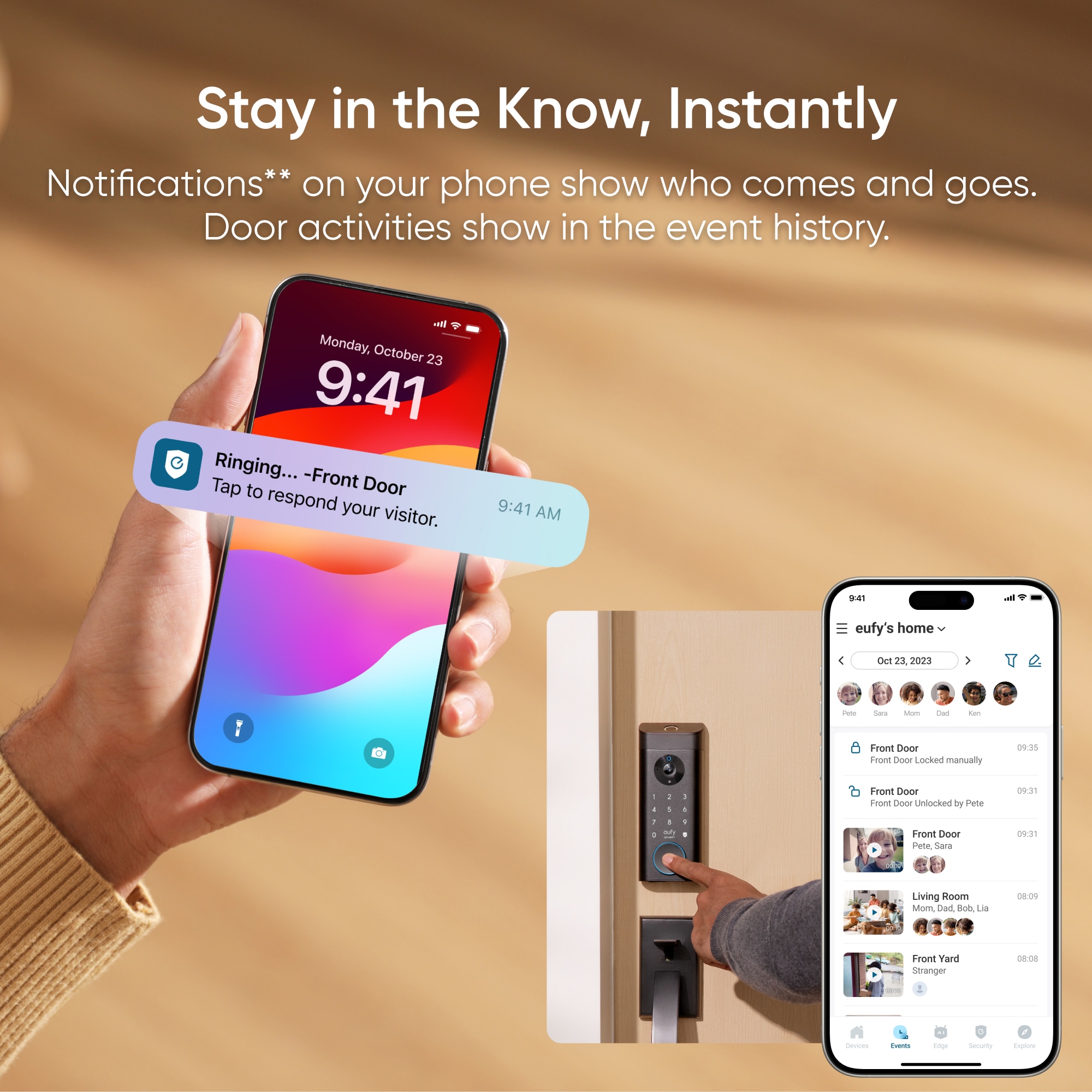 Introducing the Video Smart Lock E330 provides a secure, convenient, and smart home experience. Featuring crystal clear 2K views, even in low-light conditions with its f/1.6 lens. You’ll experience clarity like never before, ensuring every detail is displayed vividly. Dual motion detection accurately senses movement up to 19ft away. Use the eufy Security app to easily manage, create, and delete user profiles (even for guests and visitors), ensuring you’re always in control. Ultra-fast fingerprint recognition takes just 0.4 seconds to unlock your door. Or open the door via the eufy Security app, Alexa or Google Voice Assistant, built-in keypad or included keys. Stay connected with real-time notifications on your phone, showing who’s coming and going as all door activities are logged in the event history for your review.