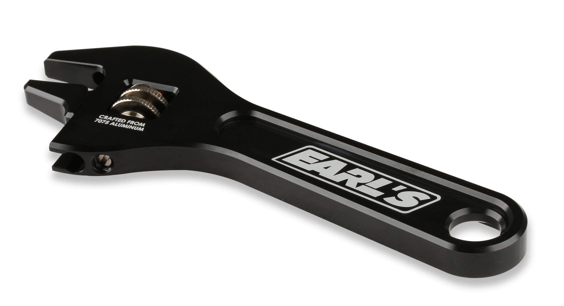 Made of 7075-T351 Military Grade Aluminum to achieve maximum durability while keeping the weight at a minimum Weighs only 5.5 oz. Anodized Black with Steel Nickel knurled adjustment wheel making it attractive and functional Curved Lower jaw and chamfered nose for clearance in tight spots Each component is machined to Earl’s tolerances making for high quality, precise feel and function One Spring & Copper Washer inside of adjustment wheel to maintain correct torque and tension to close up any remaining gaps Attractive Clamshell Packaging – Ideal for Retail Display
