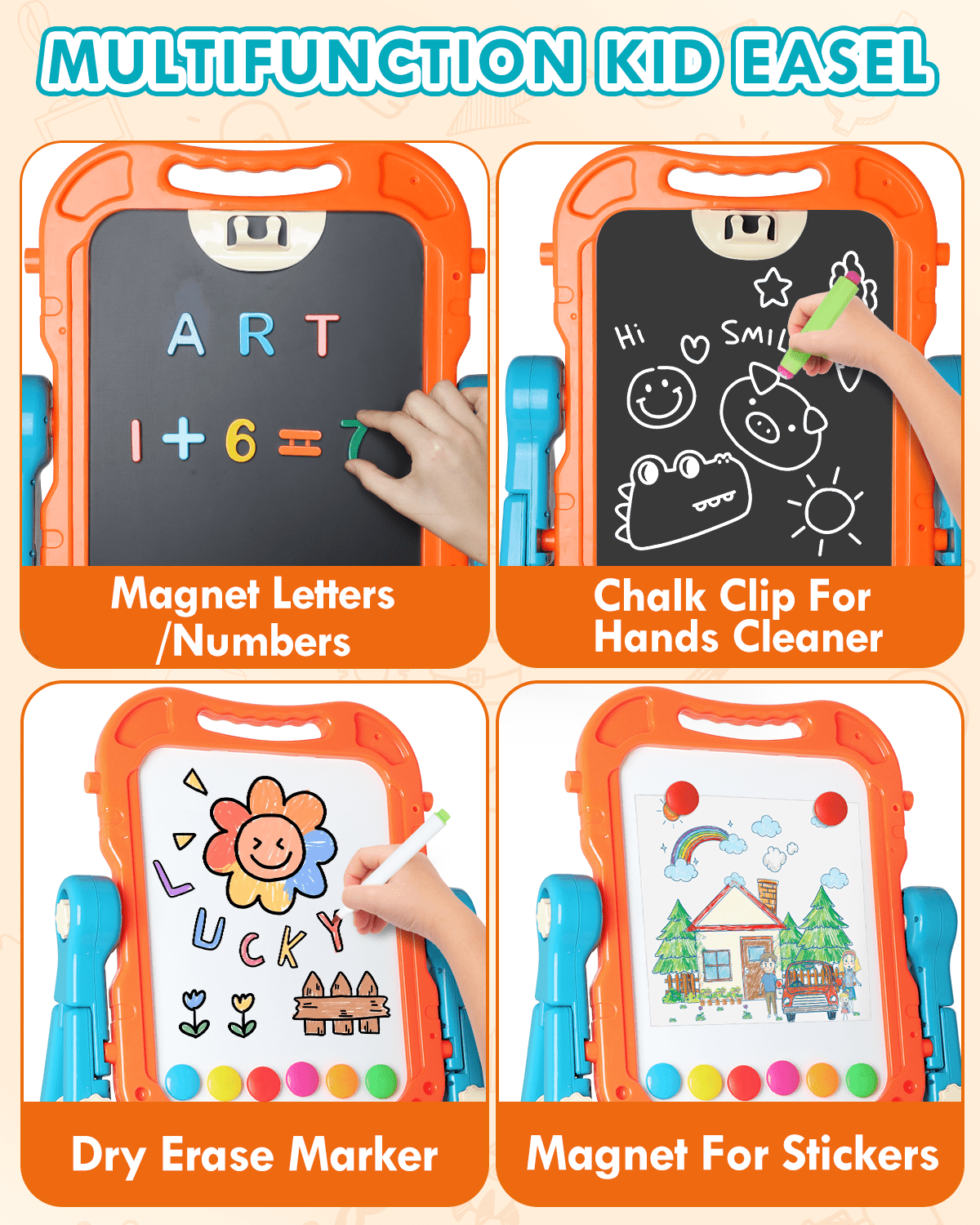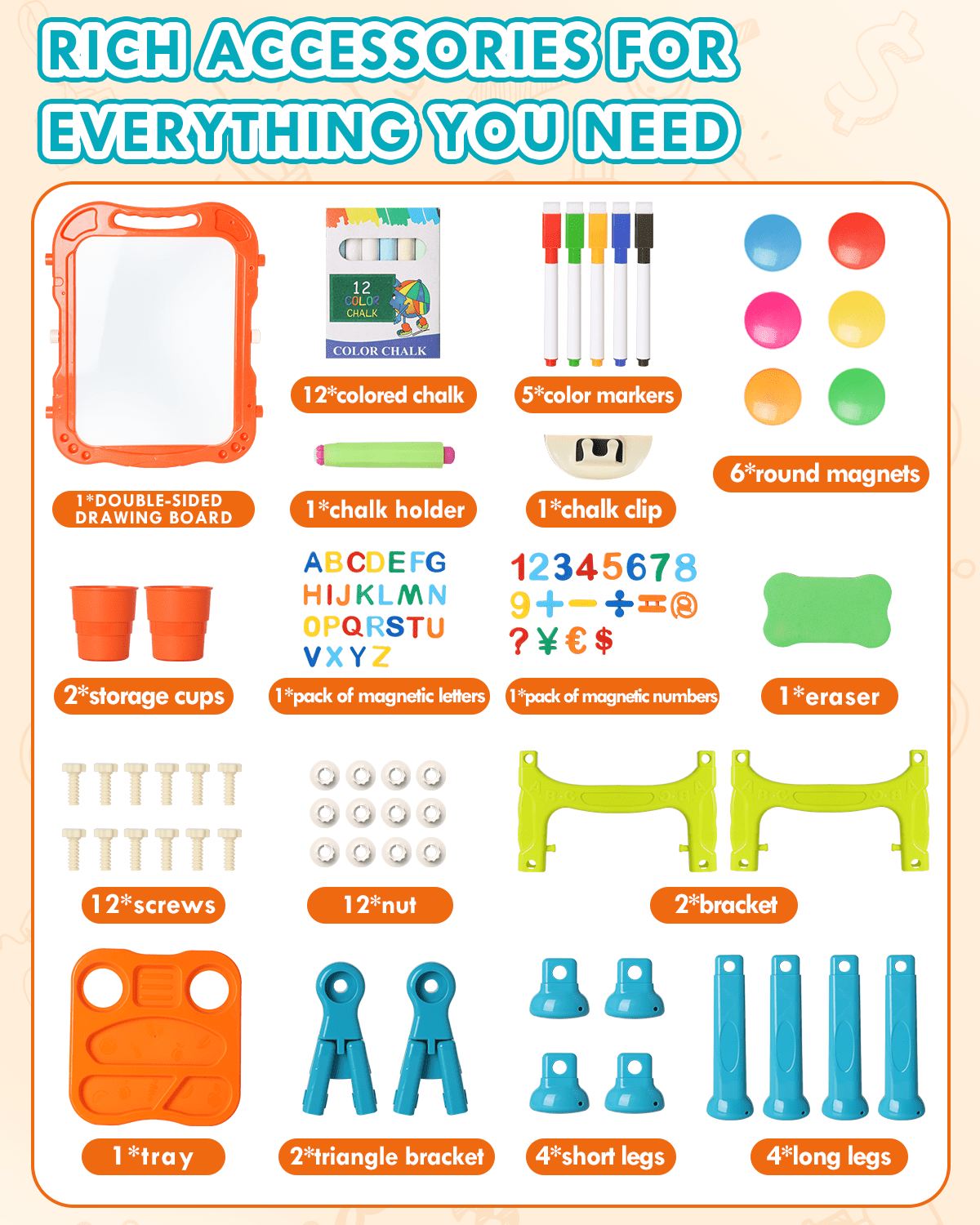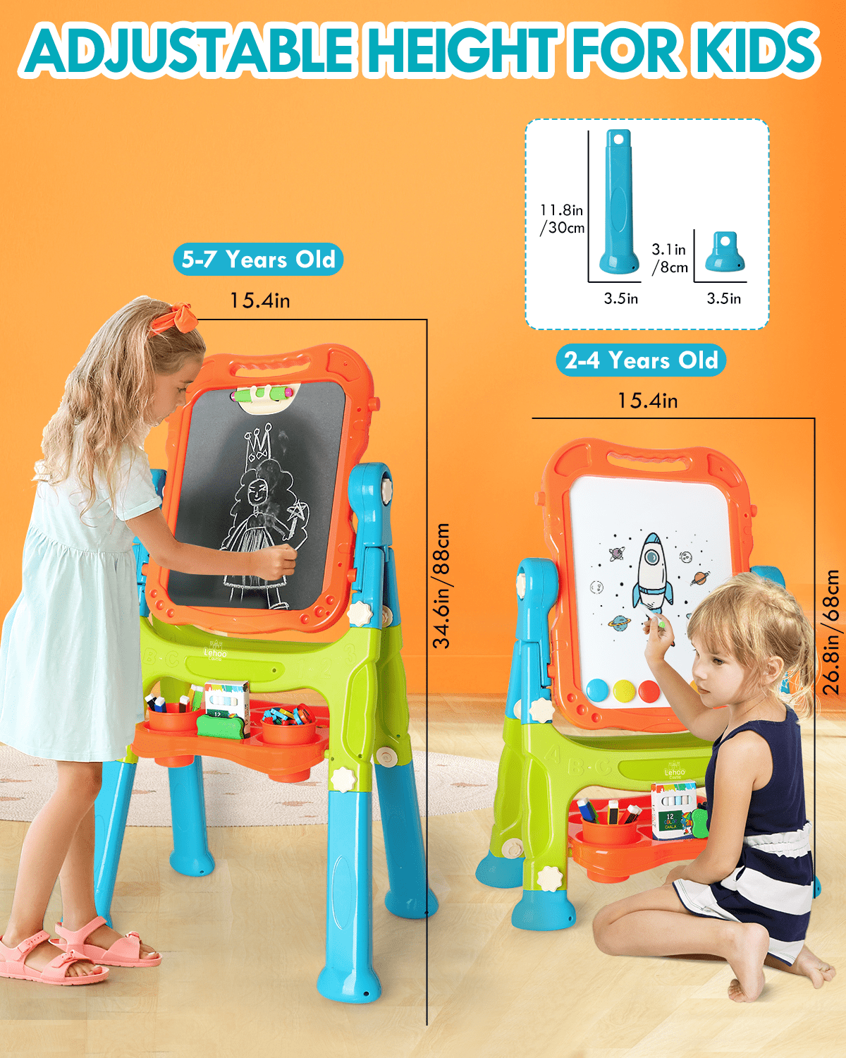 【Adjustable Height】Accommodating young artists as they grow and ensuring comfortable usage for years to come. The 360° reversible drawing board makes it easy to paint and access at any angle. 【With a Double-sided Magnet Board】Kids can enjoy twice the space for their creations, encouraging creativity and exploration from every angle.The easel can also be disassembled into a tabletop easel, which can be placed on the floor or table for drawing. Perfect for indoor or outdoor creations! 【Easy Installation & Removal Make Setup a Breeze】Allowing parents to effortlessly assemble and disassemble the drawing board as needed for convenience and versatility. 【Complete with Rich Painting & Learning Accessories】Including markers, magnetic letters, and shapes, this drawing board offers endless possibilities for artistic expression and educational play. 【Easy to Wipe Clean】Keeping it looking fresh and ready for new masterpieces, while also simplifying maintenance for busy parents. 【Big Tray Storage Space】Big tray to hold all the important accessories handy. Your kids can easily access art supplies through its middle storage area. 【Give the Gift of Creativity & Learning with Our Children’s Drawing Board】A positive addition to any child’s playroom, fostering imagination, artistic skills, and educational development. Specification: Material: Advanced Plastic Product Dimension (Long Legs): 15.4” x 34.6” (L x H) Product Dimension (Short Legs): 15.4” x 26.8” (L x H) Product Weight: 96.6Oz Fit for Kids age Over 2 Years Color: Blue, Green, Purple, Pink