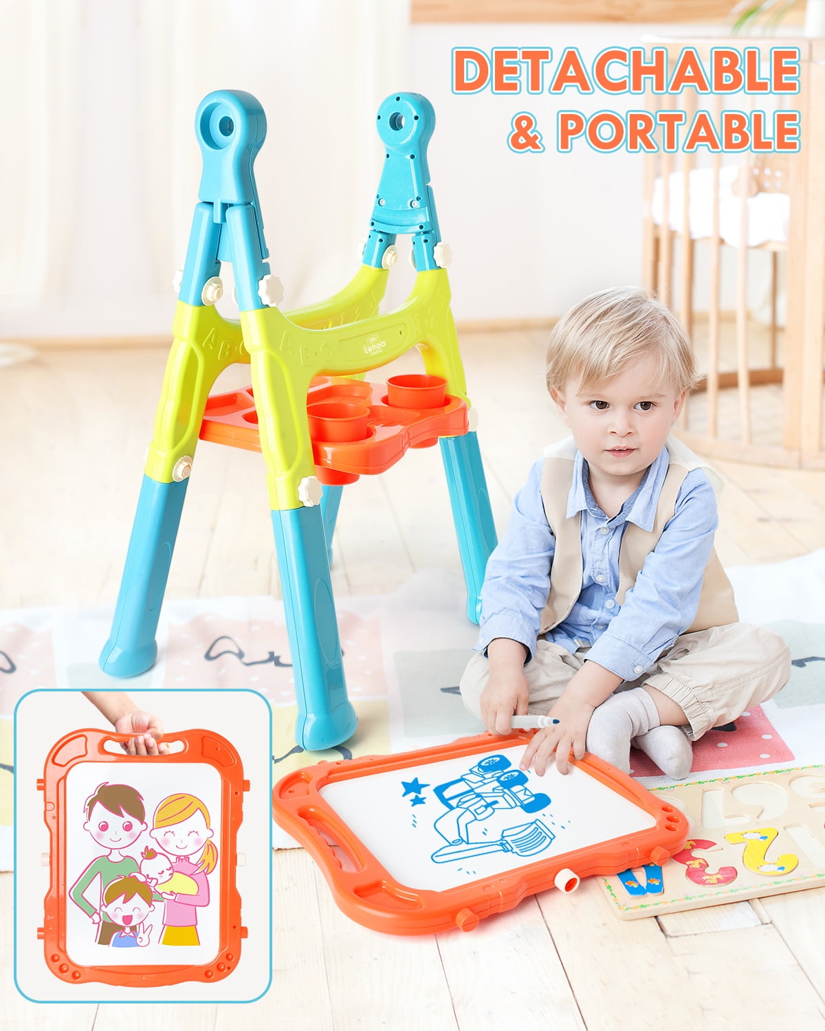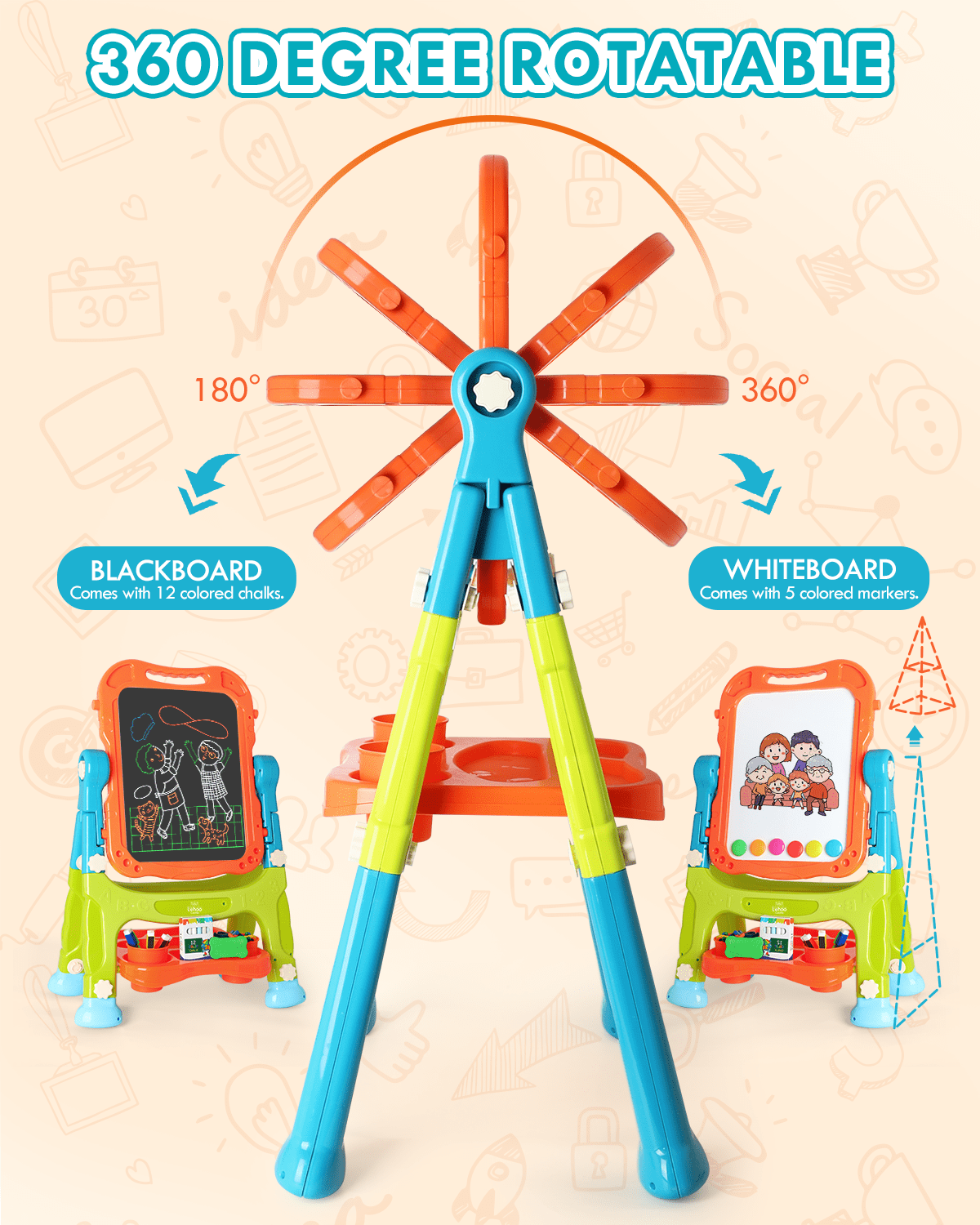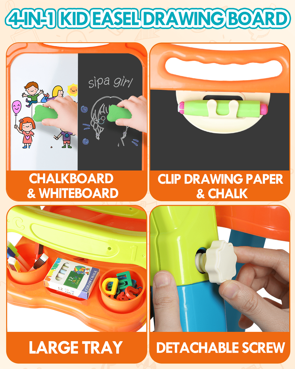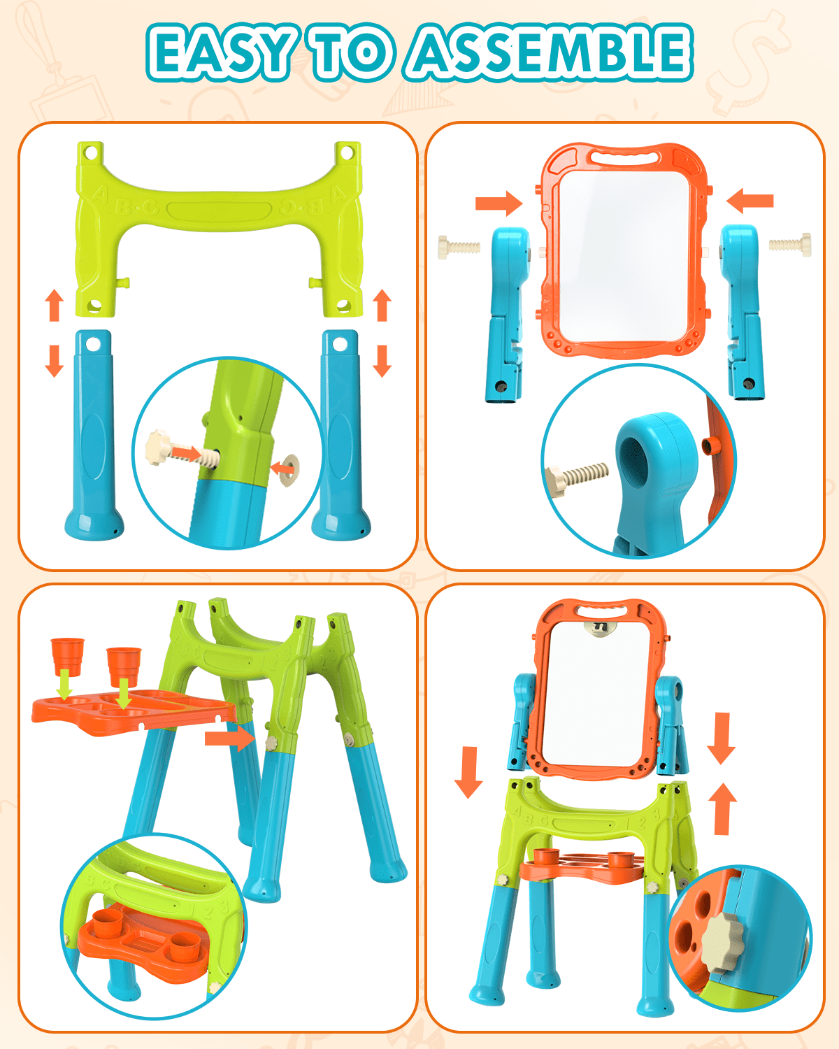 【Adjustable Height】Accommodating young artists as they grow and ensuring comfortable usage for years to come. The 360° reversible drawing board makes it easy to paint and access at any angle. 【With a Double-sided Magnet Board】Kids can enjoy twice the space for their creations, encouraging creativity and exploration from every angle.The easel can also be disassembled into a tabletop easel, which can be placed on the floor or table for drawing. Perfect for indoor or outdoor creations! 【Easy Installation & Removal Make Setup a Breeze】Allowing parents to effortlessly assemble and disassemble the drawing board as needed for convenience and versatility. 【Complete with Rich Painting & Learning Accessories】Including markers, magnetic letters, and shapes, this drawing board offers endless possibilities for artistic expression and educational play. 【Easy to Wipe Clean】Keeping it looking fresh and ready for new masterpieces, while also simplifying maintenance for busy parents. 【Big Tray Storage Space】Big tray to hold all the important accessories handy. Your kids can easily access art supplies through its middle storage area. 【Give the Gift of Creativity & Learning with Our Children’s Drawing Board】A positive addition to any child’s playroom, fostering imagination, artistic skills, and educational development. Specification: Material: Advanced Plastic Product Dimension (Long Legs): 15.4” x 34.6” (L x H) Product Dimension (Short Legs): 15.4” x 26.8” (L x H) Product Weight: 96.6Oz Fit for Kids age Over 2 Years Color: Blue, Green, Purple, Pink