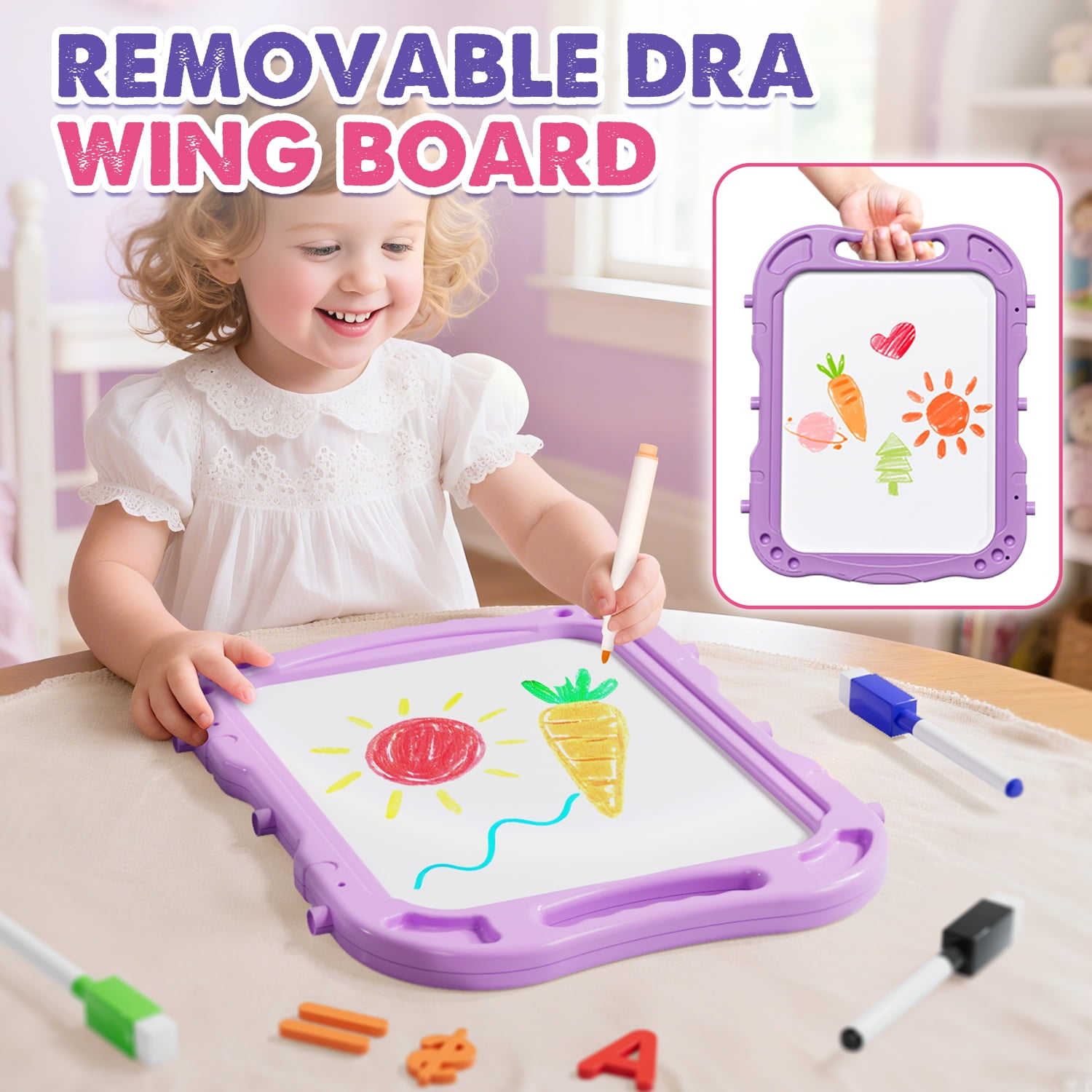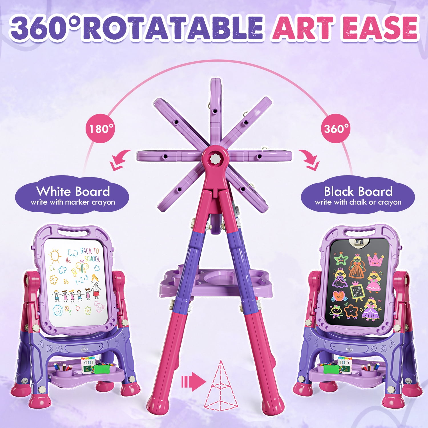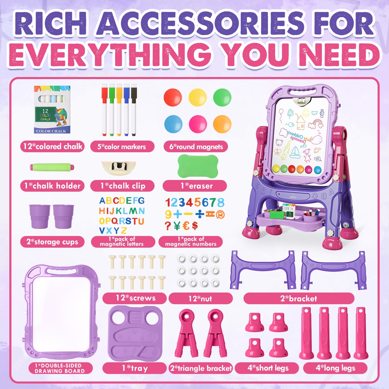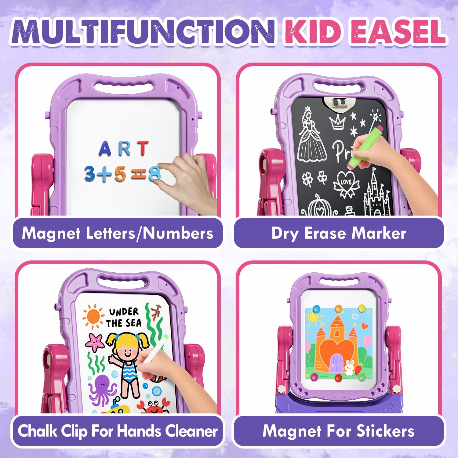Easel for Kids, 4 in 1 Rotatable Double Sided Adjustable Standing Kids Art Easel Drawing Board White Board Chalkboard with Painting Accessories – Purple