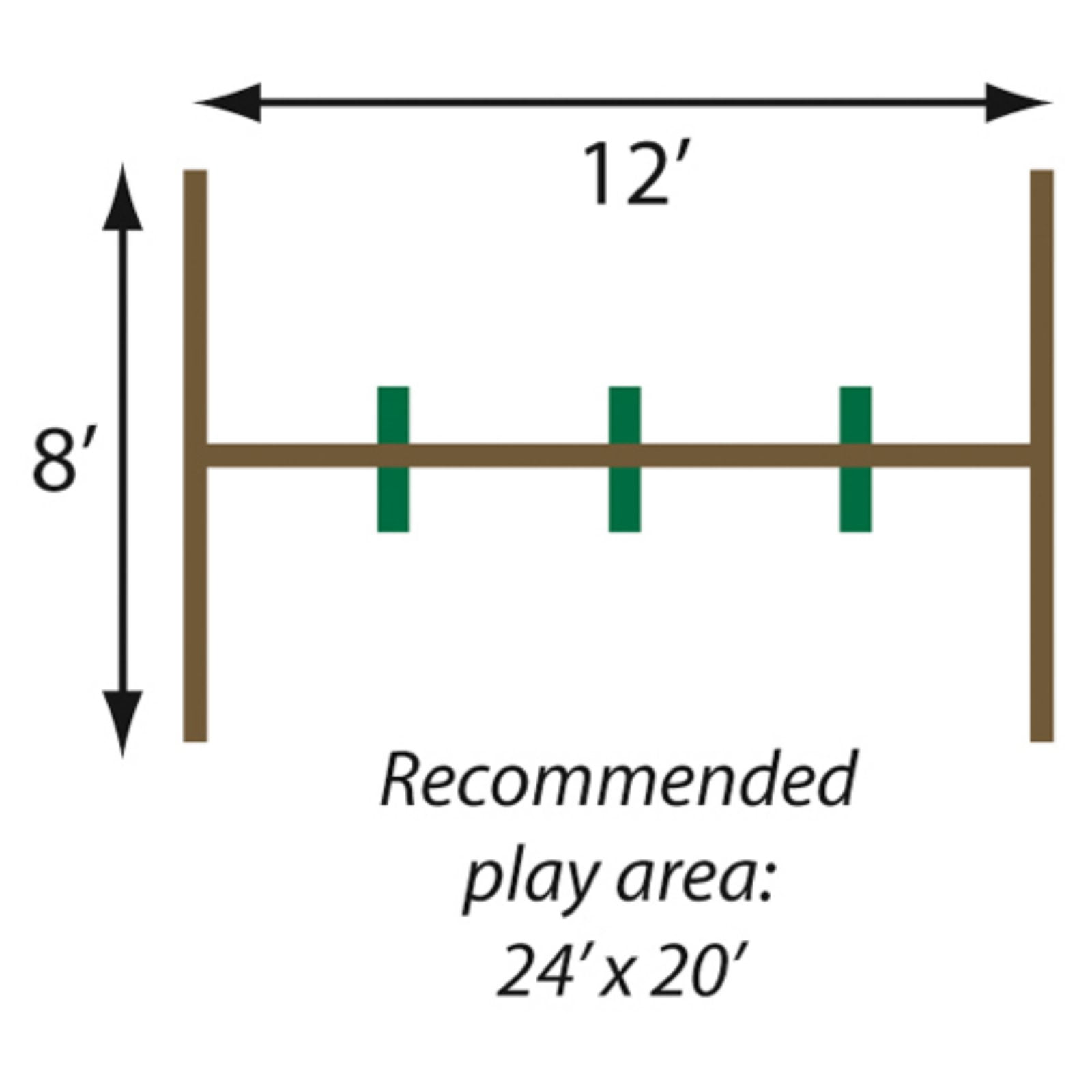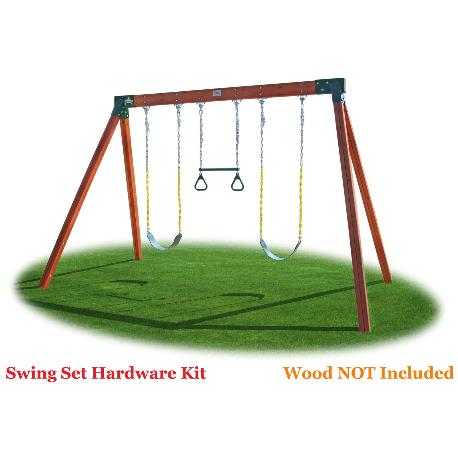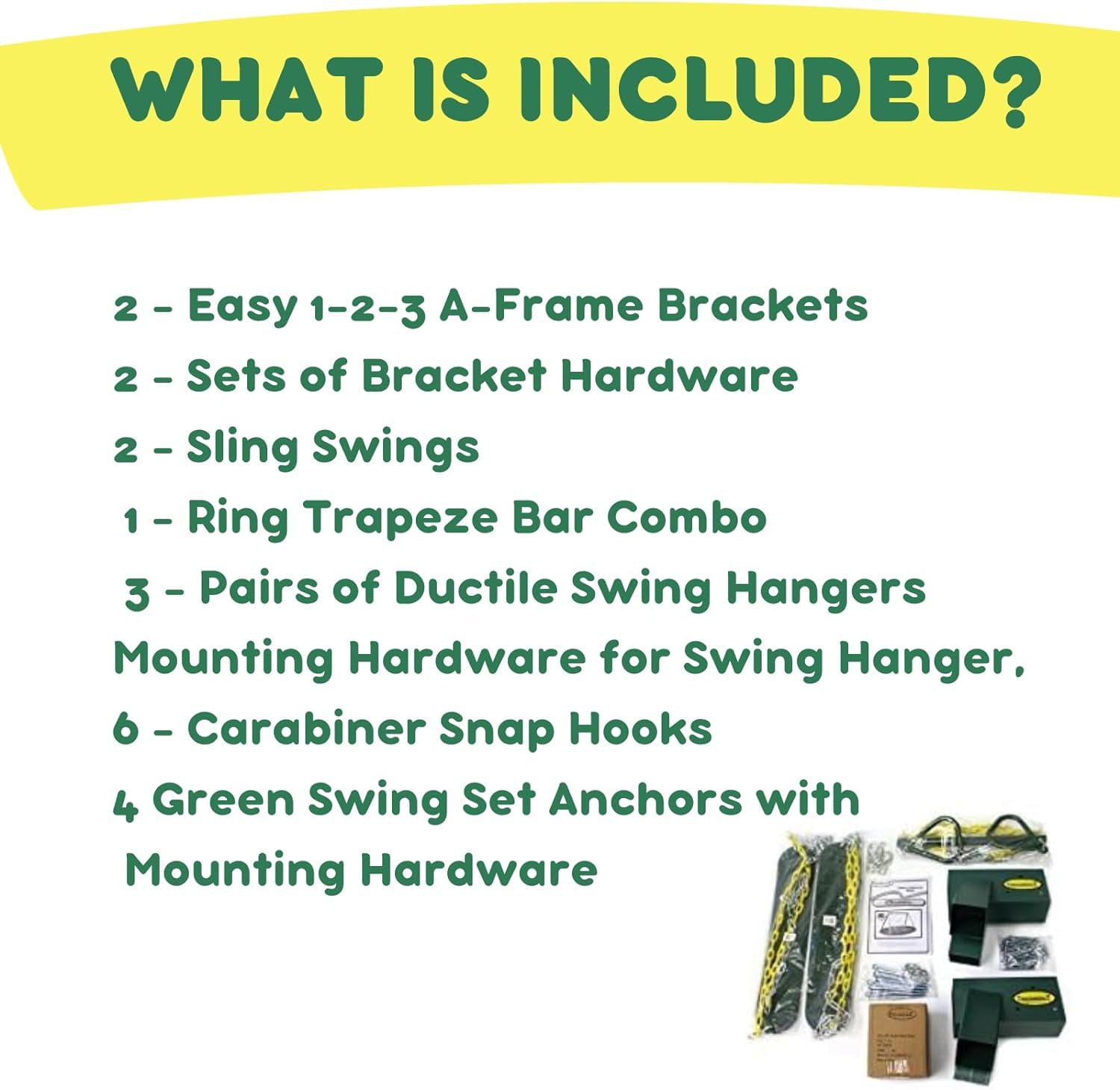 Our Classic A-Frame Swing Set Kit comes complete with everything that you need to construct a free standing swing set with 3 swings All hardware included in this play set kit is high quality and manufactured by Eastern Jungle Gym, your trusted swing set company since 1992 Hardware Kit Includes 2 – Easy 1-2-3 A-Frame Brackets, 2 – Sets of Bracket Hardware, 2 – Sling Swings, 1 – Ring Trapeze Bar Combo, 3 – Pairs of Ductile Swing Hangers, Mounting Hardware for Swing Hangers, 6 – Carabiner Snap Hooks and 4 Green Swing Set Anchors with Mounting Hardware (not pictured) Building a free standing backyard swing set has never been easier! Our Easy 1-2-3 Swing Set Brackets make building a play set a hassle-free project. Don’t worry about measuring angles and cutting wood, our brackets allow you to simply slide the wood into the bracket and screw in the lag bolts. You won’t belive how quick and easy it is to build your swing set! Wood is not included in this DIY kit. We recommend using one 4×6 – 114” top beam and four 96” 4×4 side support legs to build a swing set with the complete dimensions of approximately 12’L x 8’D x 7’8″H.