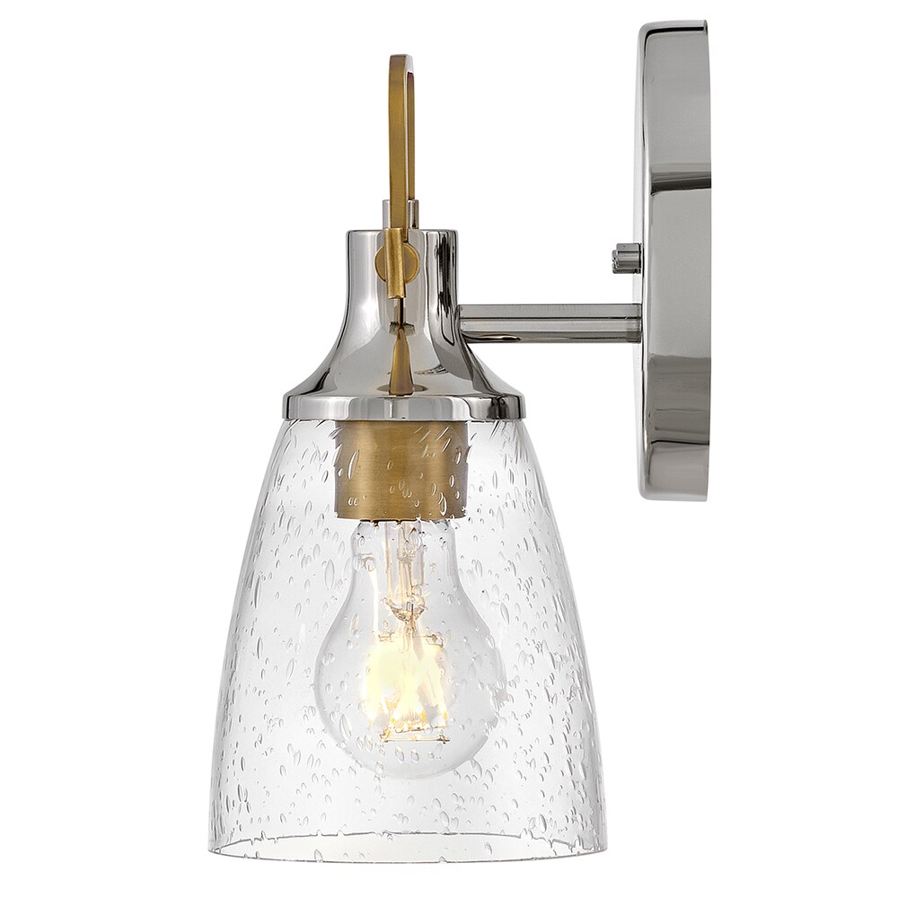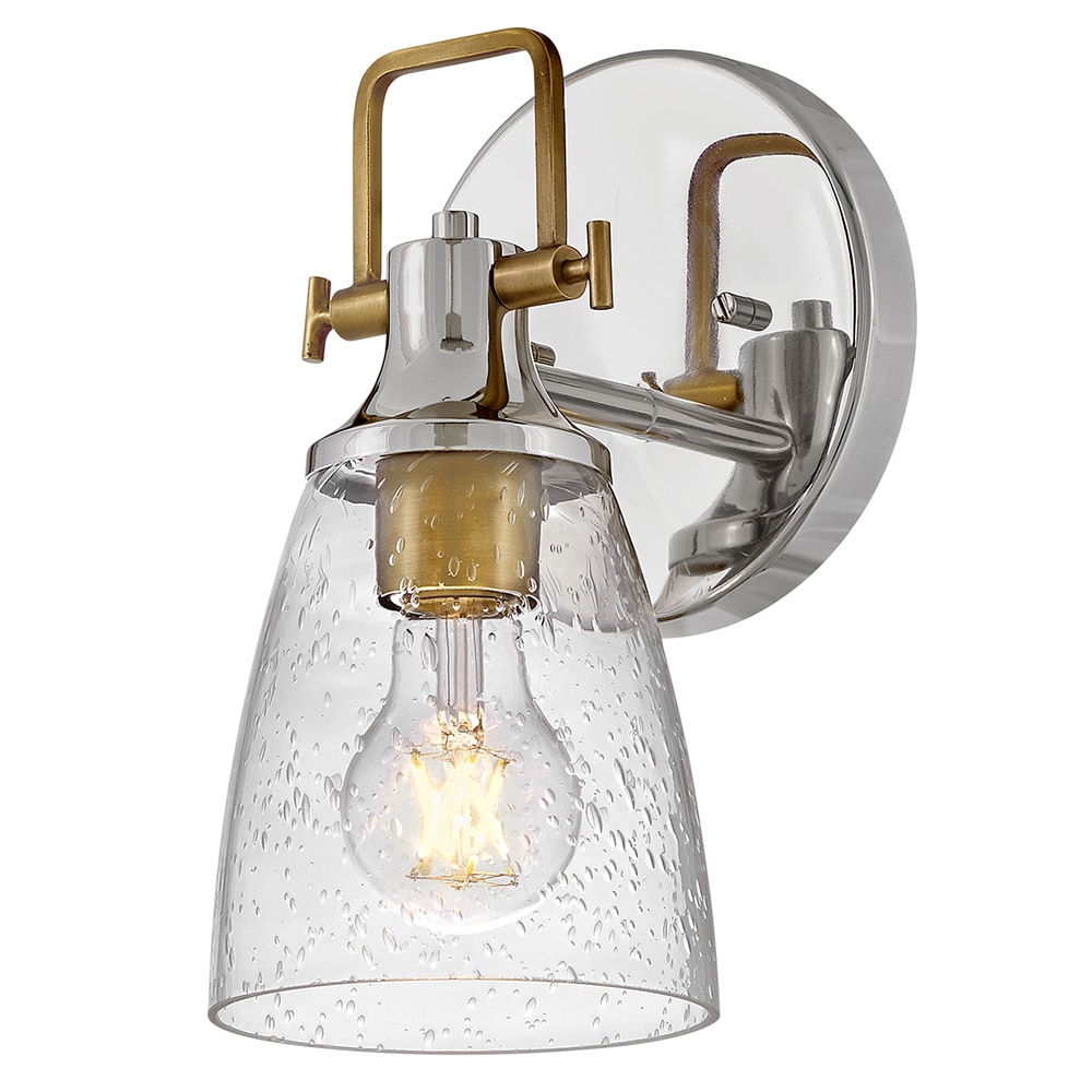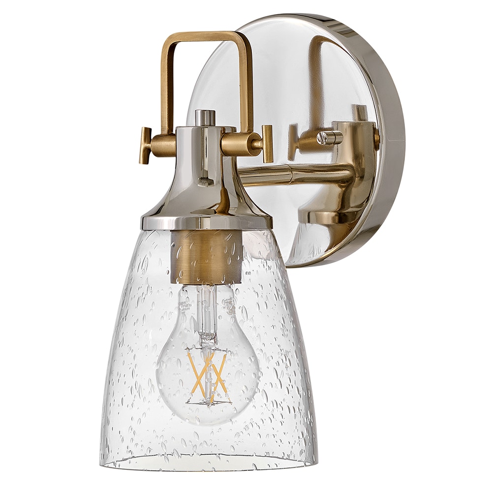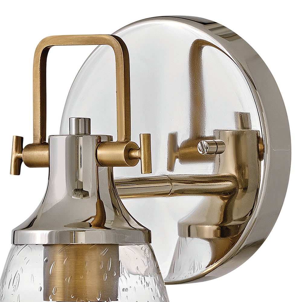 Hinkley’s Easton Single Light Bath Vanity Fixture’s Modern Industrial accents and elements add depth and contrast to bathrooms, en suites, and powder rooms. Hidden mounting hardware ensures a smooth installation either up or down. In a popular two-toned finish, the Polished Nickel backplate and shade fitter with Heritage Brass top yoke, vintage-inspired knobs, and a robust socket can complement different aspects of the space. The bell-shaped Clear Seedy Glass shade diffuses the light for a soft glow.