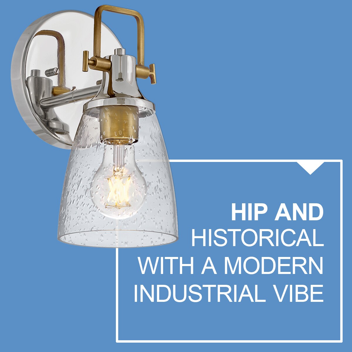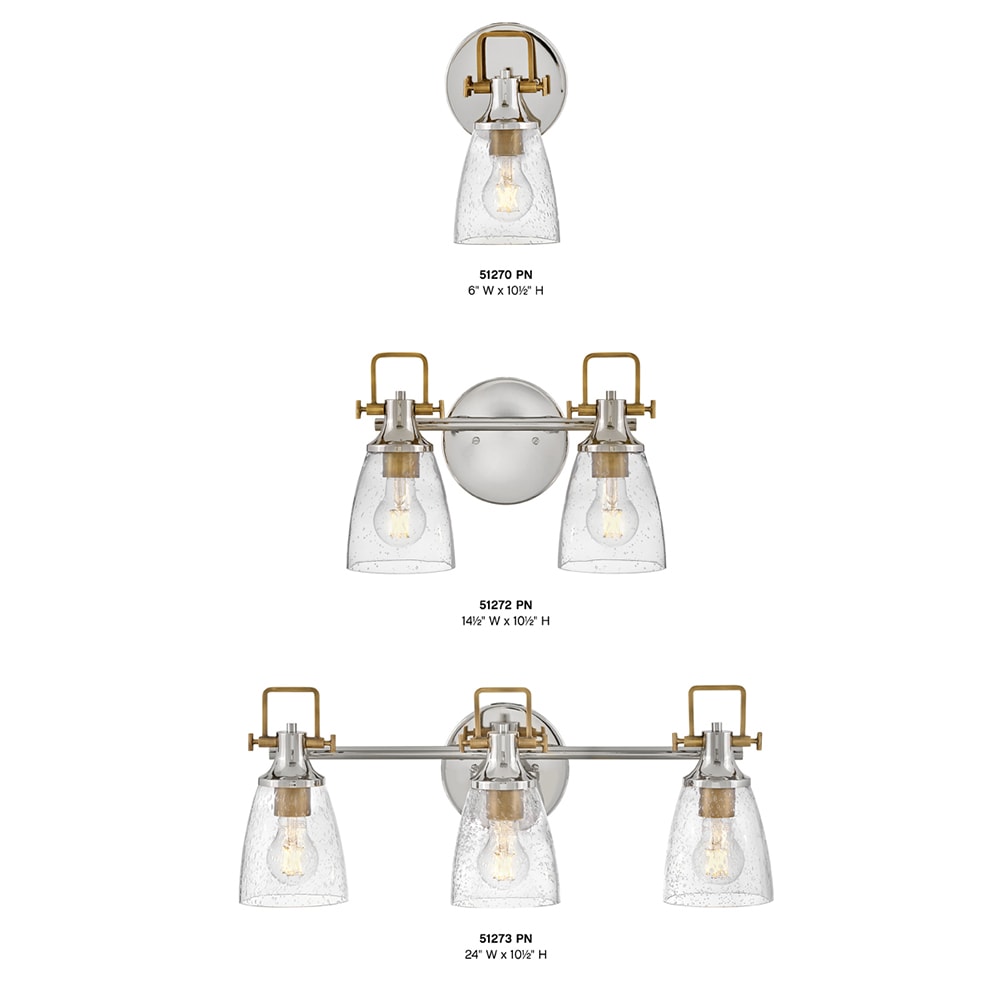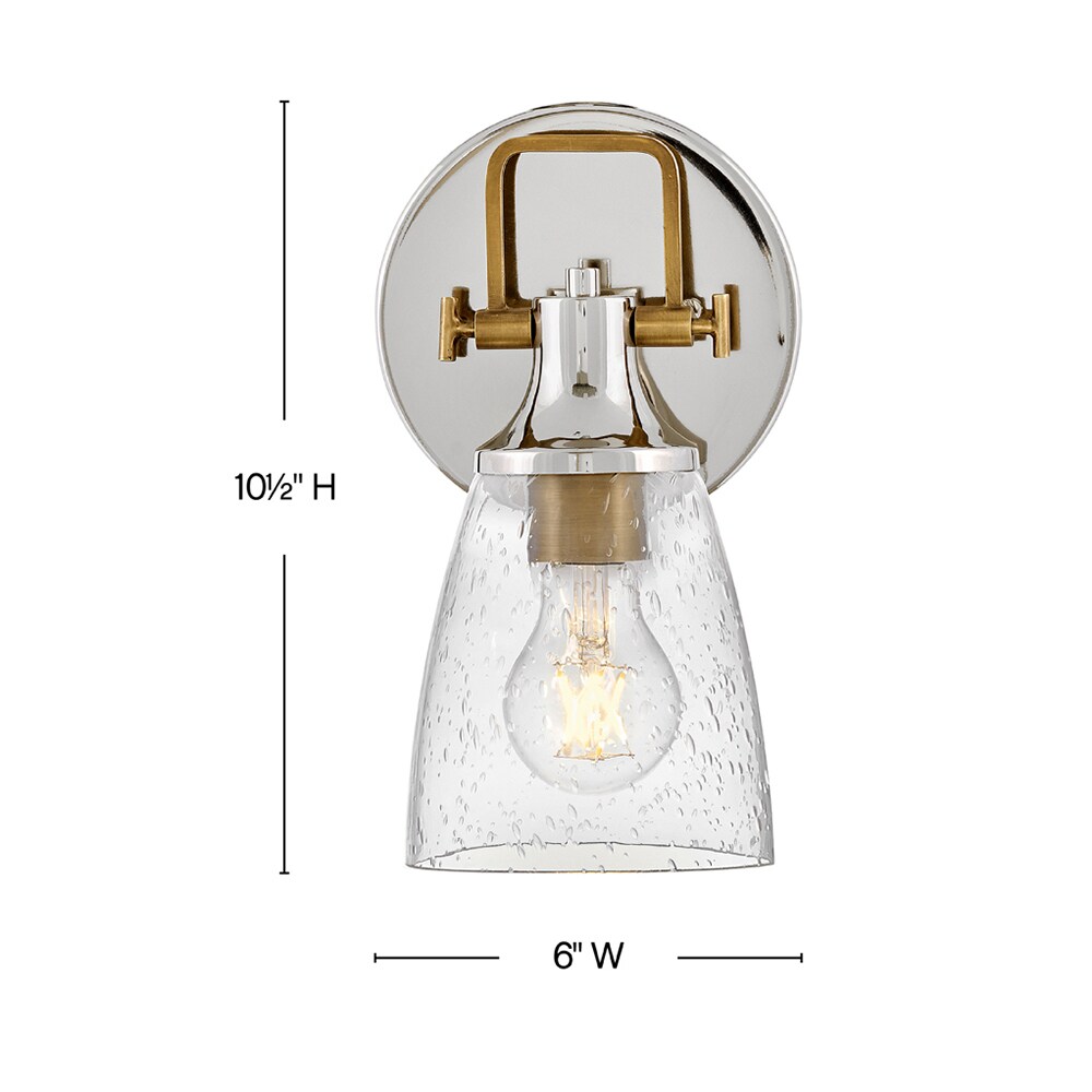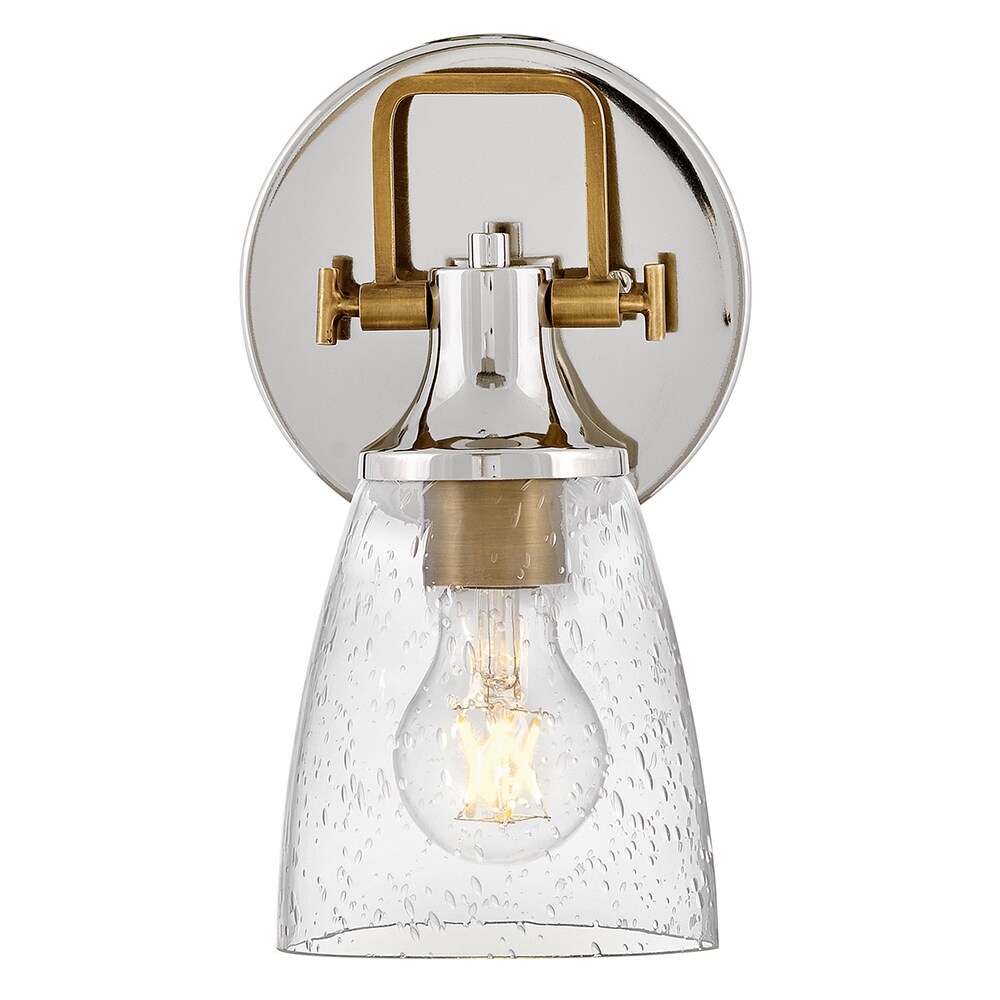 Hinkley’s Easton Single Light Bath Vanity Fixture’s Modern Industrial accents and elements add depth and contrast to bathrooms, en suites, and powder rooms. Hidden mounting hardware ensures a smooth installation either up or down. In a popular two-toned finish, the Polished Nickel backplate and shade fitter with Heritage Brass top yoke, vintage-inspired knobs, and a robust socket can complement different aspects of the space. The bell-shaped Clear Seedy Glass shade diffuses the light for a soft glow.