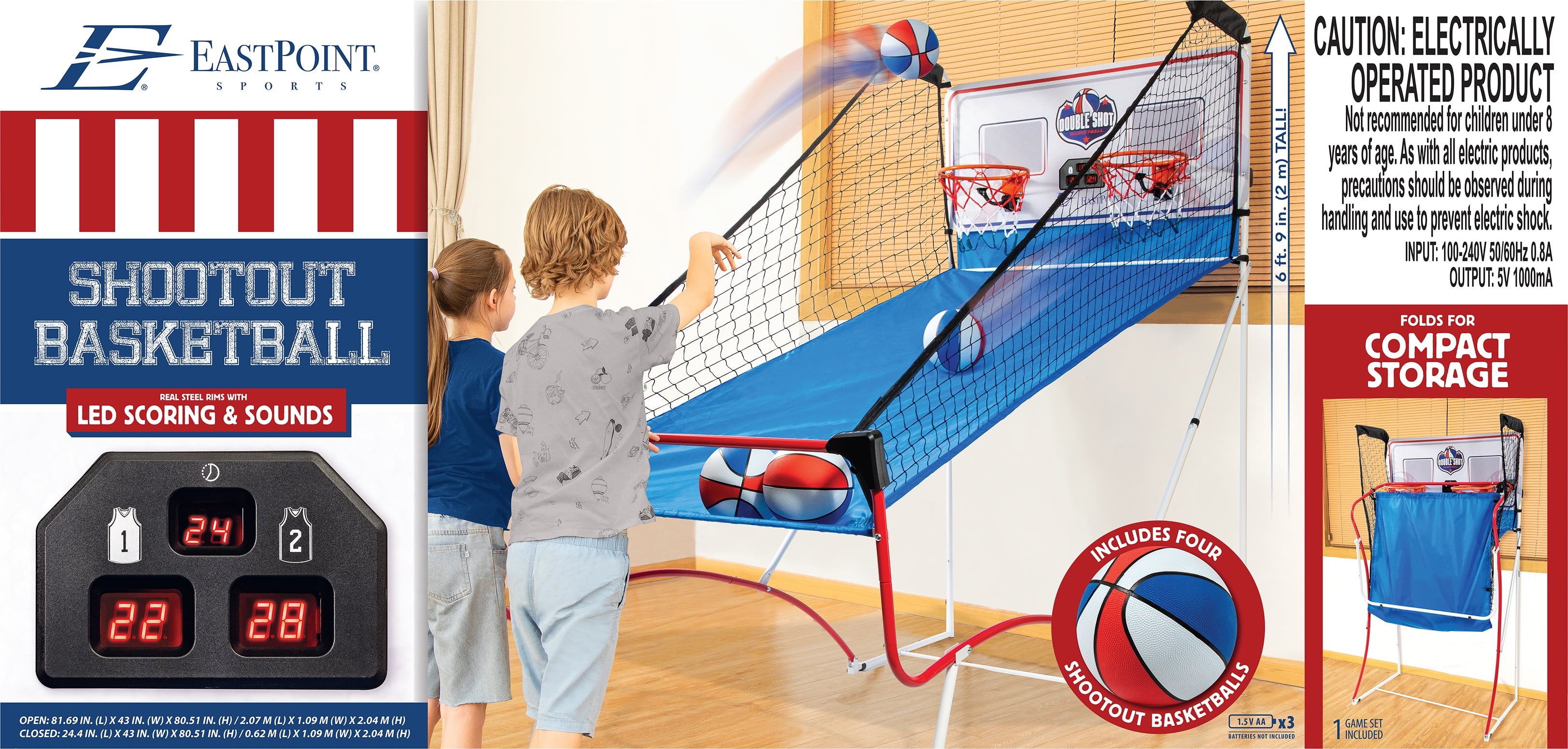 Dynamic 2-Player Action: Engage in thrilling head-to-head basketball showdowns with the EastPoint Shootout Arcade Basketball Game, designed for intense and competitive play between two players. Robust Folding Frame: Built for longevity and easy storage, the durable folding steel frame ensures a sturdy and stable gaming experience while allowing convenient closure for compact storage when not in use. Arcade-Quality Basketball: Experience the authentic feel of arcade basketball with the included (4) 5” rubber arcade basketballs, perfect for showcasing your skills and shooting precision. Interactive LED Scoreboard: Immerse yourself in the game with the LED scoreboard featuring stadium sounds, creating a realistic and exciting atmosphere. Choose from four game modes to keep the competition fierce and engaging. Versatile Dimensions: Whether fully open for gameplay at 80.5 inches (H) x 81 inches (L) x 43 inches (W) or neatly closed for storage at 24 inches (L) x 43 inches (W) x 80.5 inches (H), the EastPoint Shootout adapts to your space, offering both convenience and entertainment.