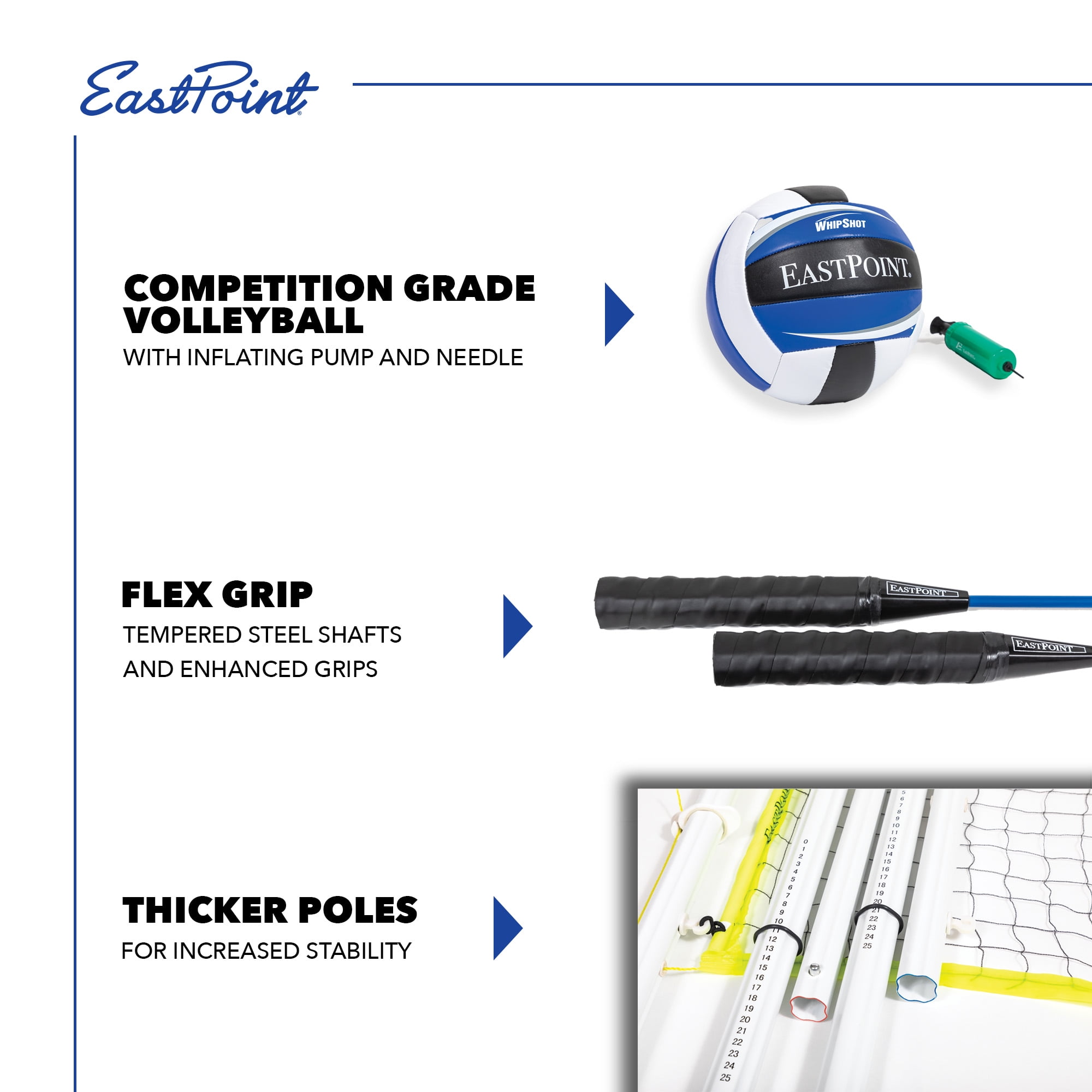 Versatile 2-in-1 Set: Transition seamlessly between volleyball and badminton with the EastPoint 2-in-1 Premium Volleyball/Badminton Set, offering the flexibility to enjoy both sports in one complete package. Enhanced Durability: Featuring stronger, sturdier poles measuring 1.5 inches thick, this set is built to withstand intense play sessions, ensuring long-lasting durability and reliability. Adjustable Height Net: The adjustable net height allows for standard volleyball play at 85 inches and official badminton play at 61 inches, accommodating players of all skill levels and preferences. Fast Setup and Storage: Enjoy quick assembly, takedown, and storage with the fast setup net system, providing convenience and ease of use for weekend warriors and enthusiasts alike. Complete Set: Includes everything you need for a competitive game, including competition-grade volleyball and pump, 4 badminton rackets with tempered steel shafts and enhanced grips, and 2 shuttlecocks