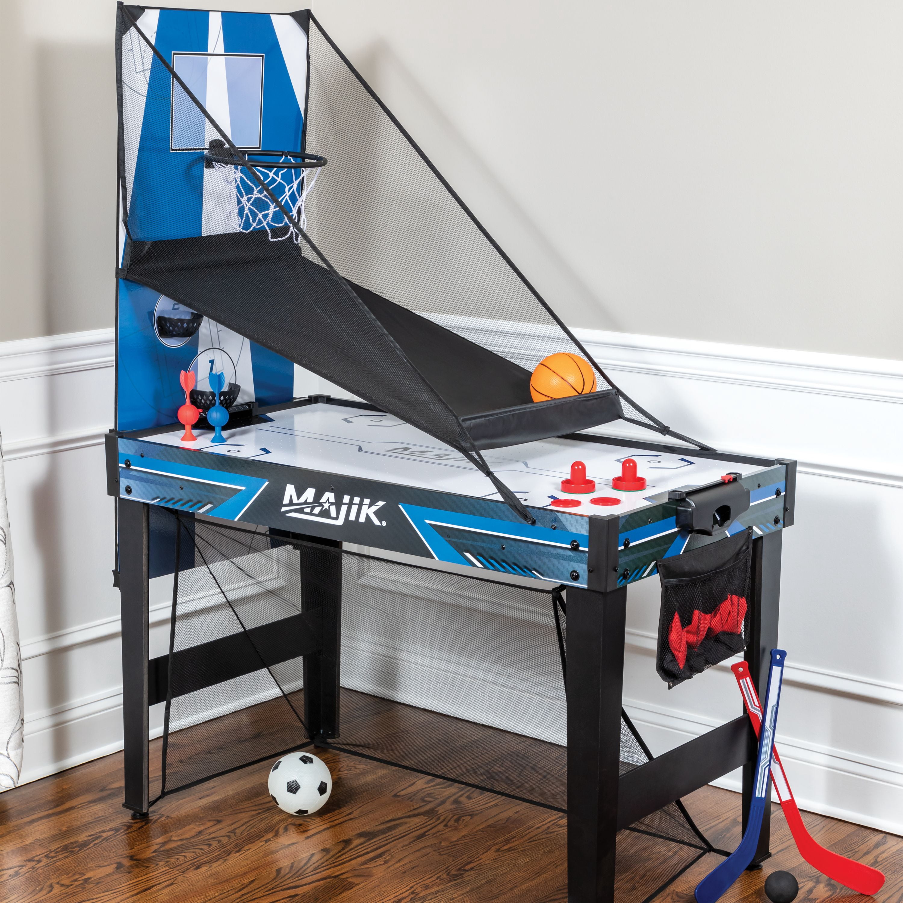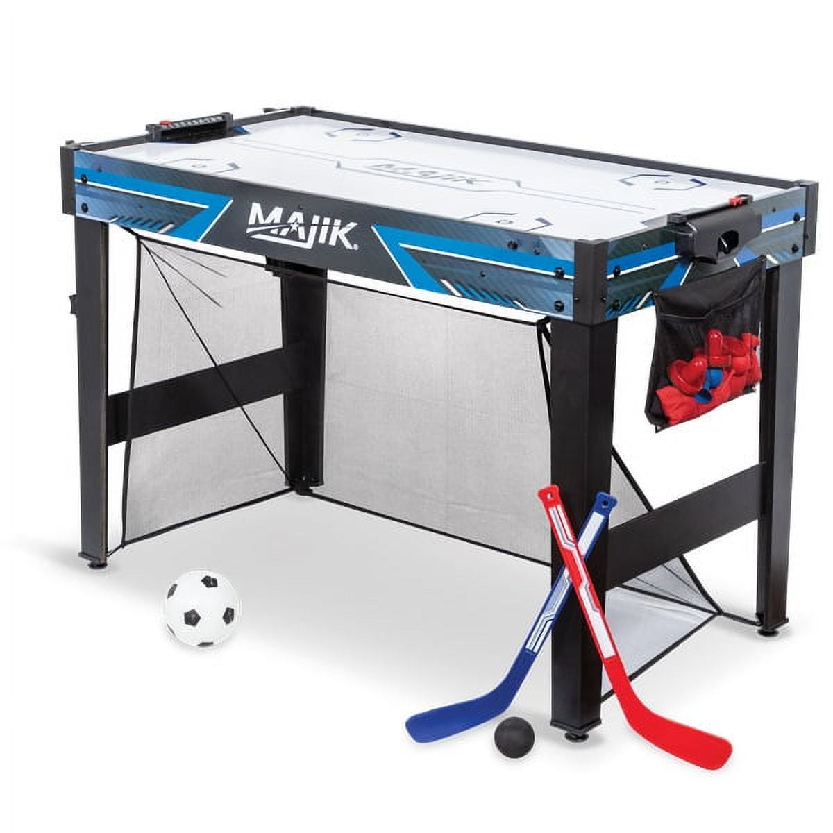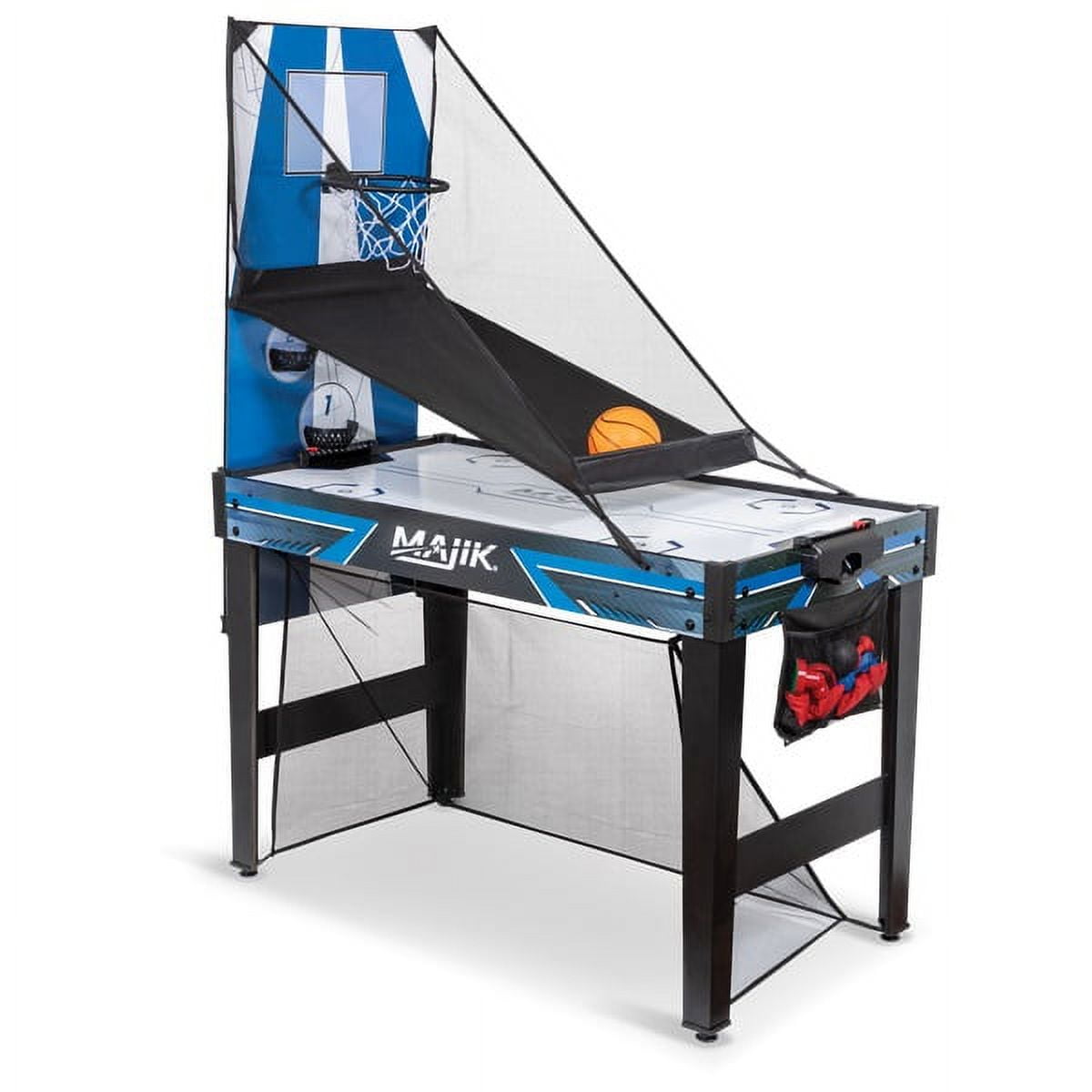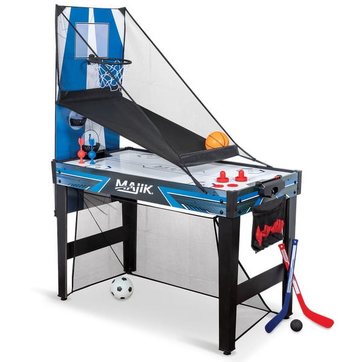 VERSATILE 6-IN-1 FUN: Enjoy the excitement of six classic games including Basketball, Soccer, Knee Hockey, Throwing Dart Challenge, Bean Bag Toss, and Air Hockey, all in a single compact table. QUICK GAME SWITCHING: Easily transition between games in seconds, ensuring non-stop entertainment for players of all ages without the hassle of disassembling or rearranging. COMPLETE GAME SET: Comes equipped with all the necessary accessories for each game, including 2 pucks, 2 pushers, 8 bean bags, 2 suction darts, 2 hockey sticks, 1 hockey ball, 1 basketball, and 1 soccer ball, ensuring you’re ready to play right out of the box.