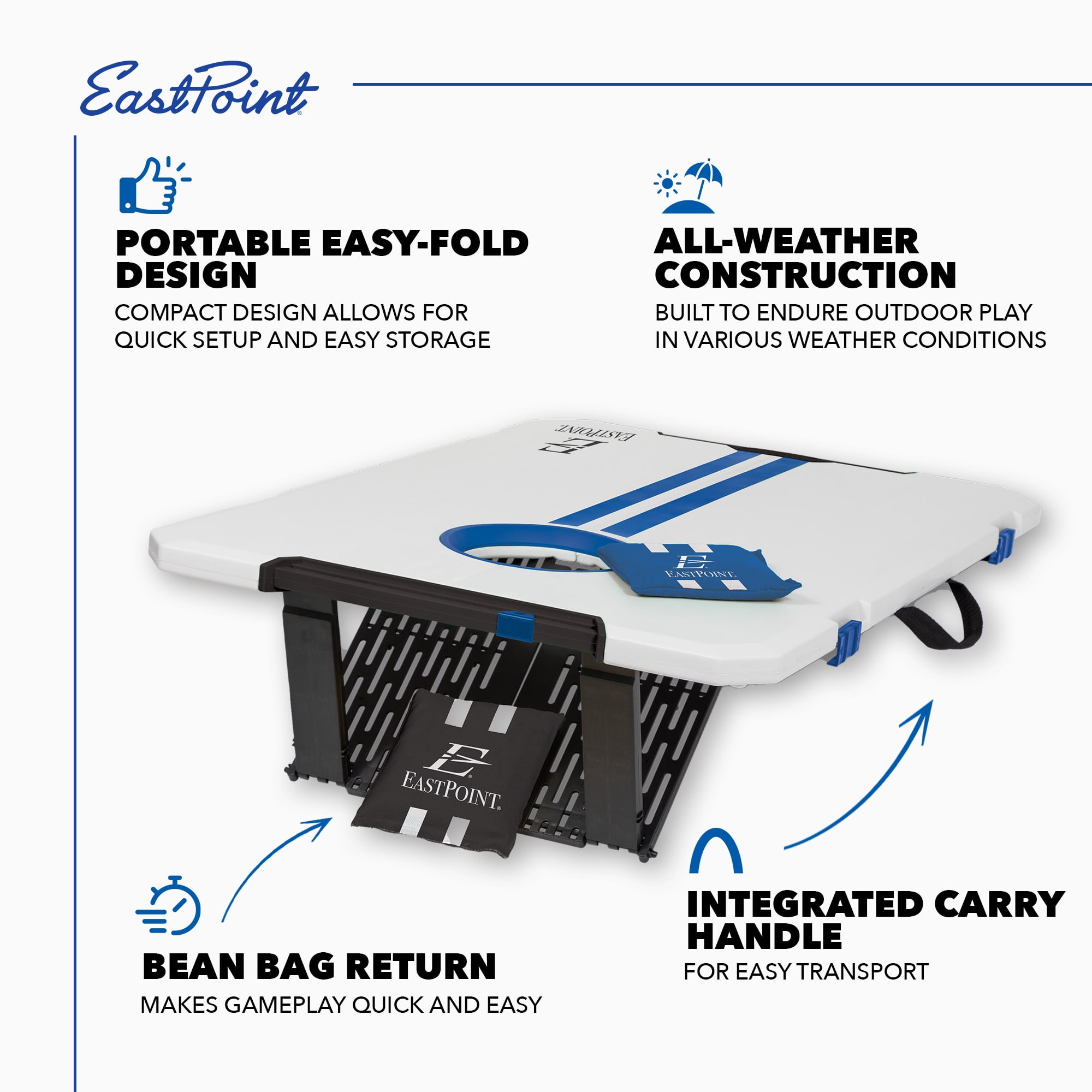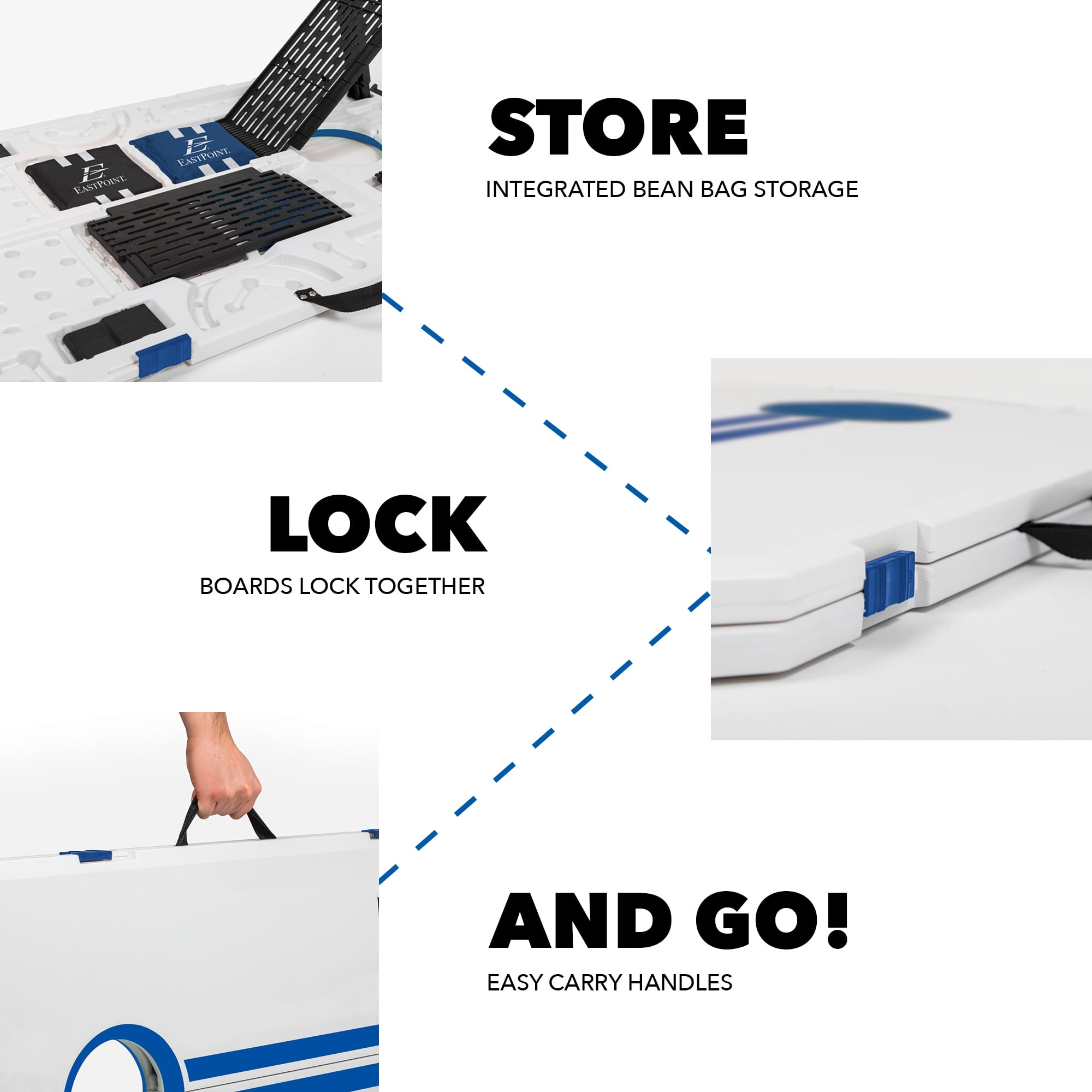 Portable Gaming On-the-Go: Take your gaming adventures anywhere with the EastPoint 2 ft. x 3 ft. (91.44 cm x 60.96 cm) All-Weather Cornhole Set – designed to store, lock, and go, making it the ultimate solution for outdoor entertainment that can accompany you to the beach or any backyard gathering. Quick Setup and Effortless Storage: Experience seamless gaming with quick setup and easy storage, ensuring a hassle-free and convenient experience that lets you dive into the excitement without delay. Competition-Enhancing Scoring System: Keep track of the action with the built-in scoring system, adding a competitive edge to every game and enhancing the overall gaming experience. Streamlined Gameplay: The integrated Bean Bag Return feature simplifies gameplay, making it quick and hassle-free, so you can focus on the excitement of the game rather than the logistics. Great for adults and kids. Durable and Reliable: Each set includes two all-weather cornhole boards measuring 2 ft. x 3 ft. (60.96 cm x 91.44 cm) that are designed to withstand various outdoor conditions, ensuring durability and reliability for countless gaming sessions. Additionally, eight bean bags in two team colors (measuring 6 in. x 6 in. / 15.24 cm x 15.24 cm) complete the set, providing all you need for engaging matches with friends and family.