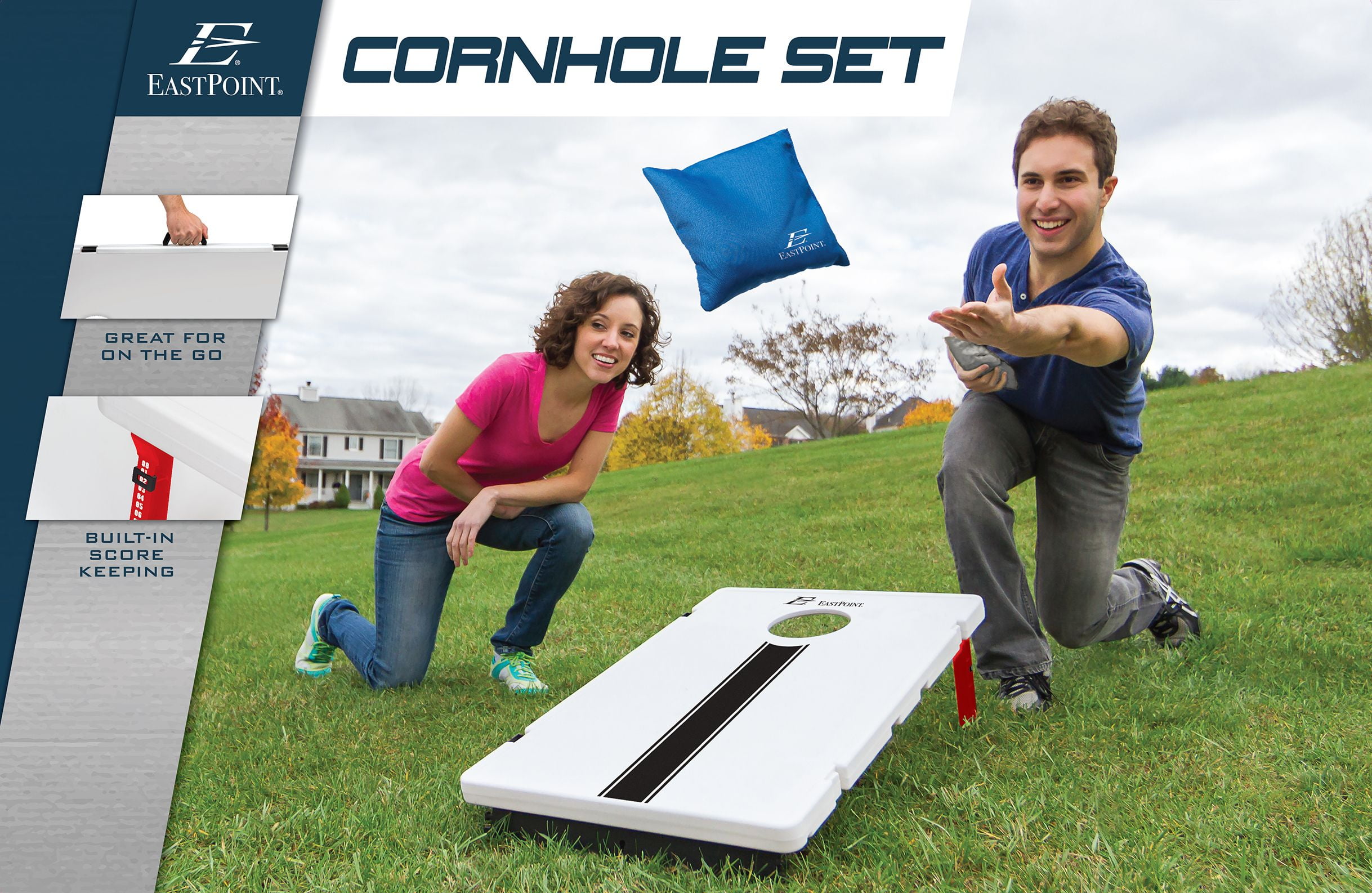 EastPoint Sports Lightweight and Portable All Weather Beanbag Toss Game Set with 8 Bean Bags This Cornhole Set includes two target boards measuring 33 2 inches x 21 6 inches, providing a true cornhole experience in a portable size, perfect for gameday tailgate parties The set comes complete with eight premium bean bags, each weighing 12 ounces and measuring 6 inches by 6 inches, ensuring optimal weight and size for accurate throws and satisfying gameplay Designed to withstand exposure to sun, rain, and other outdoor elements, this bean bag toss set ensures long-lasting durability, making it ideal for any outdoor occasion Convenient scoring sliders on the legs of the target boards allow players to effortlessly keep track of the action and scores during gameplay With assembled dimensions of 33 2 inches in length and 21 6 inches in width, this Cornhole Set is easy to transport and store, making it perfect for tailgating, backyard barbecues, beach outings, or any outdoor event