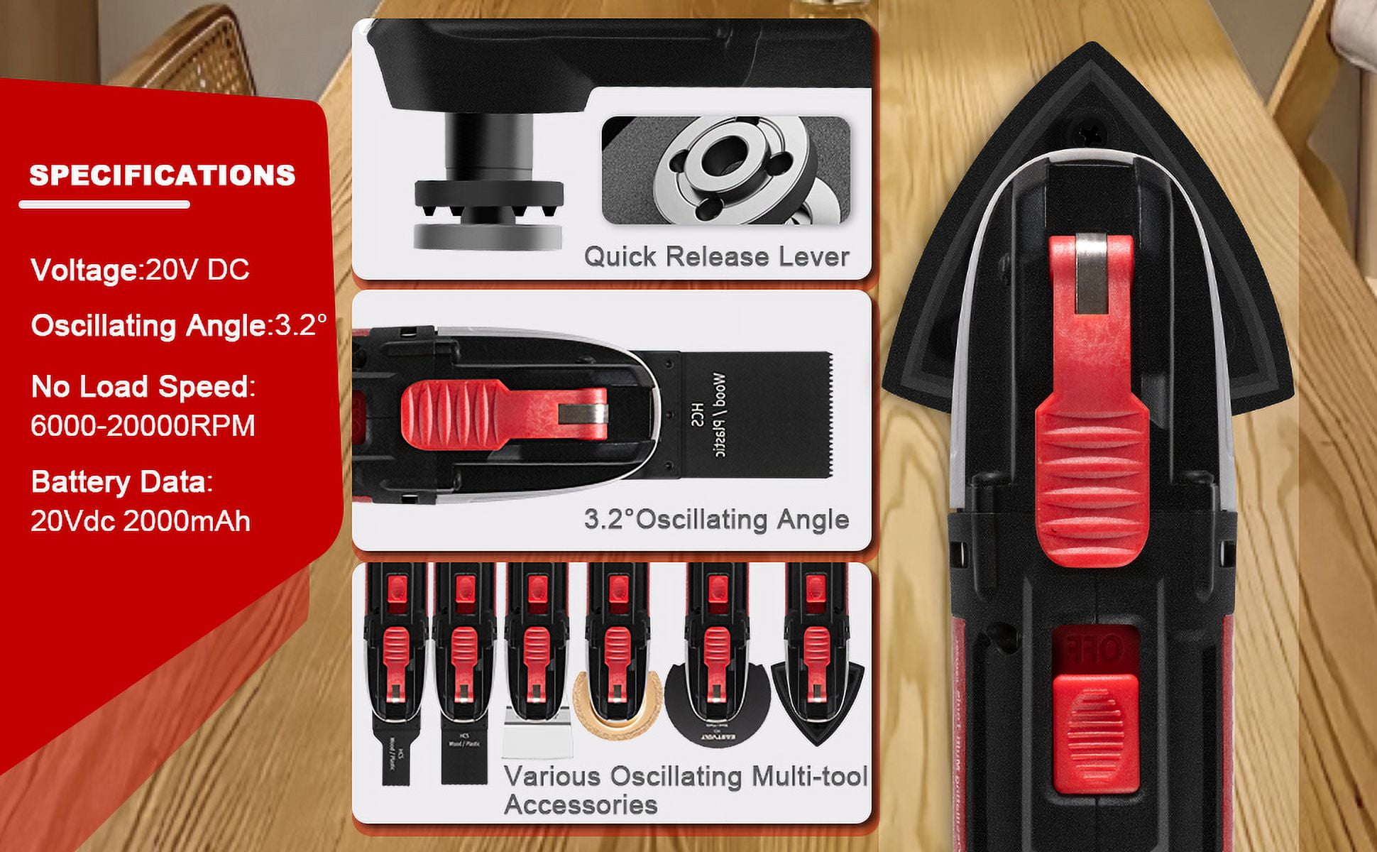 [Powerful Motor] With a powerful motor and a 6-variable speed dial control, ranging from 6000 – 20000r/min, this oscillating tool delivers optimal performance. Its 3.2 degrees oscillation angle allows you to tackle various home repair or DIY projects effortlessly. From cutting plastic to metal and sanding surfaces, this tool is your go-to companion. [Wireless & Convenient] Equipped with a 2.0Ah Li-Ion battery, this cordless oscillating tool offers unparalleled convenience compared to corded counterparts. Perfect for hard-to-reach places, avoid the hassle of handling pull wires when cutting door frames or repairing roofs. Say goodbye to tangled cords! [Quick Change & Universal Interface] Say goodbye to time-consuming blade changes. Our tool supports quick blade change and comes with a universal accessory adapter, compatible with most oscillating tool accessory brands. Effortlessly switch between different accessories for different tasks, making your work more efficient. [LED Lighting] Illuminate your work surfaces accurately with the front LED light. Even in low-light conditions, you can achieve precise scraping, grinding, sanding, and cutting. No more guessing or straining your eyes to see what you’re working on. [What you get] In the package, you will receive the oscillating tool along with 3pcs of Plunge-cut Saw Blades, 1pc of Segment Saw Blade, 1pc of Diamond Tipped Segment Saw Blade, 1pc of Sanding Pad, 1pc of Scraper, and 15pcs of Sanding Paper. Everything you need to kickstart your projects.