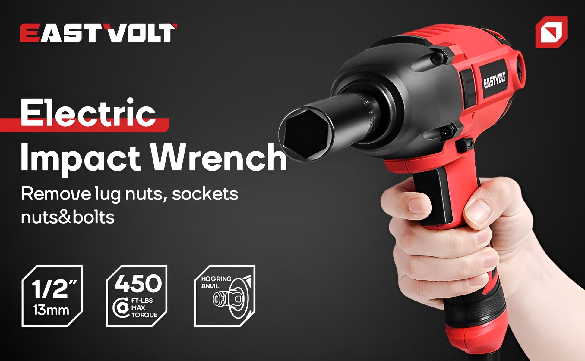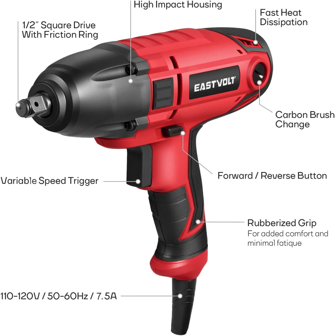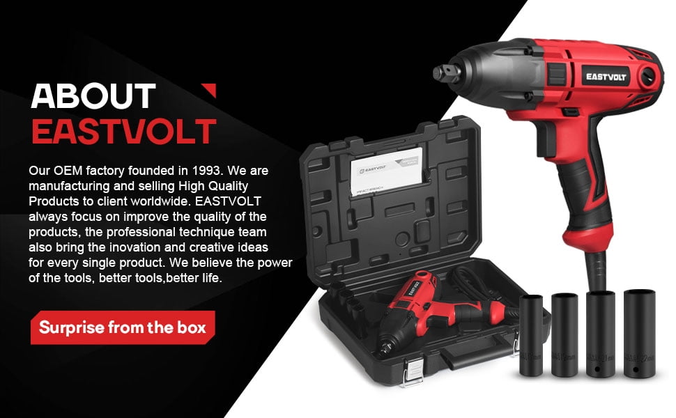 Eastvolt EVIW800 800W, 7.5A 1/2″ Cordless Friction Ring Impact Wrench, 3400 RPM High Torque: Equipped with a powerful motor that delivers a maximum torque of 450 ft-lbs, ideal for removing lug nuts and bolts High Power: The 7.5 amp motor provides up to 3400 no-load speed (RPM) and 3700 impacts per minute (BPM) for efficient task completion User-Friendly Design: Features a forward/reverse rocker switch for quick and easy operation, along with a 1/2″ anvil with a heavy-duty hog ring to securely hold sockets Versatile Application: Suitable for installing and removing heavy fasteners Packing Included: Comes with 1 impact wrench, 4 sockets (11/16″, 3/4″, 13/16″, 7/8″ or 17mm, 19mm, 21mm, 22mm), and a carry case