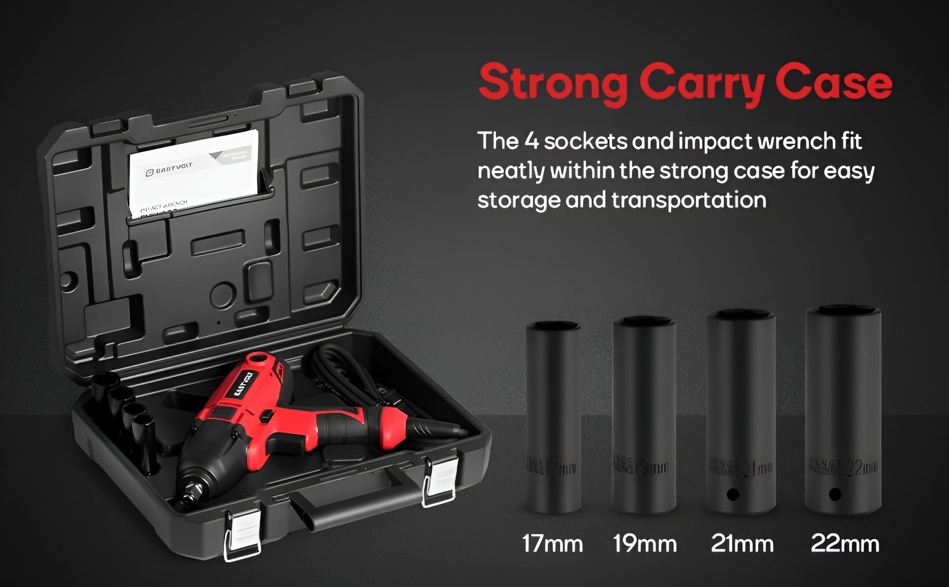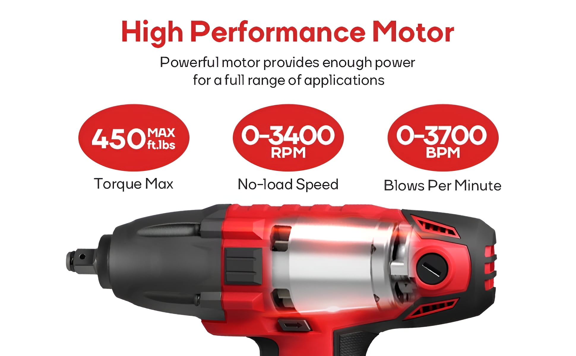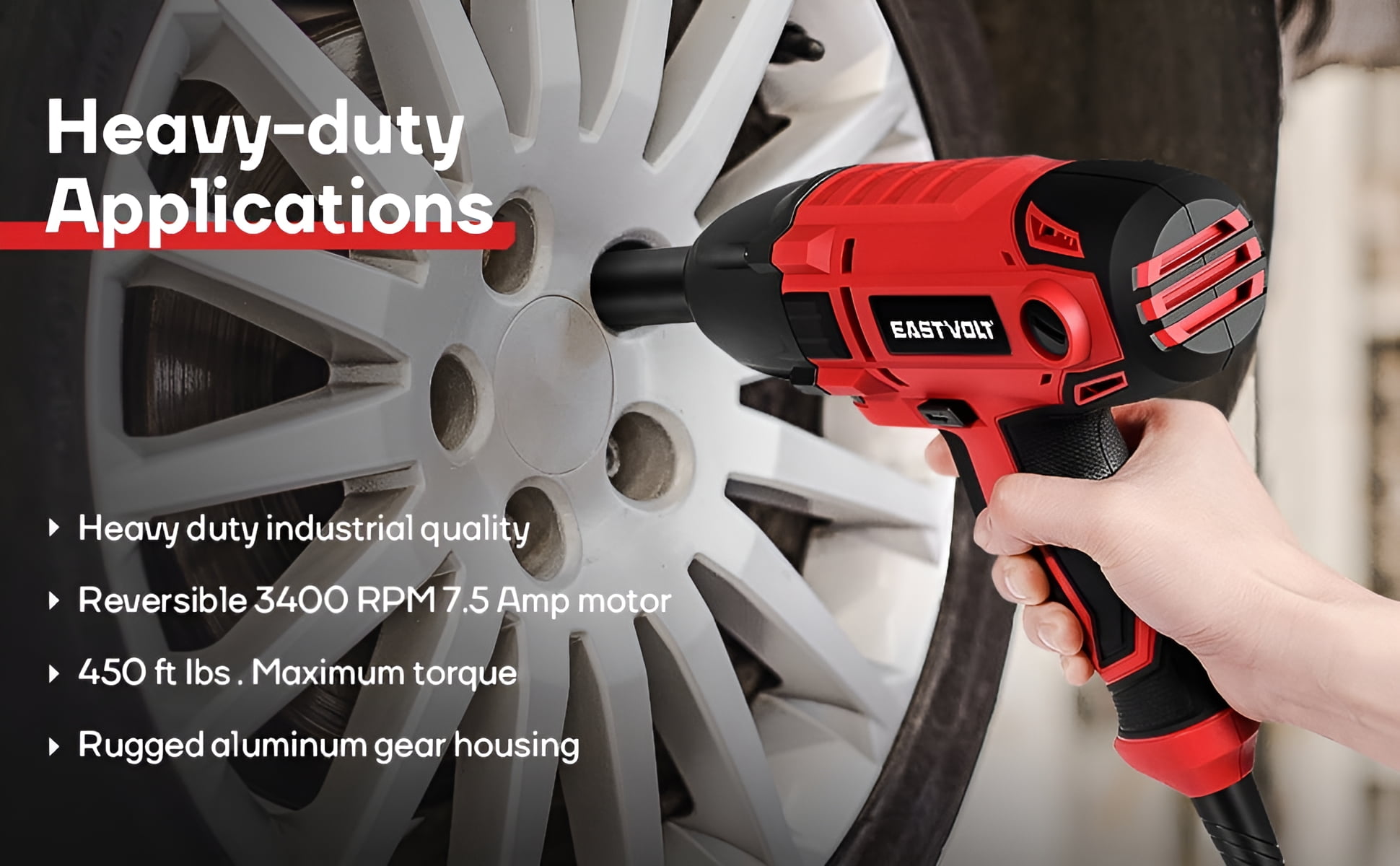 Eastvolt EVIW800 800W, 7.5A 1/2″ Cordless Friction Ring Impact Wrench, 3400 RPM High Torque: Equipped with a powerful motor that delivers a maximum torque of 450 ft-lbs, ideal for removing lug nuts and bolts High Power: The 7.5 amp motor provides up to 3400 no-load speed (RPM) and 3700 impacts per minute (BPM) for efficient task completion User-Friendly Design: Features a forward/reverse rocker switch for quick and easy operation, along with a 1/2″ anvil with a heavy-duty hog ring to securely hold sockets Versatile Application: Suitable for installing and removing heavy fasteners Packing Included: Comes with 1 impact wrench, 4 sockets (11/16″, 3/4″, 13/16″, 7/8″ or 17mm, 19mm, 21mm, 22mm), and a carry case