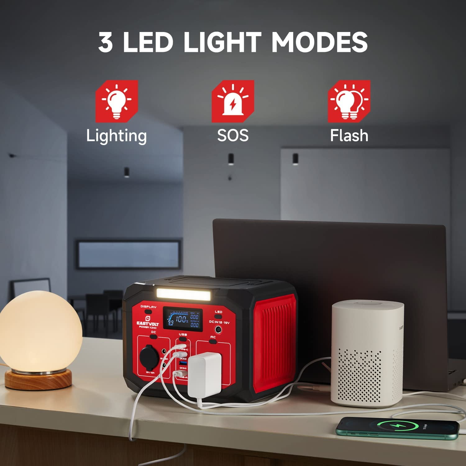 【Multiple Rechargeable Modes】Eastvolt portable power station is equipped with a 201.6Wh high capacity lithium-ion battery, it can be charged by the AC wall adapter, car charger and solar panel (not included) efficiently. Only 2.5 hours to recharge 80% battery of the power station. 【Versatile Power Source】Featuring 1* AC outlet, 1* USB-A, 2*USB-QC3.0, 2*DC outlets, 1*Car outlet, 1*Type-C. The power station can charge multiple devices(smartphone, laptop, camera, drone, etc.) at the same time. 【Portable and Multipurpose】Eastvolt portable power station weighs only 6.3 pounds. Easy to carry and outdoor use, such as camping, travel, use in the car on road trip. Not use on the device over 240W. 【LED Light】3 modes of LED light: lighting, SOS, flash. 360LM LED SOS lighting for outdoor lighting or helping. 【Package Contents】1* Eastvolt 240W portable power station, 1* AC 60W adapter, 1* Car charger cable, 1* User Manuel.