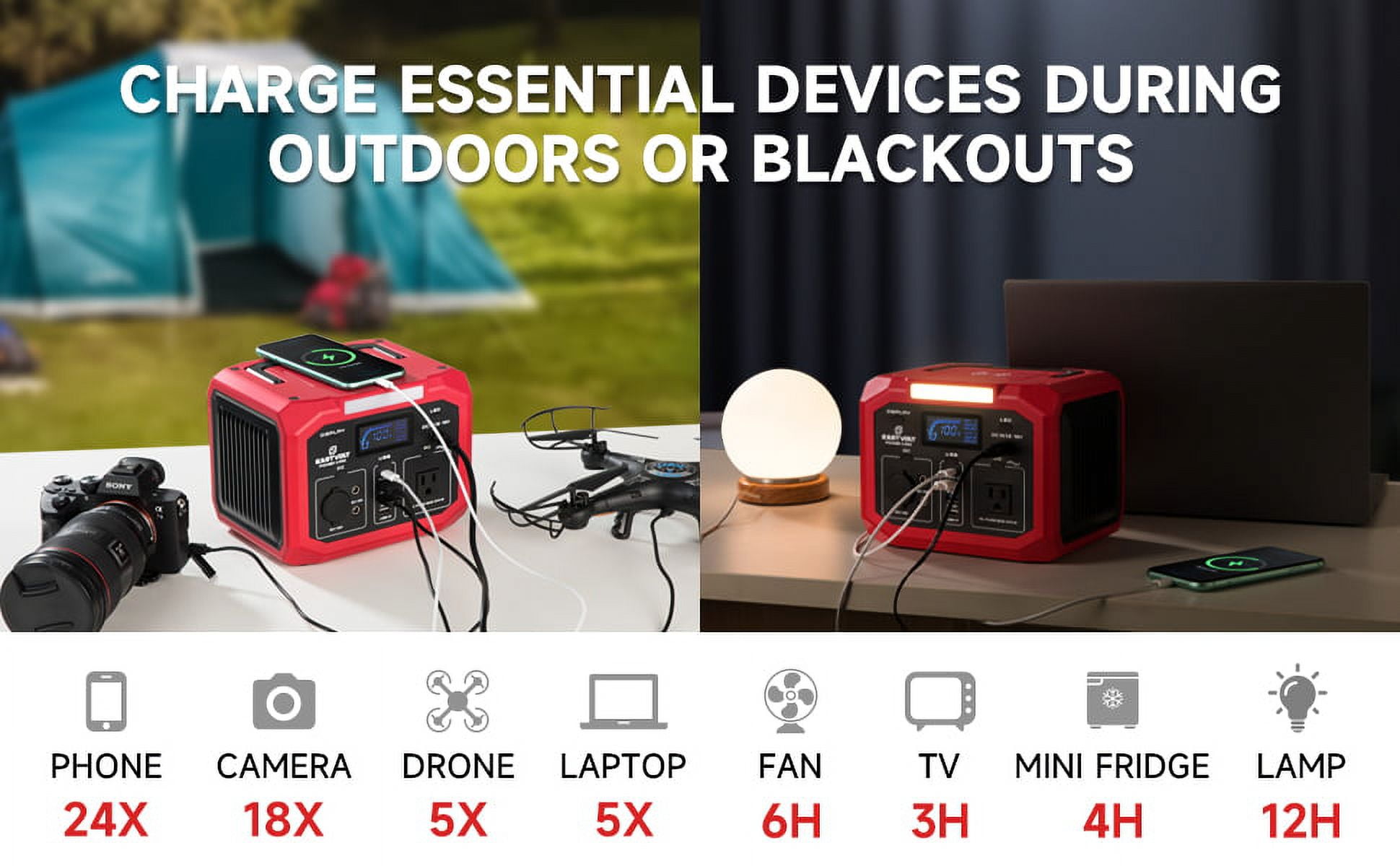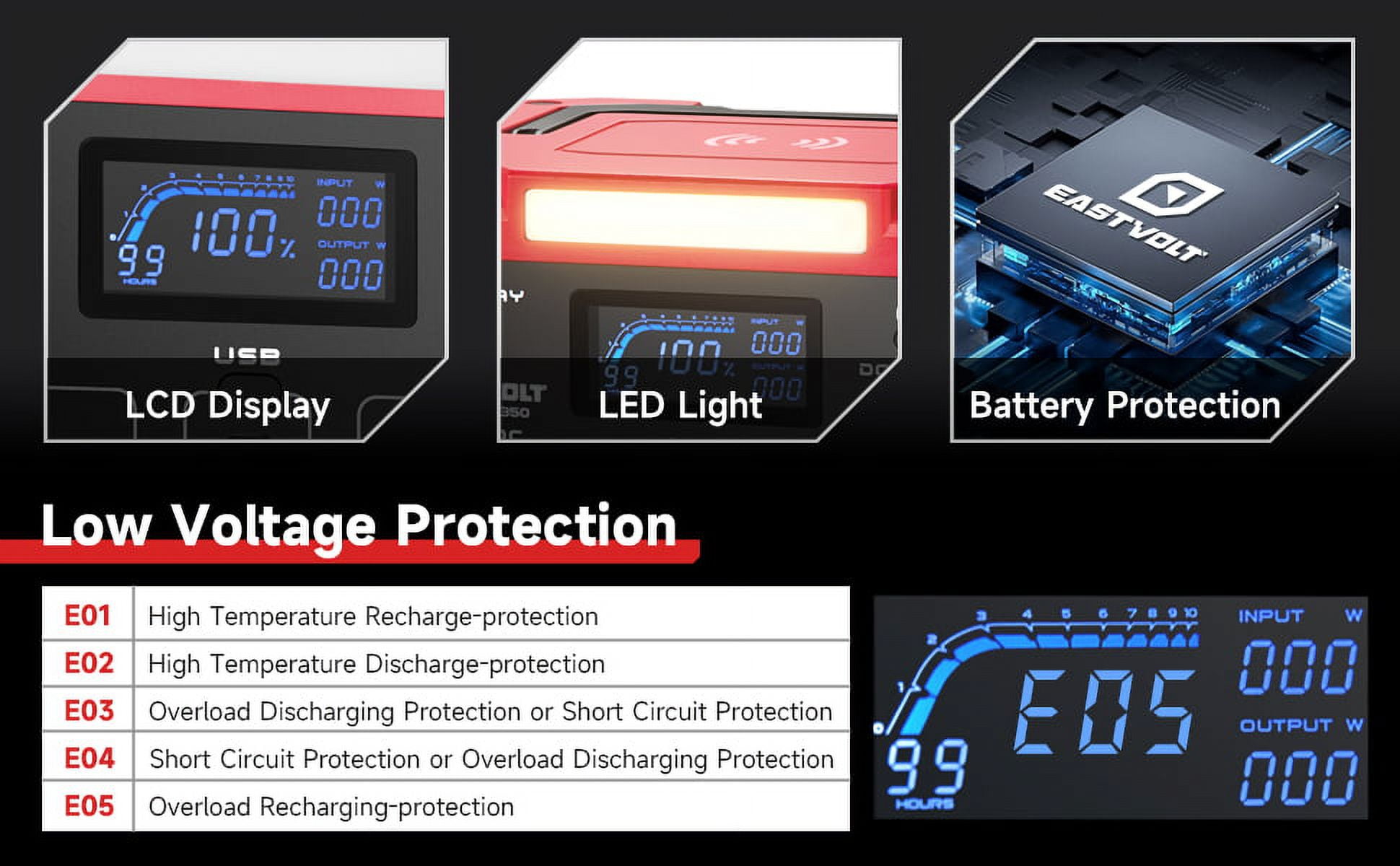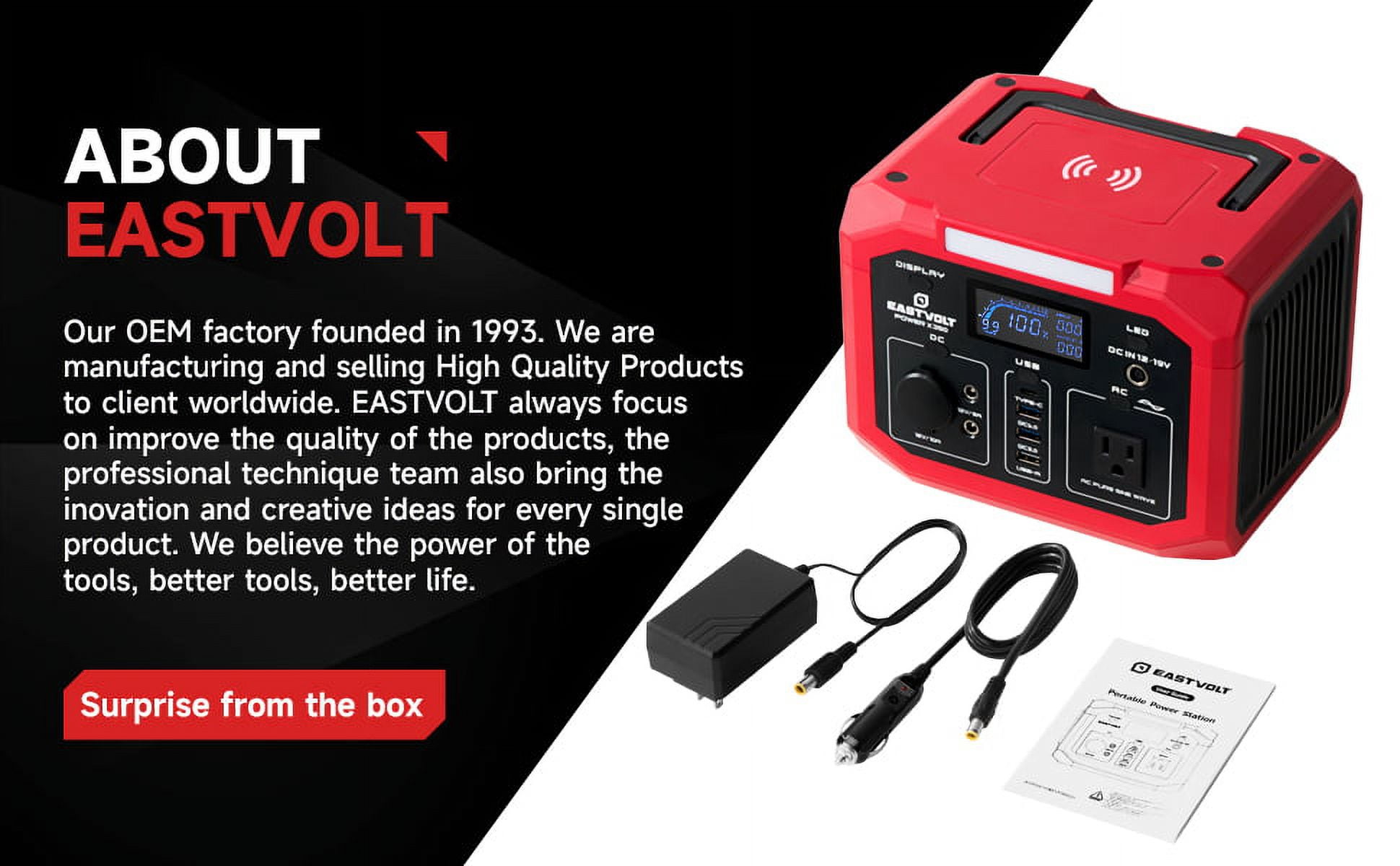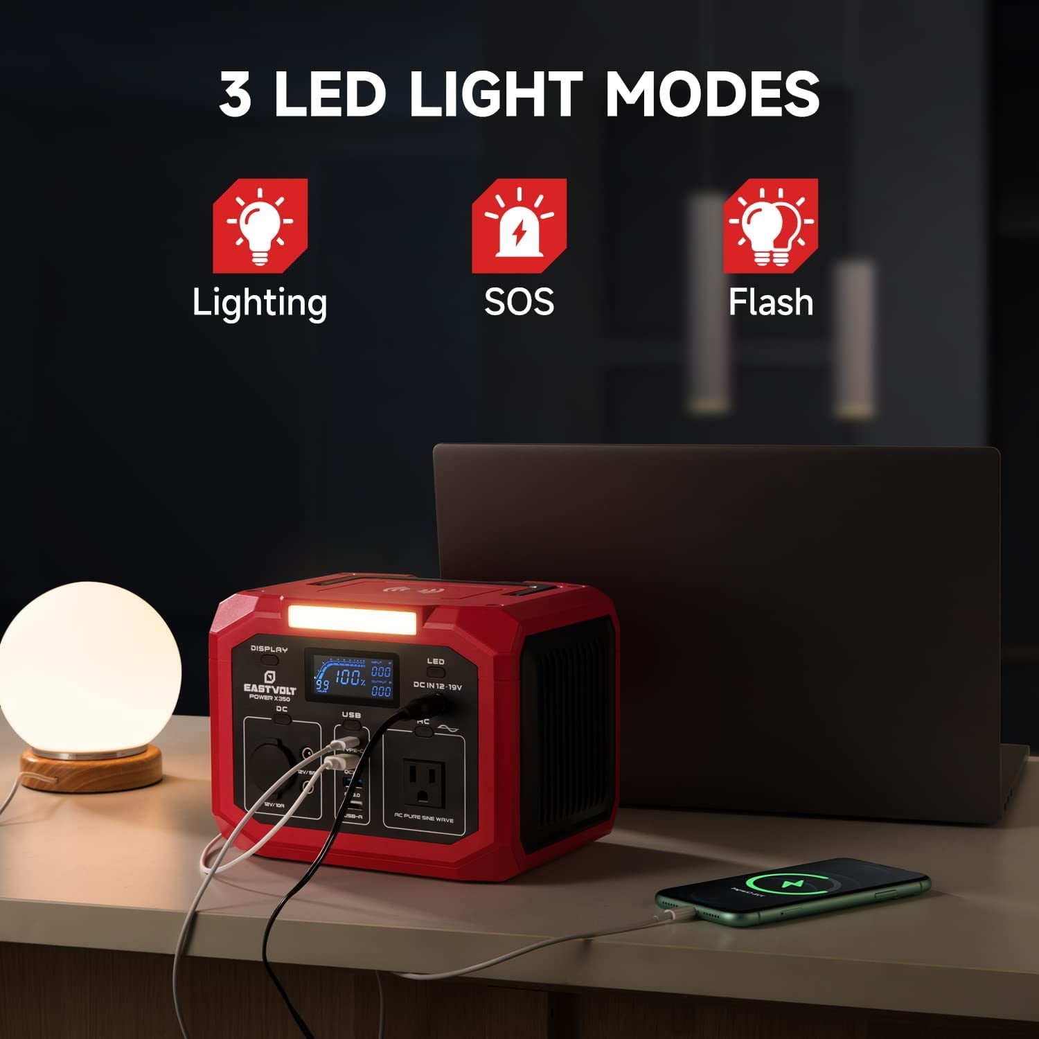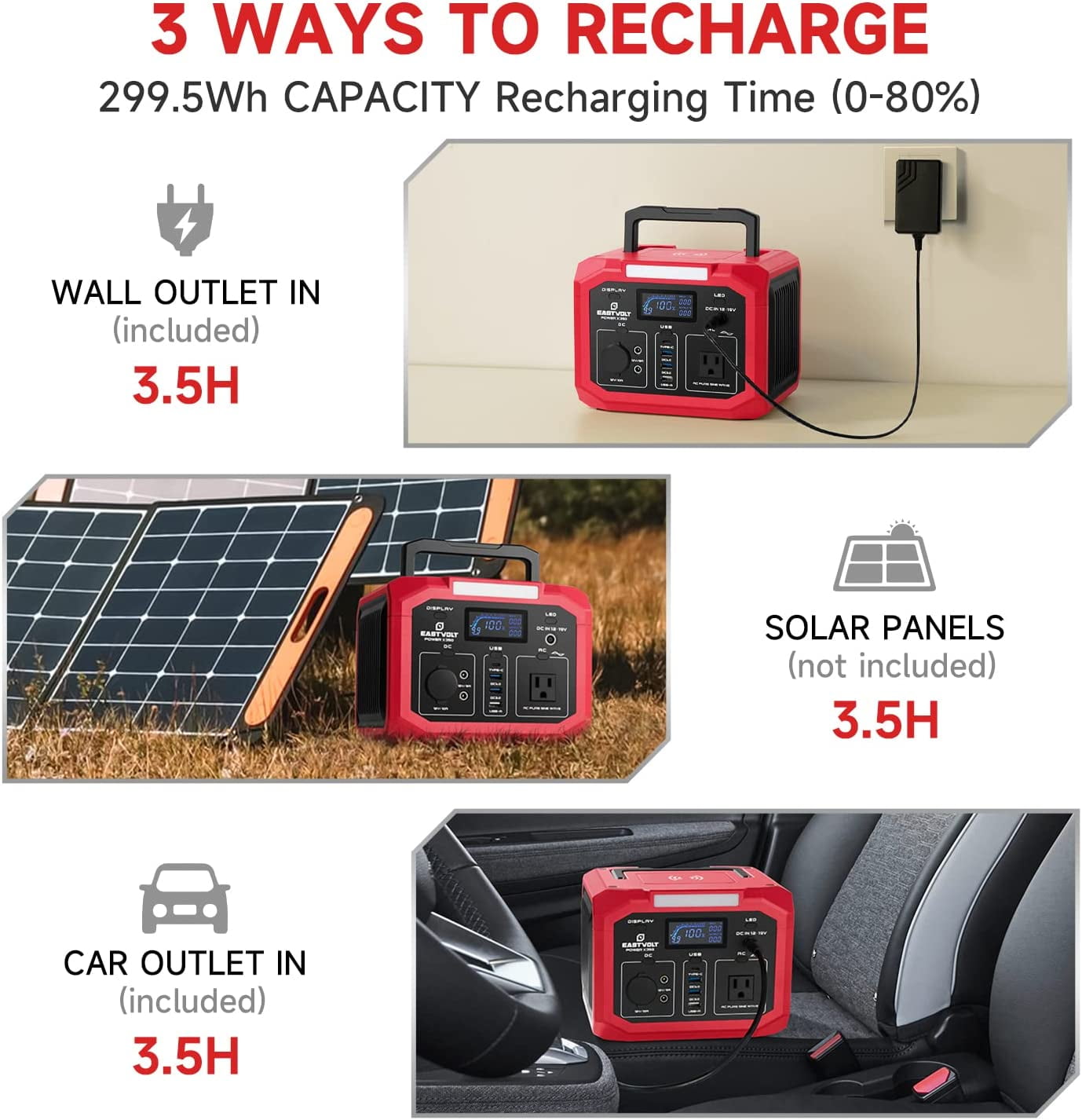 Multiple Rechargeable Modes Eastvolt portable power station is equipped with a 299.5Wh high capacity lithium-ion battery, it can be charged by the AC wall adapter, car charger and solar panel (not included) efficiently.Only 3.5 hours to recharge 80% battery of the power station.Portable and Multipurpose Eastvolt portable power station weighs only 7.1 pounds. Easy to carry and outdoor use, such as camping, travel, use in the car on road trip. Not use on the device over 350W. LED Light 3 modes of LED light: lighting, SOS, flash. 360LM LED SOS lighting for outdoor lighting or helping. Package Contents 1* Eastvolt 350W portable power station, 1* AC 60W adapter, 1* Car charger cable, 1* User Manuel.