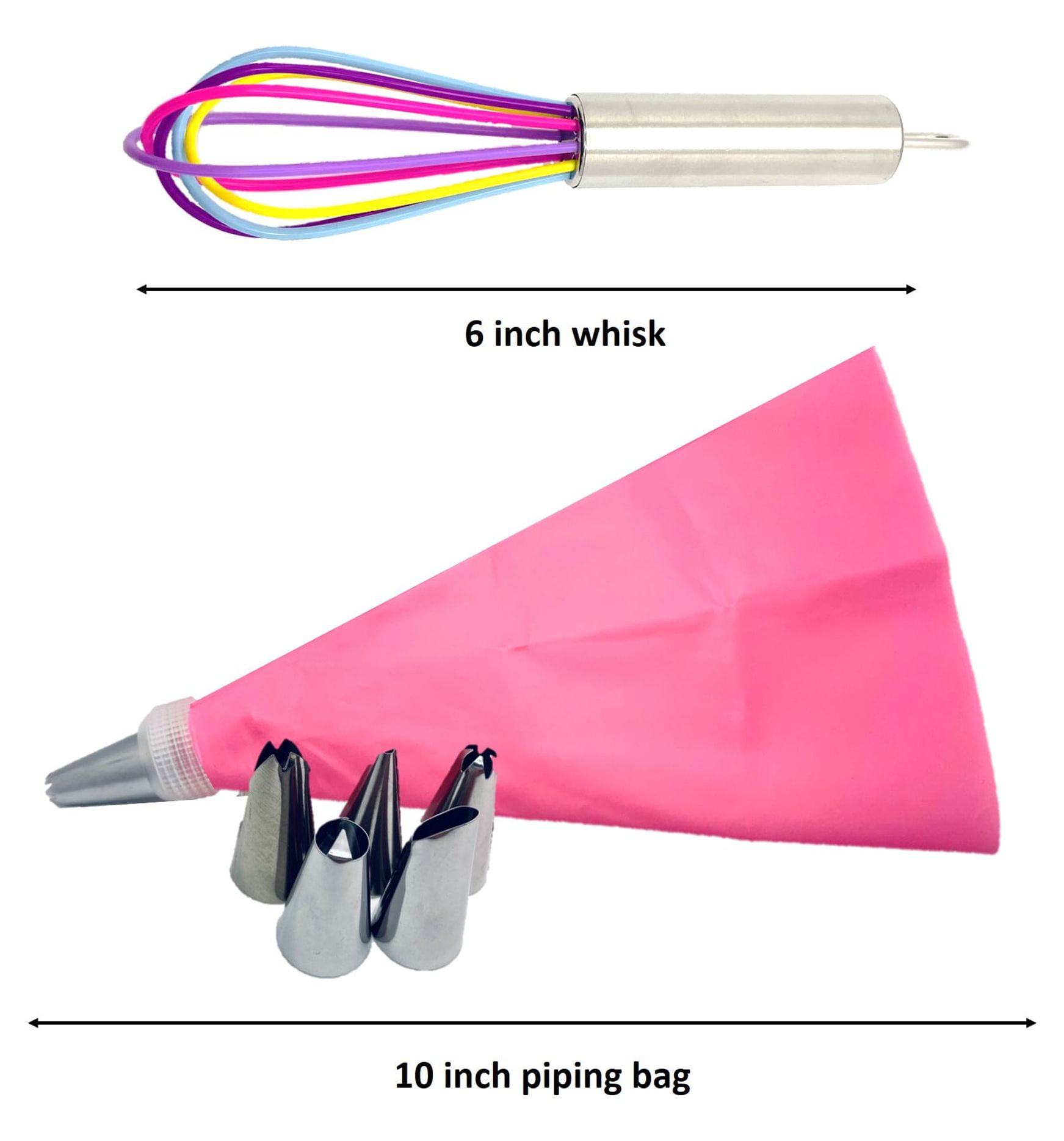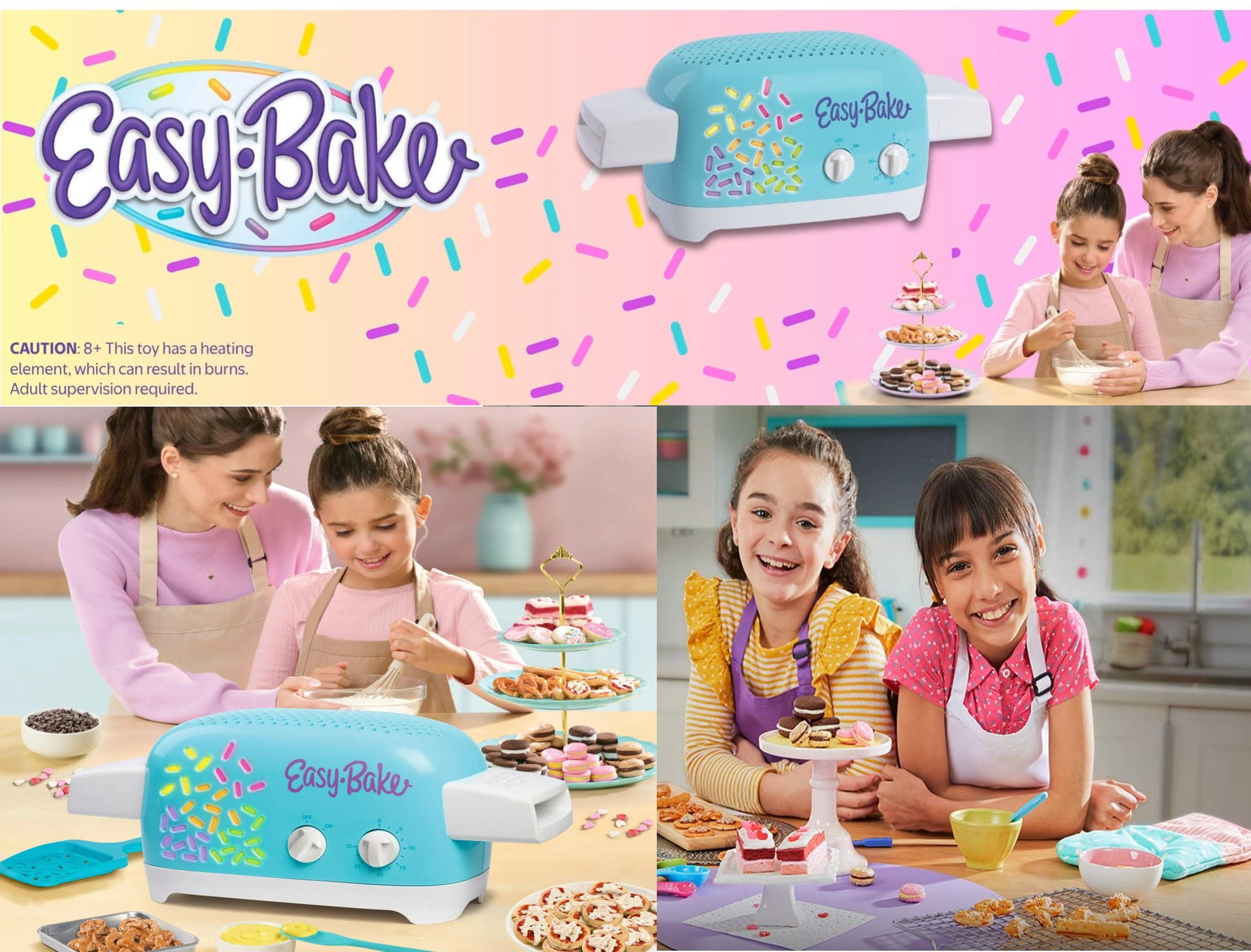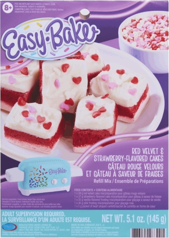 The Easy Bake: Ultimate Oven lets your kids experience the wonderful and creative process of baking treats for their family & friends! Includes oven, baking pan, pan tool, and instructions. The oven has a new and updated look and it’s sure to be a big hit with your tiny baker! RED VELVET & STRAWBERRY CAKES REFILL: Includes 1 red velvet cake mix, 1 strawberry cake mix, 1 vanilla frosting mix, 1 pink frosting mix, 1 packet of heart-shaped confetti, and instructions. For use for the Easy Bake Ultimate Oven ALLERGEN INFORMATION: Mixes contain wheat, milk, eggs, soy, and trace amounts of peanuts, tree nuts, and sulfites PINK POLKA DOT KID-SIZED APRON: Perfectly sized for your baker with adorable ruffles, polka dots, and a cute cupcake pocket! Lightweight, easy to clean & durable, with straps that tie to size to create the perfect fit. Machine Washable. Let them dress the part & keep their clothes clean while looking cute as can be! 21 in X 22.5 in RAINBOW COLORED WHISK: 6 multi-colored non-stick silicone wired whisk with a stainless steel handle, and loop. A magical, fun baking tool that anyone is sure to love A FROSTING PIPING BAG WITH 6 UNIQUE FROSTING TIPS-REUSABLE: Your little baker will love the fun pink piping bag to frost her delicious creations! It brings the whole experience to another level. 10 inches