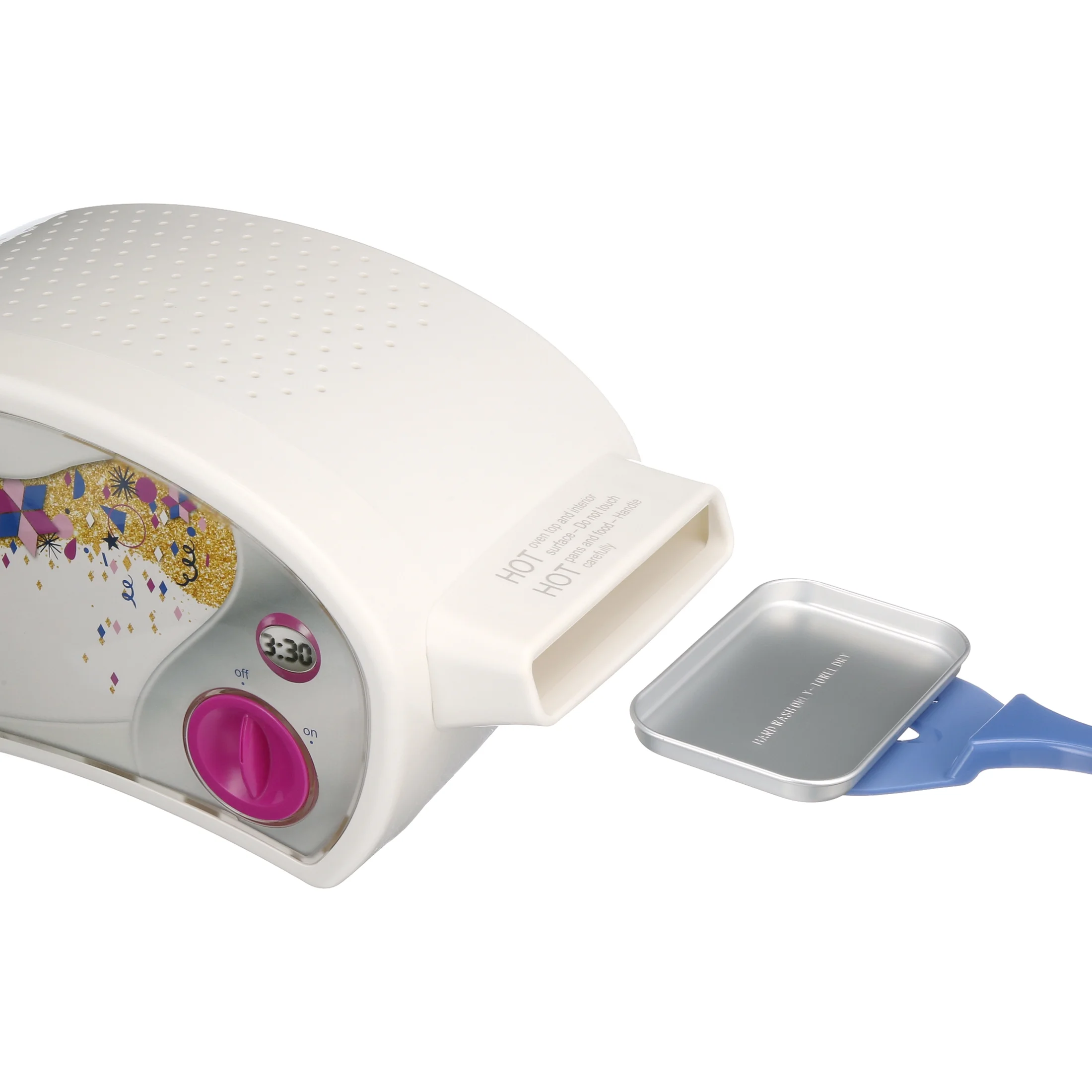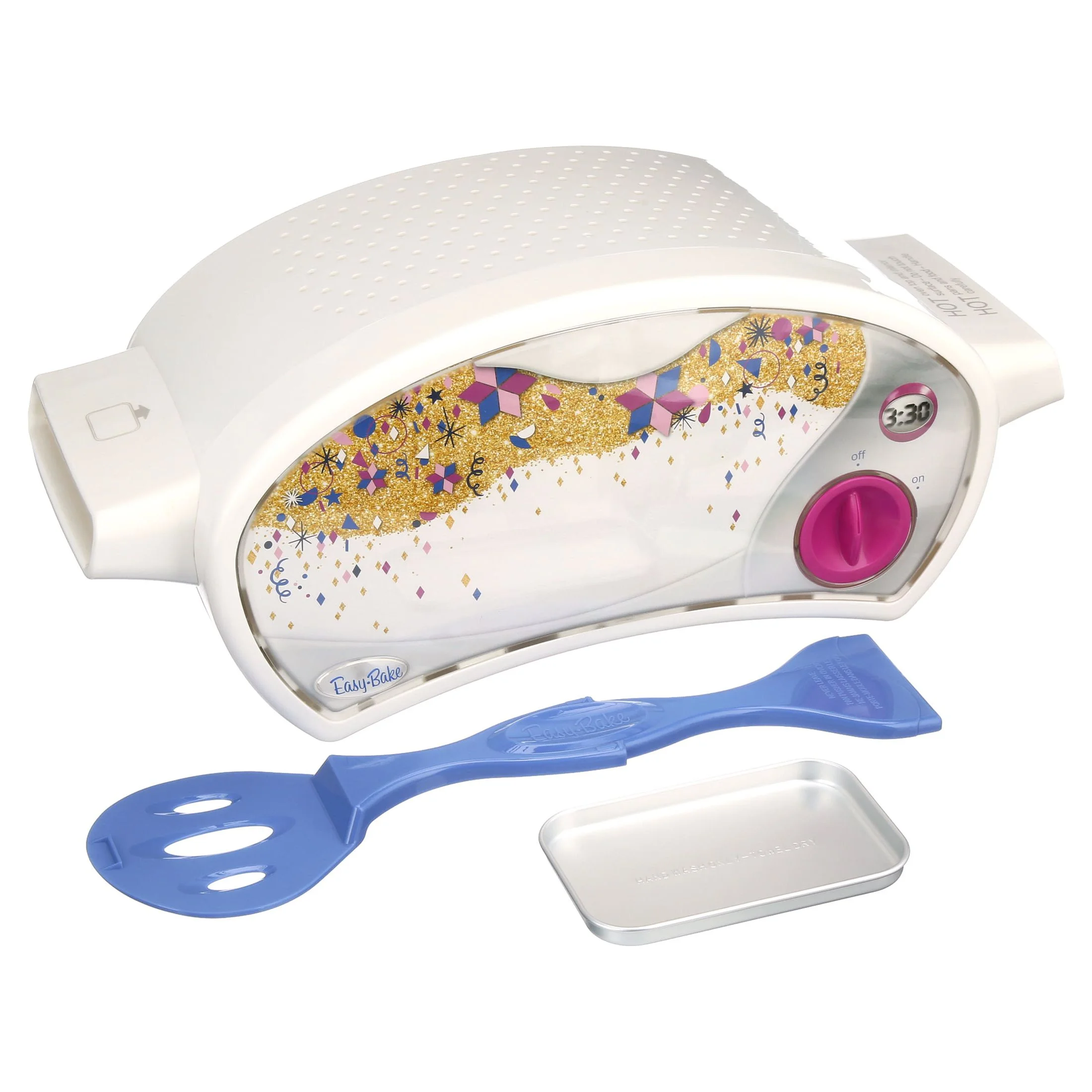 This version of the classic toy oven looks modern in sleek white, with sparkly gold, pink, purple, and periwinkle accents for a fresh look. Using a heating element like a conventional oven, the Easy-Bake Ultimate Oven lets kids bake delectable treats for family and friends. The extended menu of mixes available (each sold separately) includes cookies, cakes, cupcakes, truffles, pizza, soft pretzels, and whoopie pies.