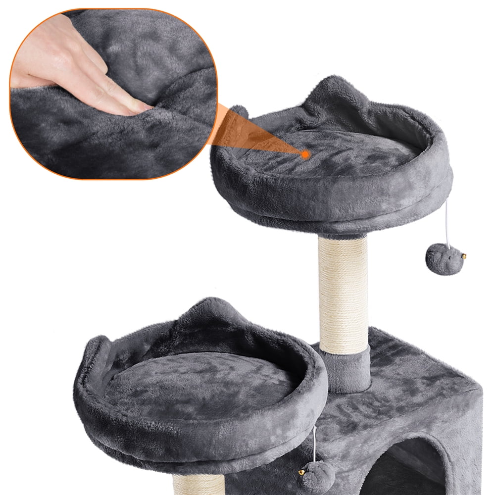 Easyfashion 62.2-in Cat Tree & Condo Scratching Post Tower, Dark Gray: Color: dark gray Material: P2 particle board, 380gsm plush, sisal, metal, plastic Overall dimension: 24 x 19.5 x 62.2″ (LxWxH) Foam-edged perch size: 15 x 5.7″ (Dia.xH) Cubic condo size: / 14 x 12 x 10″ (LxWxH); entrance size: 7 x 7.5″ (WxH) Barrel-shaped condo size: 13 x 10″ (Dia.xH); entrance size: 7.5 x 7.5″ (WxH) Hammock size: 16.5 x 13.4″ (LxW) Platform hole diameter: 6.5″ Baseboard size: 24 x 19.5″ (LxW) Supporting post diameter: 2.6″ Maximum weight capacity: total: 40kg/ 88lb; condo/perch: 10kg/22lb; hammock: 8kg/17.6lb G.W.: 17.4 kg / 38.3 lb 1. Keep the cat tree dry. 2. Keep away from fire. 3. Please prevent your children from climbing the cat tree. 4. Please make sure the size of the product fits your pet before purchasing. This cat tree is recommended for families with 2-3 medium/large cats. 5. Please allow errors due to manual measurement.