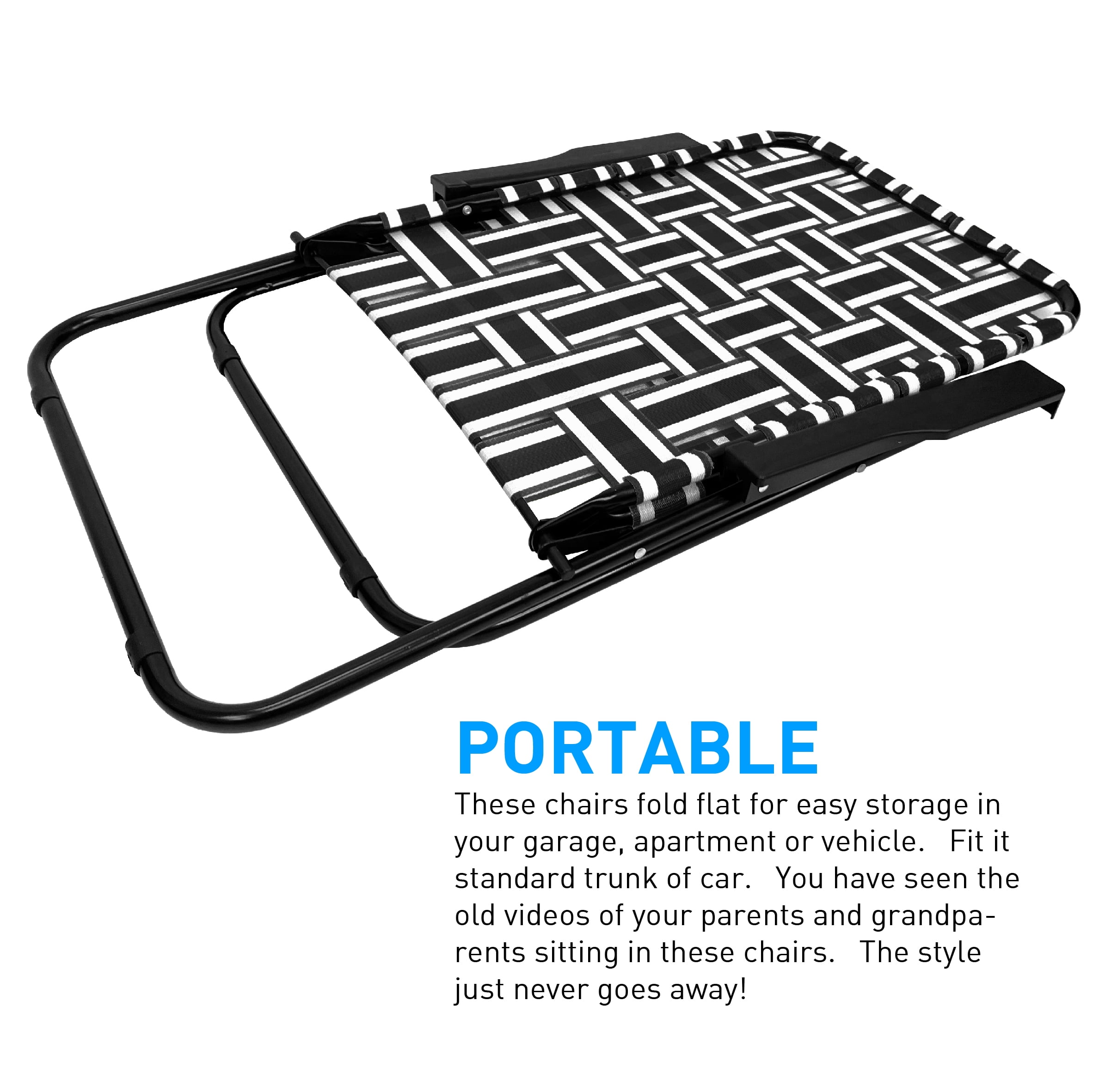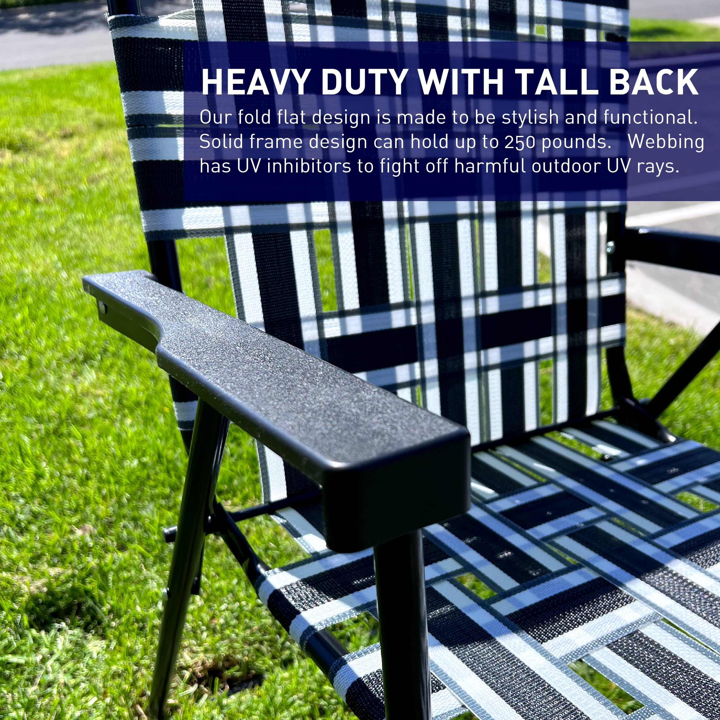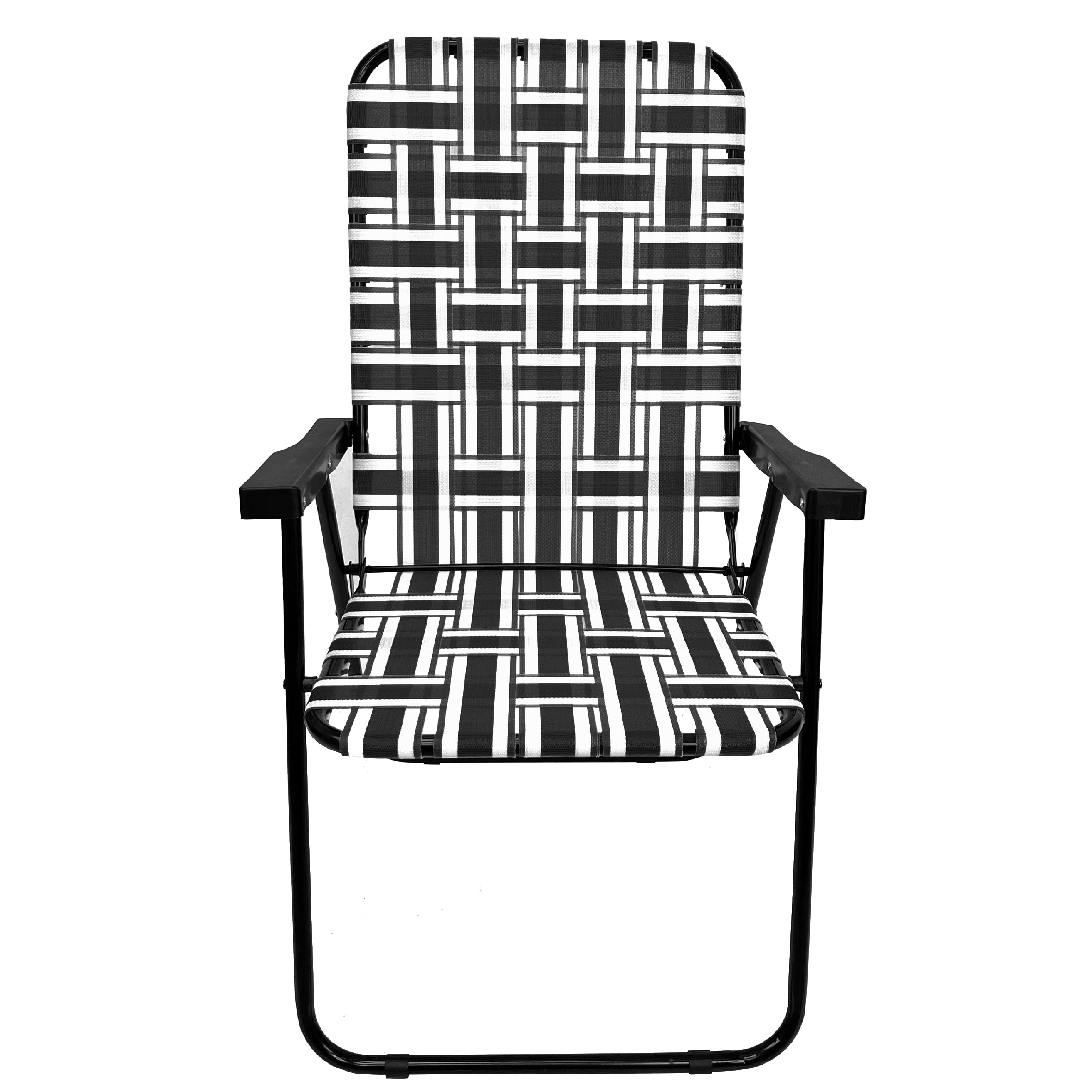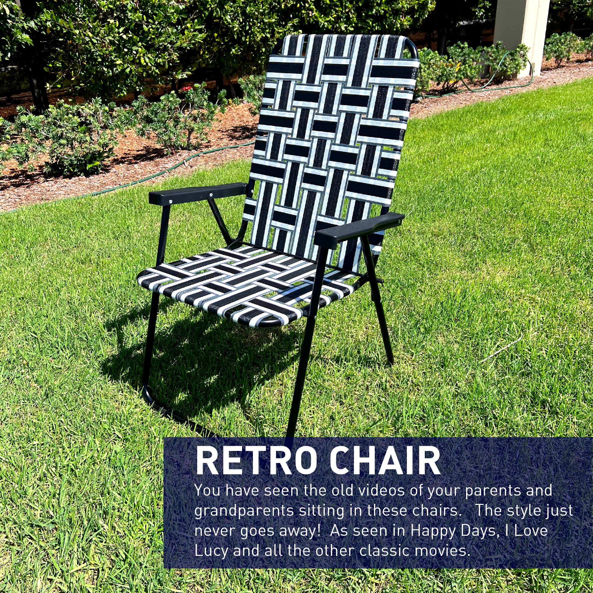 EasyGo Products Lightweight Lawn Chair, Black Basketweave MULTIPLE COLOR COMBINATIONS – Available in various colors to match your favorite football, soccer, or backyard themes. Perfect for theme parties and team building PORTABLE – Folds flat for easy storage in your garage, apartment, or vehicle. Fits in a standard trunk of a car RETRO CHAIR – A classic design reminiscent of the chairs your parents and grandparents used. Timeless style featured in shows like Happy Days and I Love Lucy USE IT ANYWHERE – Ideal for football games, tailgating, camping, backyard gatherings, or concerts. Match your favorite team colors HEAVY DUTY WITH TALL BACK – Stylish and functional fold-flat design. The solid frame supports up to 250 pounds. Webbing includes UV inhibitors to protect against harmful outdoor UV rays