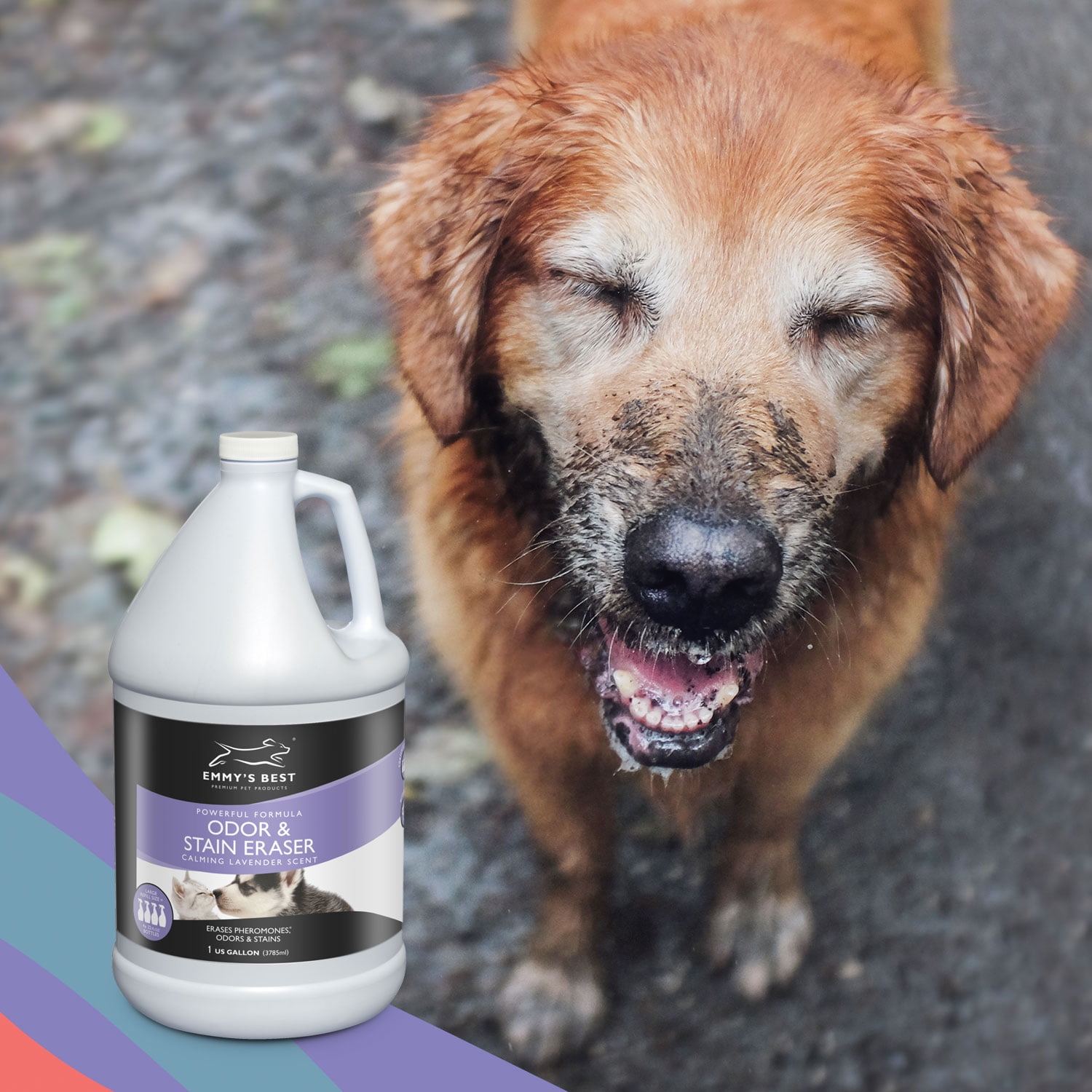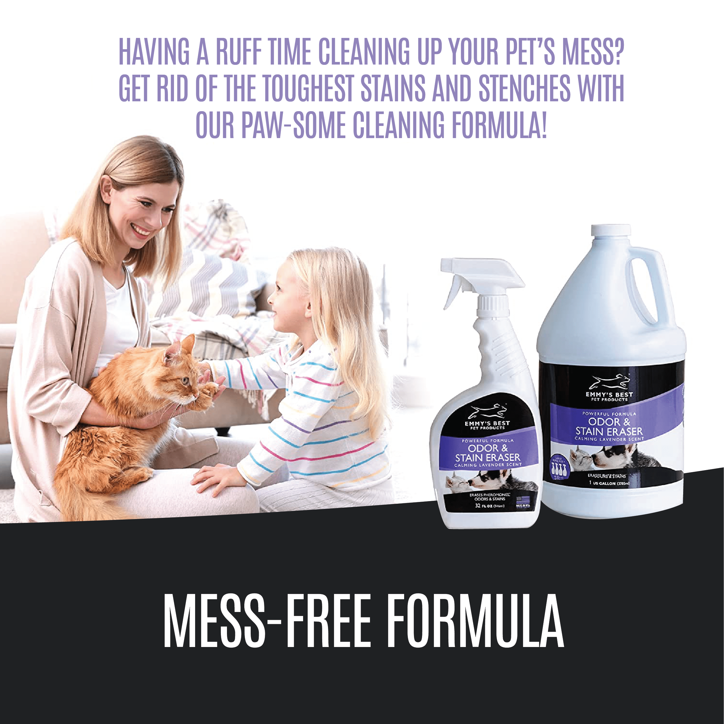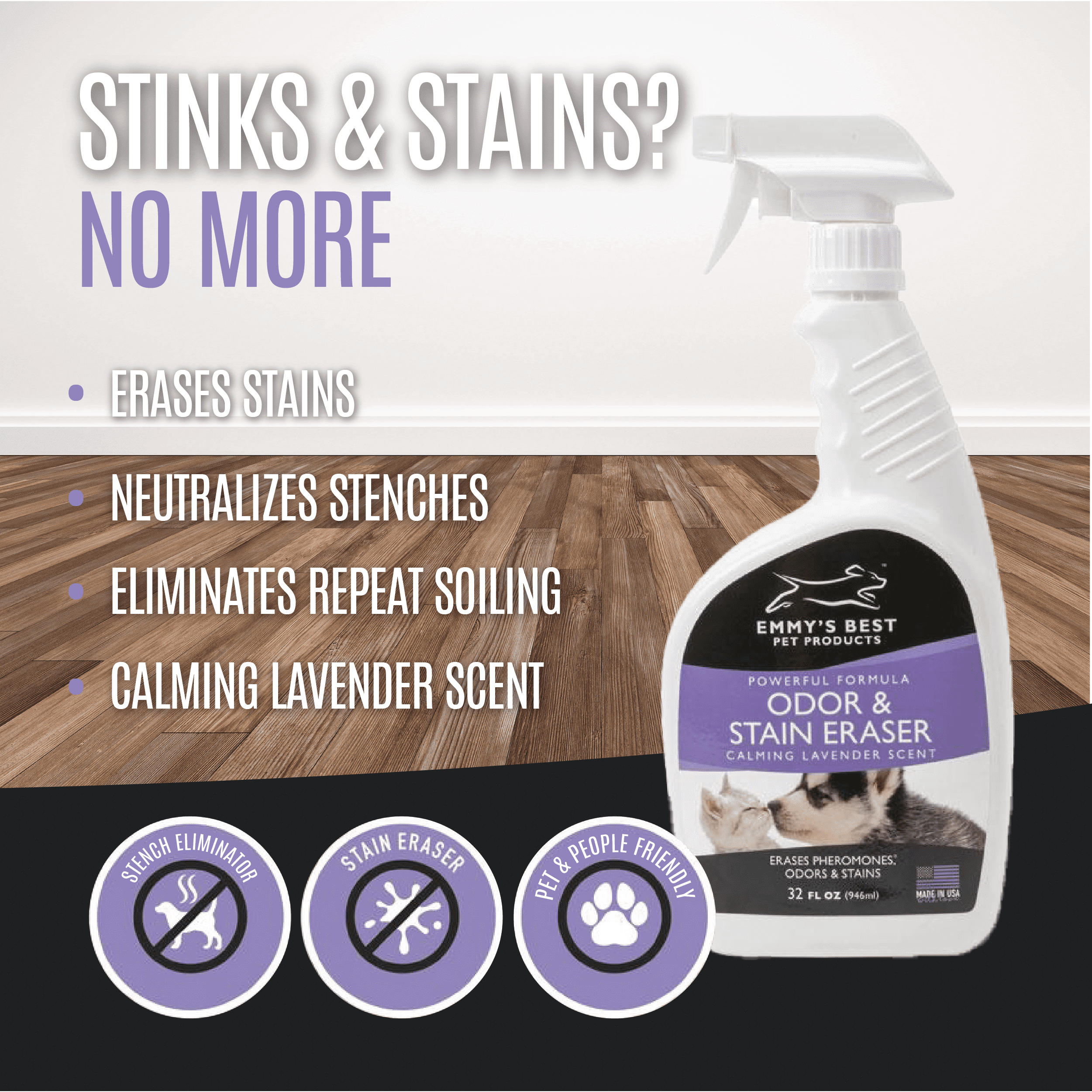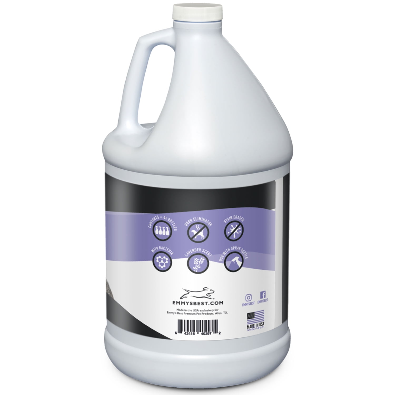 128 fl. Oz. pet stain and odor remover spray Triple action formula breaks down stains and odors with powerful enzymes Pet urine enzyme cleaner with a calming, refreshing lavender scent Odor neutralizer that’s safe to use around pets and humans Works on all surfaces such as carpets, upholstery, wooden flooring, tiles, and concrete