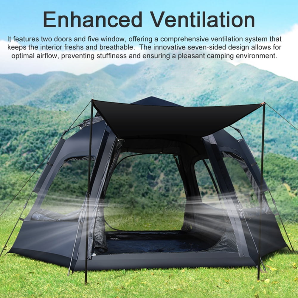 Best Waterproof Camping Tent: made of waterproof material,Made with 210D waterproof Oxford fabric, It is tear-resistant and offers exceptional durability. The double-layered silver-coated fabric provides effective insulation and ultraviolet protecting. Quick Family Instant Tent with Spacious Interior: Hexagon shape with 5.2ft center height which let you move comfortably,it can accommodate 2-3 adult or 4 children, The panoramic mesh skylight allows you to admire the starry night-sky from the comfort of your tent. The included skylight cover provides protecting against rain and sun. Fast Pitch Tent with Spacious Interior: Very fast to pop up and take down,the poles and tent material are joined permanently to the poles,and the poles only partly break down, opening it up is as easy as opening an umbrella, The camping tent, designed for convenience, is fully automatic and can be set up in just 3 seconds. hexagon shape with 5.2ft center height which let you move comfortably Waterproof Automatic setup Tent: One day you go to beach with your daughter and son,So happy small family,The tent is going to get a lot of use for your family,protect you from sun and rain,excellent beach camping tent Good Ventilation: It features two doors and five window, offering a comprehensive ventilation system that keeps the interior freshs and breathable. The innovative seven-sided design allows for optimal airflow, preventing stuffiness and ensuring a pleasant camping environment. Portable and Versatile: It comes with a convenient storage bag, making it easy to transport and carry wherever you go. Whether you’re hiking, backpacking, or heading to the beach, this tent is a perfect companions for your activities.
