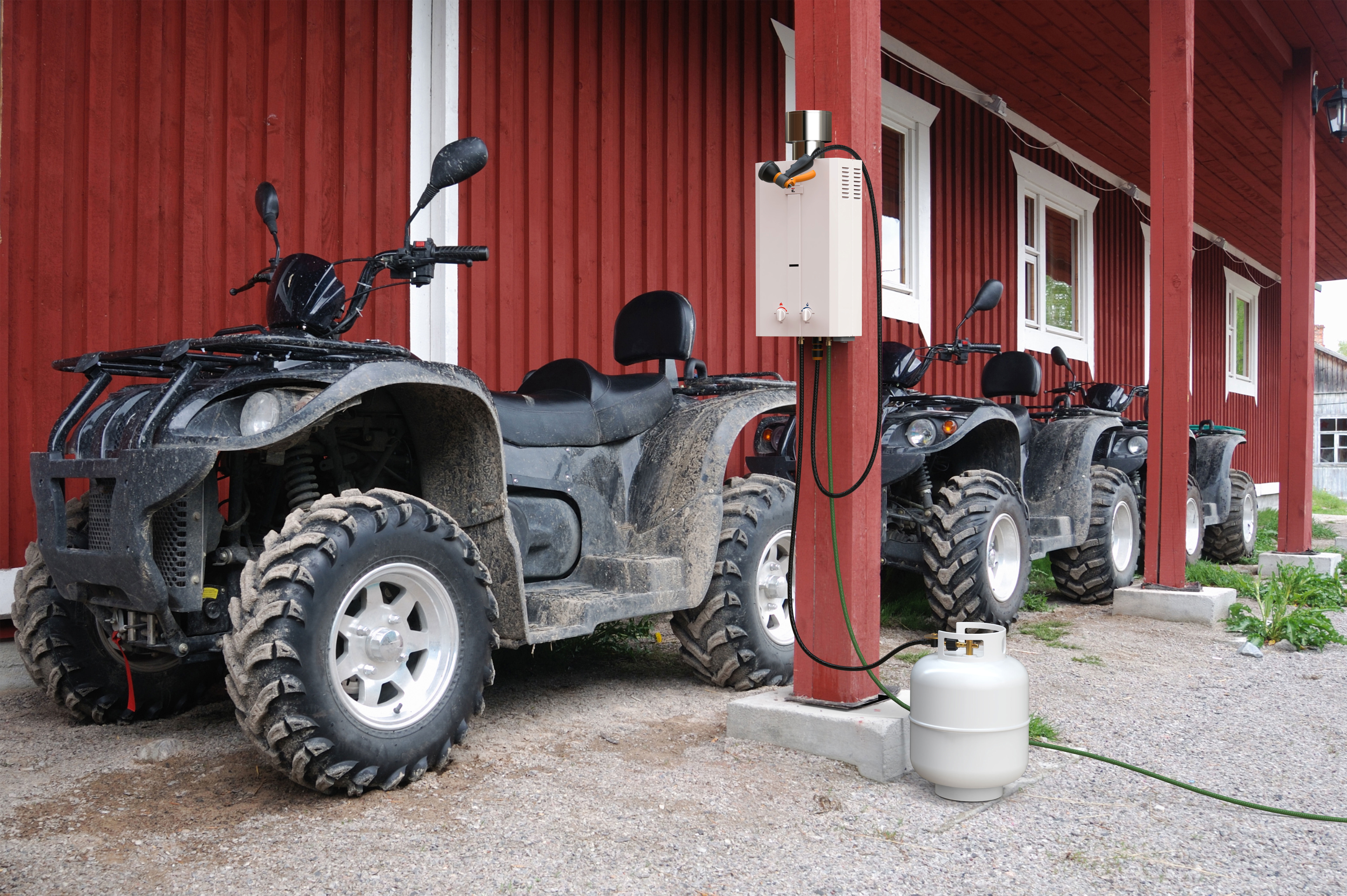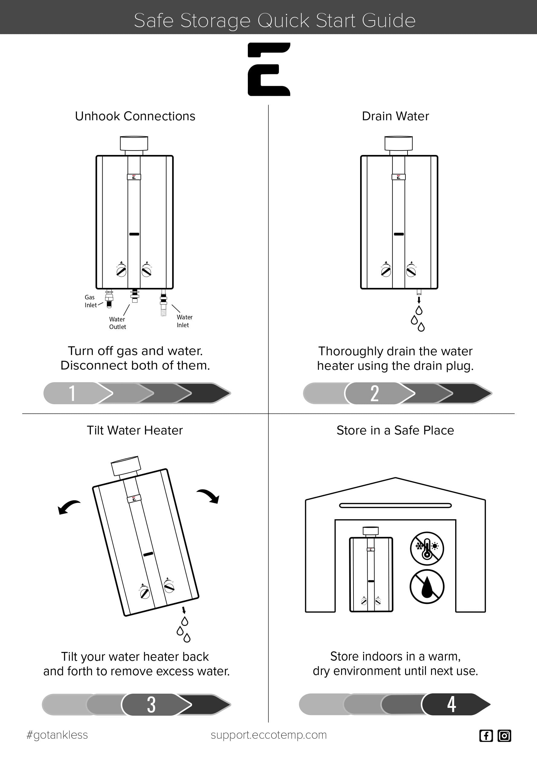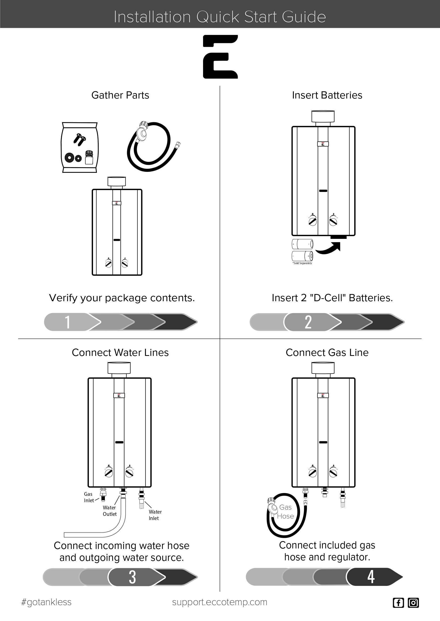 Lightweight, easy to carry, and compact. This portable water heater provides instant and reliable hot water in a variety of outdoor scenarios with no electricity required: while you’re camping, RVing, hunting, hanging poolside, washing your pets or horses, cleaning your vehicle, or even outside your tiny home, greenhouse, or food truck. Runs on a standard 20 lb. Liquid Propane tank and is equipped with an electronic ignition. Powered by 2 “D” cell batteries, making it ideal for on-the-go Features a safety shut-off that is activated when it is tilted more than 45 degrees in either direction Low pressure activation of 20 PSI and is easy to connect to any standard garden hose Rated at 3.0 gallons per minute (GPM) of hot water output with an achievable temperature range of 50 – 120 degrees Fahrenheit Limited Manufacturer Warranty (Heat Exchanger: 1 Year, Components: 1 Year, Parts/Accessories: 30 days), live chat, and self-help guides will give you peace of mind that the Eccotemp L10 will keep you in hot water for years What’s Included: Eccotemp L10 Portable Tankless Water Heater, 3 1/2′ CSA certified gas regulator and hose, and mounting hardware Lightweight, easy to carry, and compact. This portable water heater provides instant and reliable hot water in a variety of outdoor scenarios with no electricity required: while you’re camping, RVing, hunting, hanging poolside, washing your pets or horses, cleaning your vehicle, or even outside your tiny home, greenhouse, or food truck. Runs on a standard 20 lb. Liquid Propane tank and is equipped with an electronic ignition. Powered by 2 “D” cell batteries, making it ideal for on-the-go Features a safety shut-off that is activated when it is tilted more than 45 degrees in either direction Low pressure activation of 20 PSI and is easy to connect to any standard garden hose Rated at 3.0 gallons per minute (GPM) of hot water output with an achievable temperature range of 50 – 120 degrees Fahrenheit Limited Manufacturer Warranty (Heat Exchanger: 1 Year, Components: 1 Year, Parts/Accessories: 30 days), live chat, and self-help guides will give you peace of mind that the Eccotemp L10 will keep you in hot water for years What’s Included: Eccotemp L10 Portable Tankless Water Heater, 3 1/2′ CSA certified gas regulator and hose, and mounting hardware