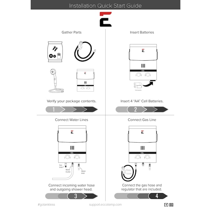 - What’s included: Eccotemp EL5 Portable Tankless Water Heater, 3-spray Shower Headset, CSA certified Gas Regulator and Hose, mounting hardware, and garden hose Quick Connect and Adapter