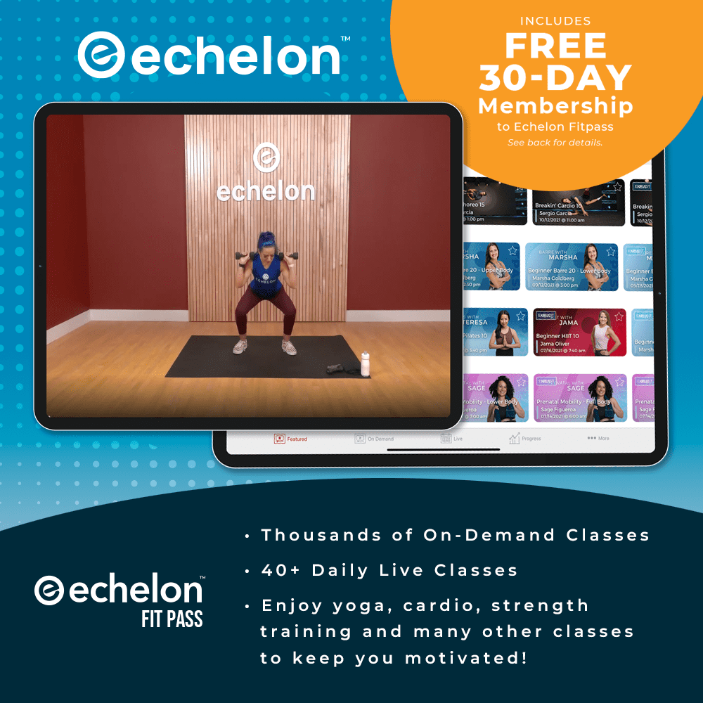 The Echelon Super Band Kit is thick and extra-strong, making it ideal for heavy-duty applications. Rubber resistance workout is taken to a whole new level with the cross-train super bands. Full-body extension and heavy-duty use are suitable for this band. This band, which comes with three distinct resistance levels, is sure to improve any user’s workout. The band strengthens leg muscles, stretches hips and shoulders, adds resistance to walks, shuffles, and lunges, and aids in the prevention and recovery of sprained ankles. Give your home workout a boost with a free 30-day trial of Echelon’s Fit Pass Membership. Through the Echelon Fit® app, Fit Pass Membership brings high-quality, off-equipment workouts to anyone at any level. Echelon’s expert instructors lead live and on-demand classes streamed from studios worldwide so you can easily find what moves you. Fit Pass Membership features classes in HIIT, Strength Training, Yoga, and more so you can change up your workouts and challenge yourself. Getting started is easy! 1. Head to member.echelonfit.com and create a member account 2. Select the Echelon as your brand 3. Enter your product information and under “Product” select “Fit Pass” 4. Claim your 30-day free trial (note: billing information is required, but you will not be charged until your free trial expires.). You will then receive a confirmation email and access to thousands of diverse classes featuring the latest hit music. With Echelon Fit Pass, it’s a breeze to level up your home fitness routine!
