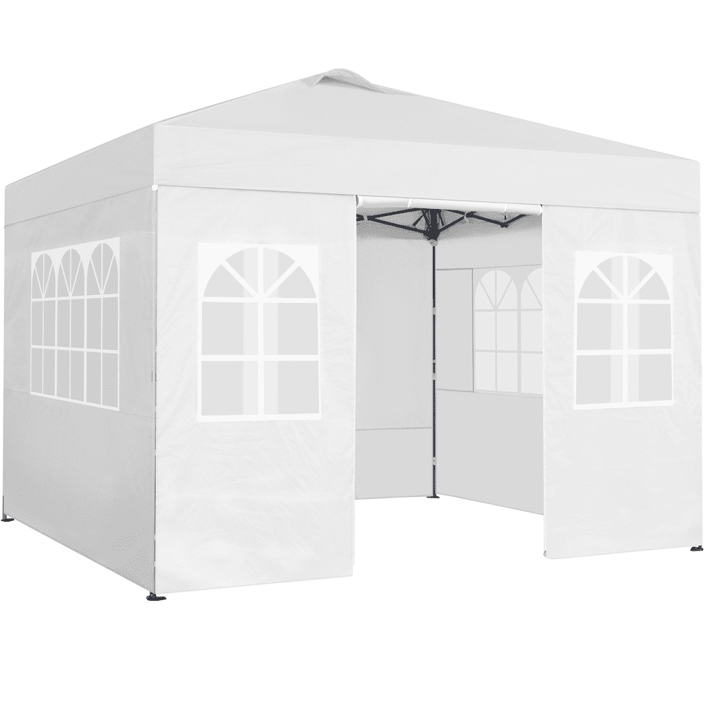 Show your colors on game day with the Economy Canopy tailgate tent. When set up it, measures 9 ft. x 9 ft., the size of a standard parking space. It is made of durable powder-coated steel and water-resistant polyester. The top and valances come in alternating team colors and feature two logos on alternating sides. It has a 6 ft. head clearance and stands 9 ft. at the tallest point. It has three height adjustment levels, and no-pinch, easy-to-push buttons. It takes about three minutes for two people to set up. It comes with a drawstring carrying bag, eight ties and eight stakes. It weighs 29 pounds. Weight bags are sold separately for use on concrete. Water-resistant canopy top made of 210 denier polyester 6 ft. head clearance and stands 9 ft. at the tallest point Three height adjustment levels with no-pinch, easy-to-push buttons Comes with a drawstring carrying bag, eight ties and eight stakes.