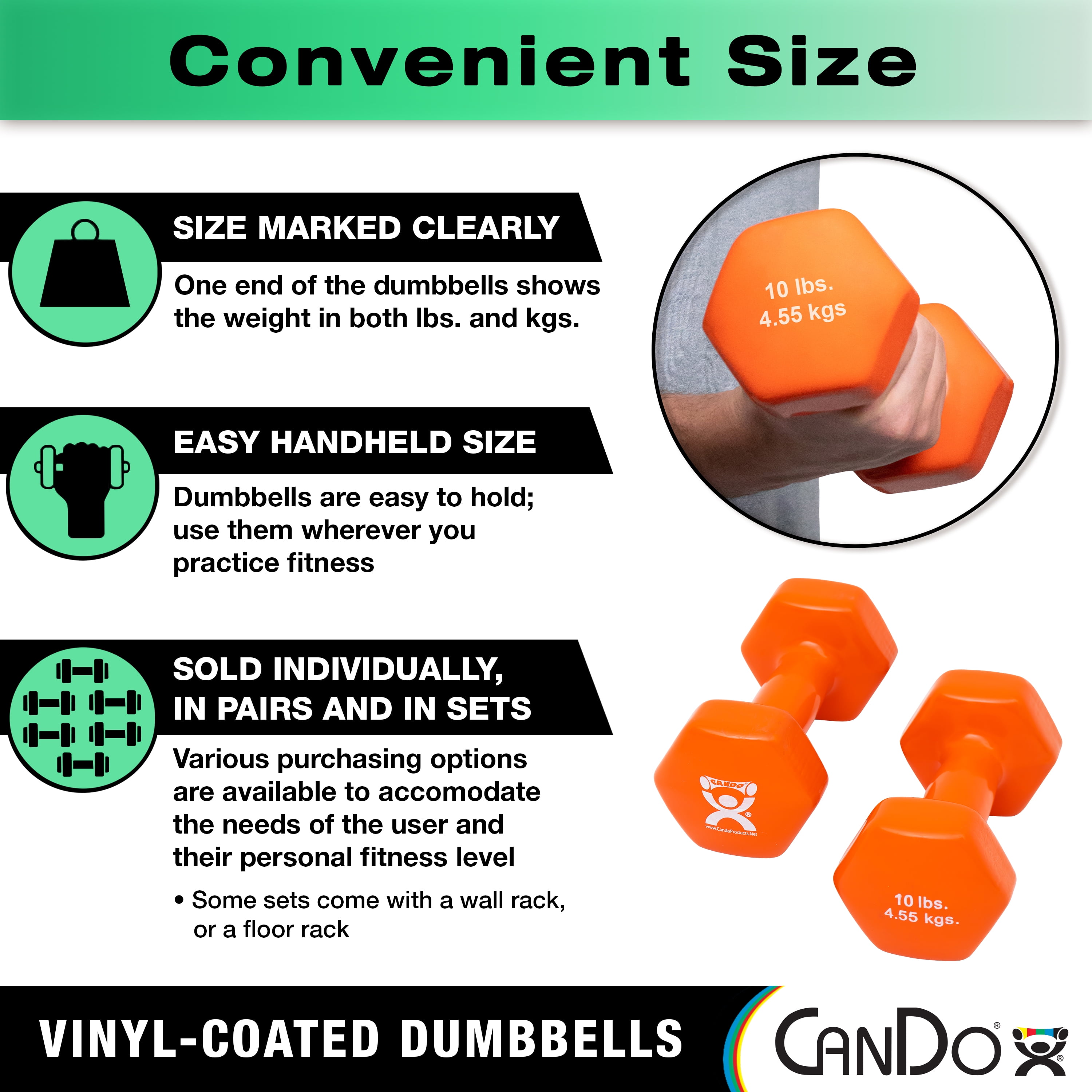 Vinyl-Coated Handheld Dumbbells – All fitness levels from beginner to pro will benefit from using CanDo dumbells! Utilize our versatile dumbbells to build and tone muscle and add resistance to cardio. Ideal for home, gym, and physical therapy. Quality Features – Our dumbbells are made of vinyl-wrapped cast iron. The soft vinyl protects hands and keeps your floors from getting scratched. The vinyl is also easy to clean with soap and water. Dumbbells are hexagon shaped to prevent rolling. Convenient Size – CanDo Vinyl-Coated Dumbbells fit comfortably in the user’s hand. The soft, non-slip grip material ensures ease of use during workouts. It’s a cinch to incorporate our dumbbells into routines anywhere – at home, PT, or the gym. Color Coded Weights – Color removes the guesswork! CanDo Vinyl-Coated Dumbbells are color-coded so the user can easily identify the weight they’d like to use. Weight is displayed clearly on one end of the dumbbells, and is shown in both lbs. and kgs. Choose Your Weight – Our dumbbells are available in 13 eye-popping, color-coded weights from 1 lbs. (0.45 kgs) to 20 lbs. (9.1 kgs). Purchase them individually, in pairs or in sets. Some sets include a mobile studio rack, a wall rack or a floor rack.