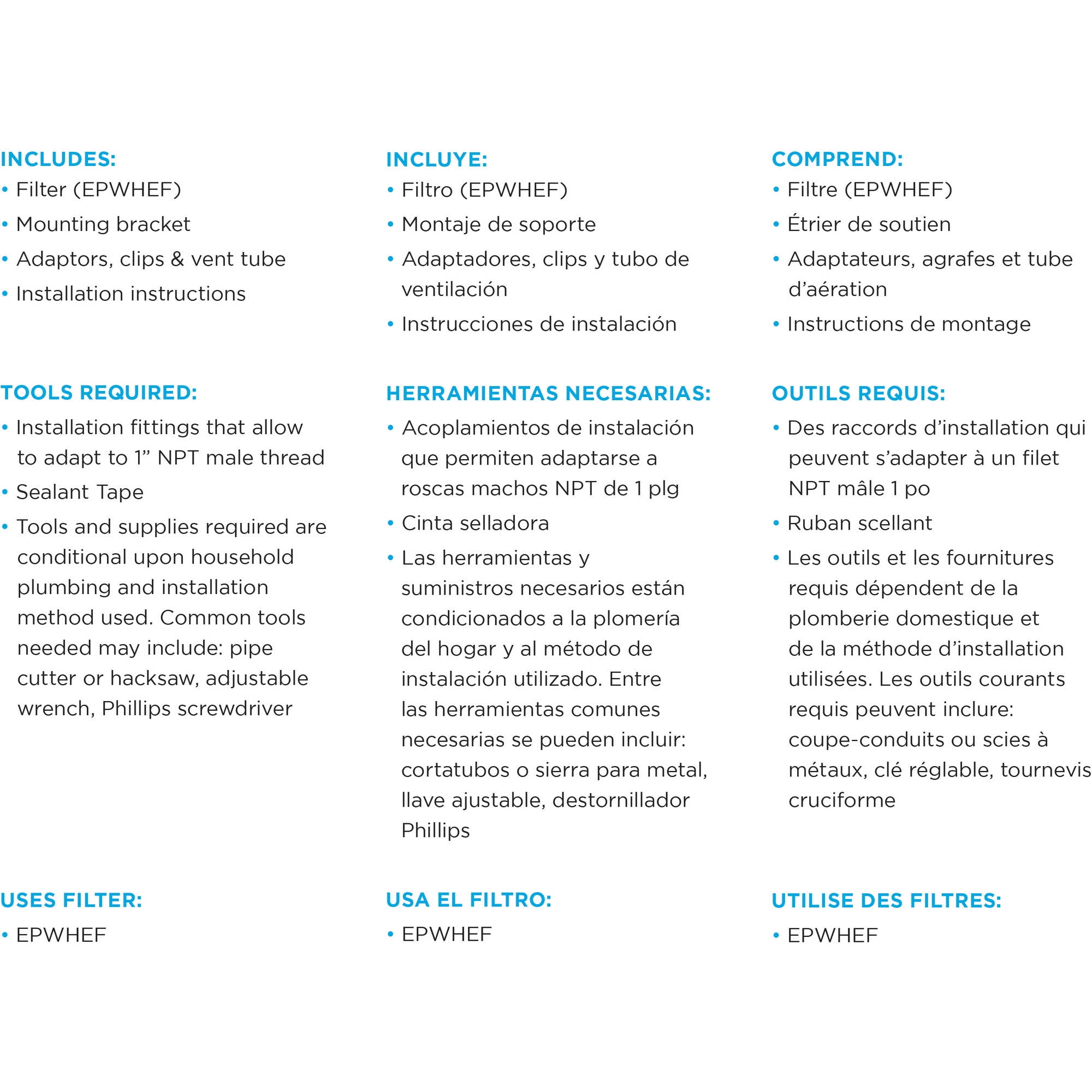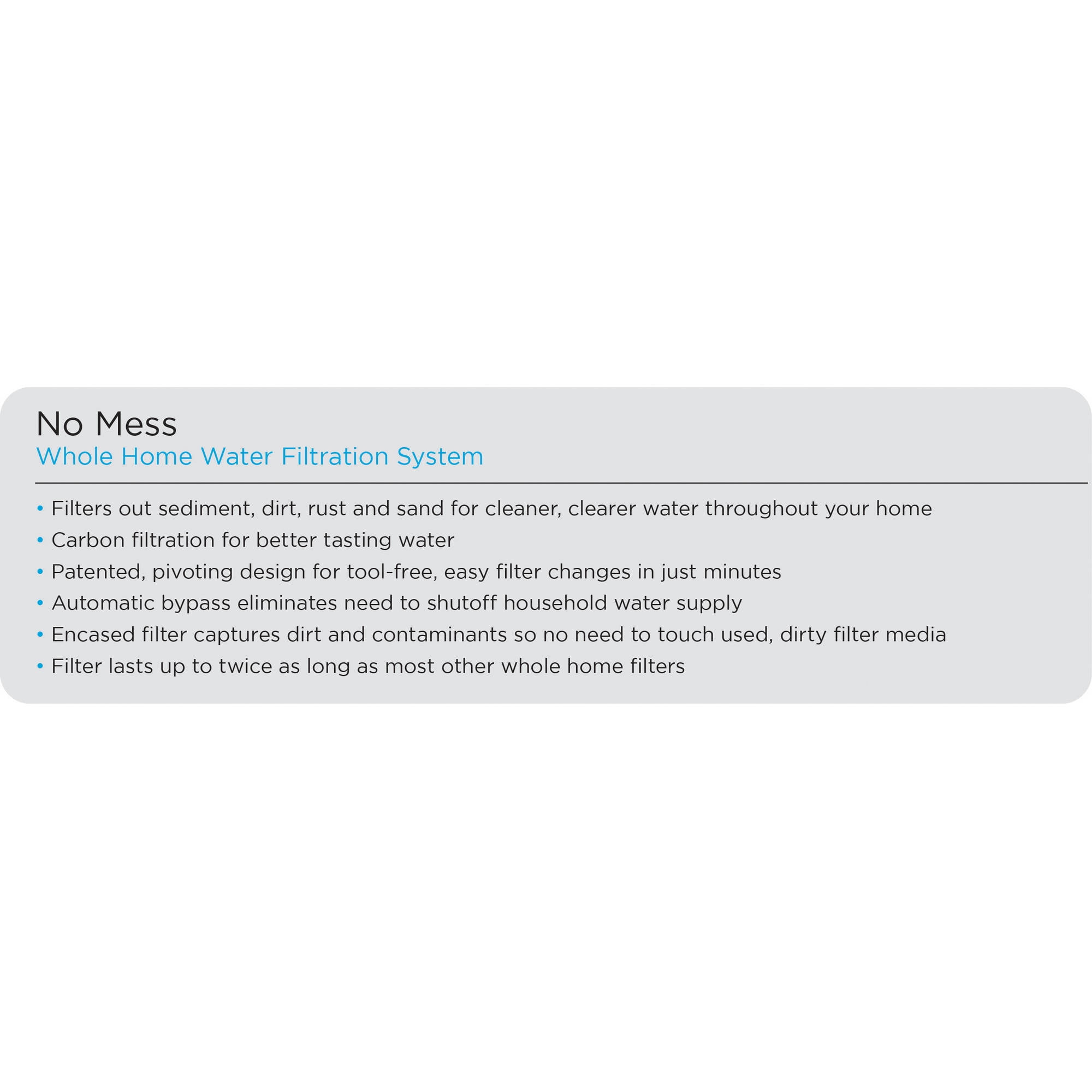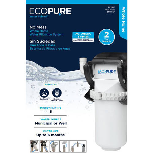 EcoPure No Mess Whole Home Water Filtration System: Provides cleaner, clearer, better tasting water while protecting your plumbing and water using appliances NSF Certified to reduce chlorine taste and odor, sediment, sand, silt and rust No need to shut off your water supply when changing filters, allowing for a quick, tool free filter change Encased filter captures dirt and contaminants eliminating the need to touch used, dirty filter media Includes: System, up to 6 month filter (EPWHEF), mounting bracket, adaptors, clips and vent tube and installation instructions Designed for use with municipal or well water supplies 2-year warranty Text ECOPURE to 444999 to sign up for filter change reminders. Questions? Lifetime tech support available, call the EcoPure helpline at (800) 693-1138 or visit ecopure.com