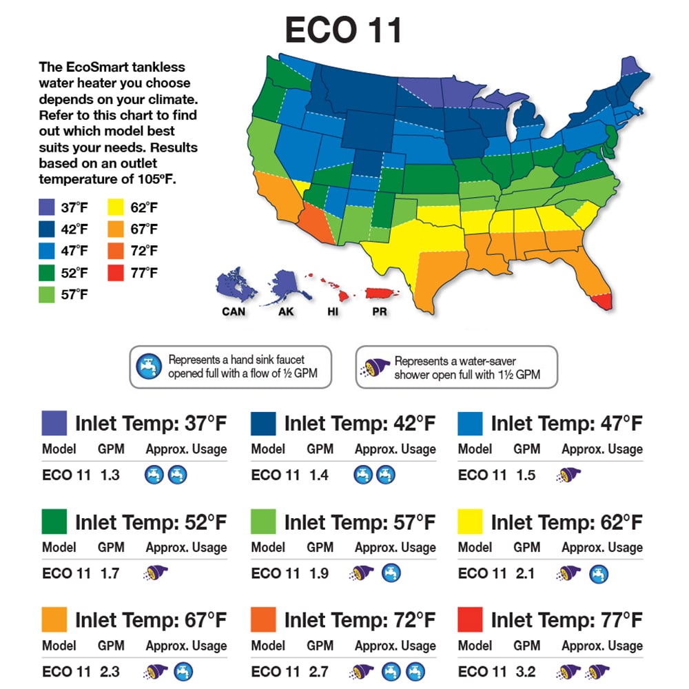 EcoSmart ECO 11 is a 13-kilowatt tankless electric water heater ideal for providing hot water for a bathroom, small sink, office breakroom and other point-of-use or low-flow applications. It can provide between 1.3 and 3.1 gallons-per-minute depending on the inlet water temperature. To select the best solution for your hot water needs, please refer to the sizing guide. With EcoSmart you will be happier knowing the warm water you expect is available endlessly, consistently, and on-demand, allowing you to reduce your water and energy waste.