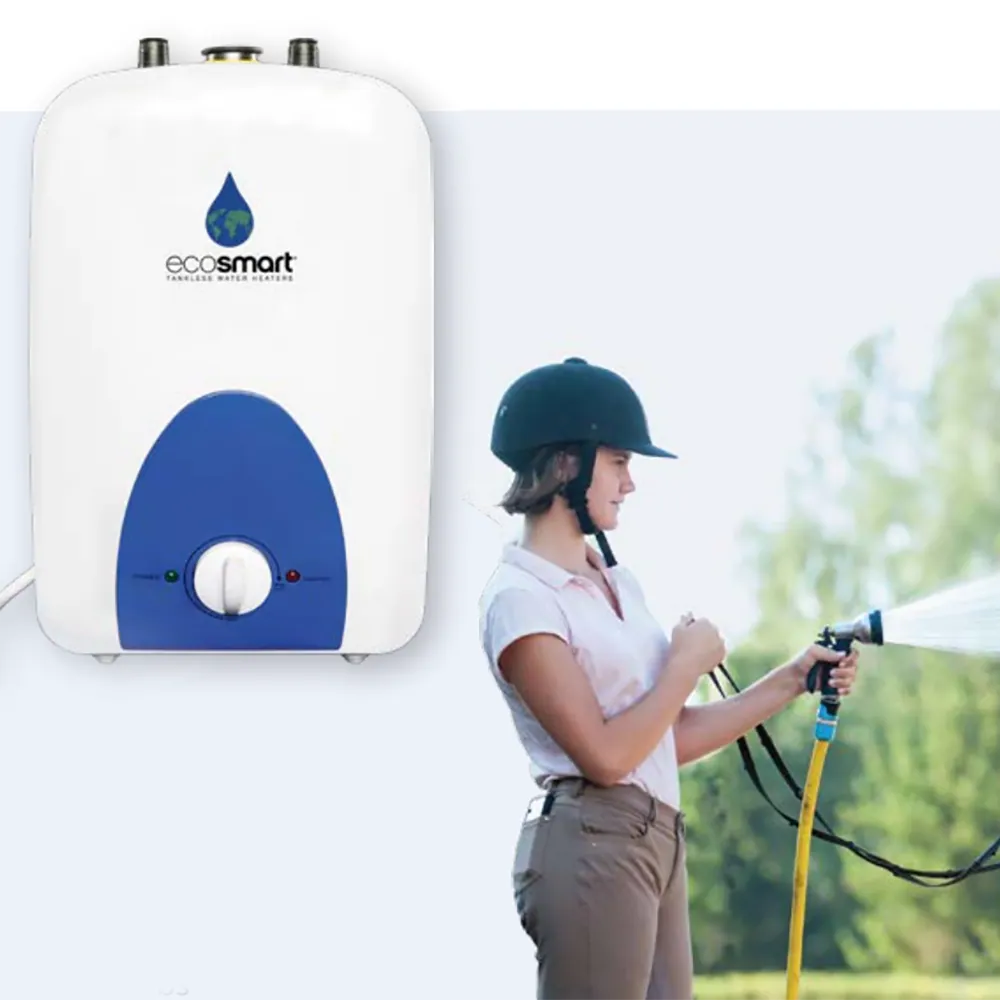 EcoSmart ECO MINI 6 delivers hot water right where you need it, from your garage or outdoor kitchen to your recreational vehicle, this little problem-solver brings the warmth wherever you go. Save water by eliminating the wait for hot water to reach the faucet. Simply tap into the water line and install the heater directly at the sink. No need for costly recirculating lines and pumps. When you want to eliminate the wait for hot water but need more volume, install the heater in-line with a larger hot water source, such as a tankless heater or a storage tank heater. Lightweight and compact, this unit plugs into a standard 120 V outlet.nd pumps. And when you want to eliminate the wait for hot water but need more volume, install the Eco Smart heater in-line with a larger hot water source, such as a tank less heater or a storage tank heater. Lightweight and compact, these units plug into a standard 110 volt outlet.