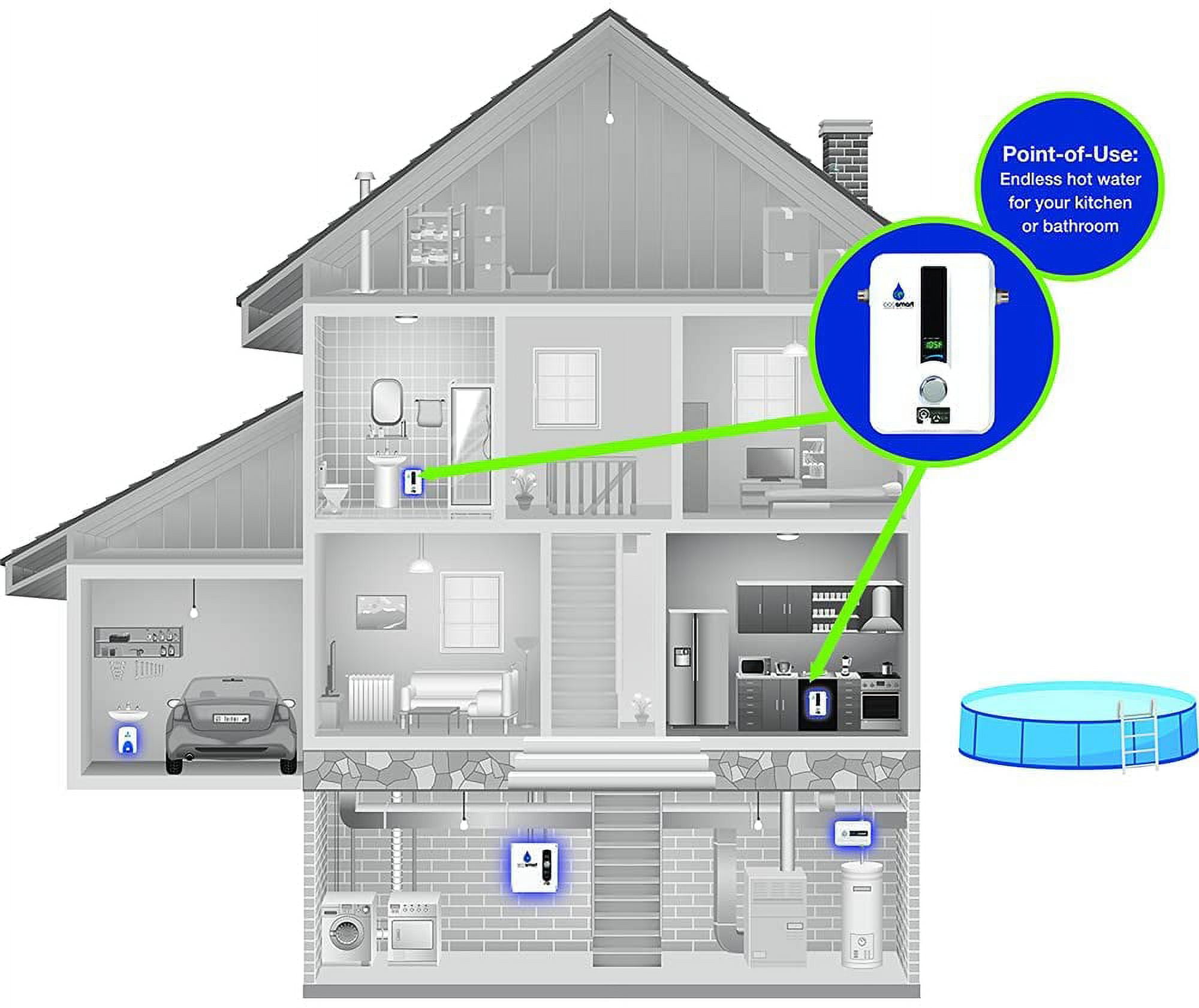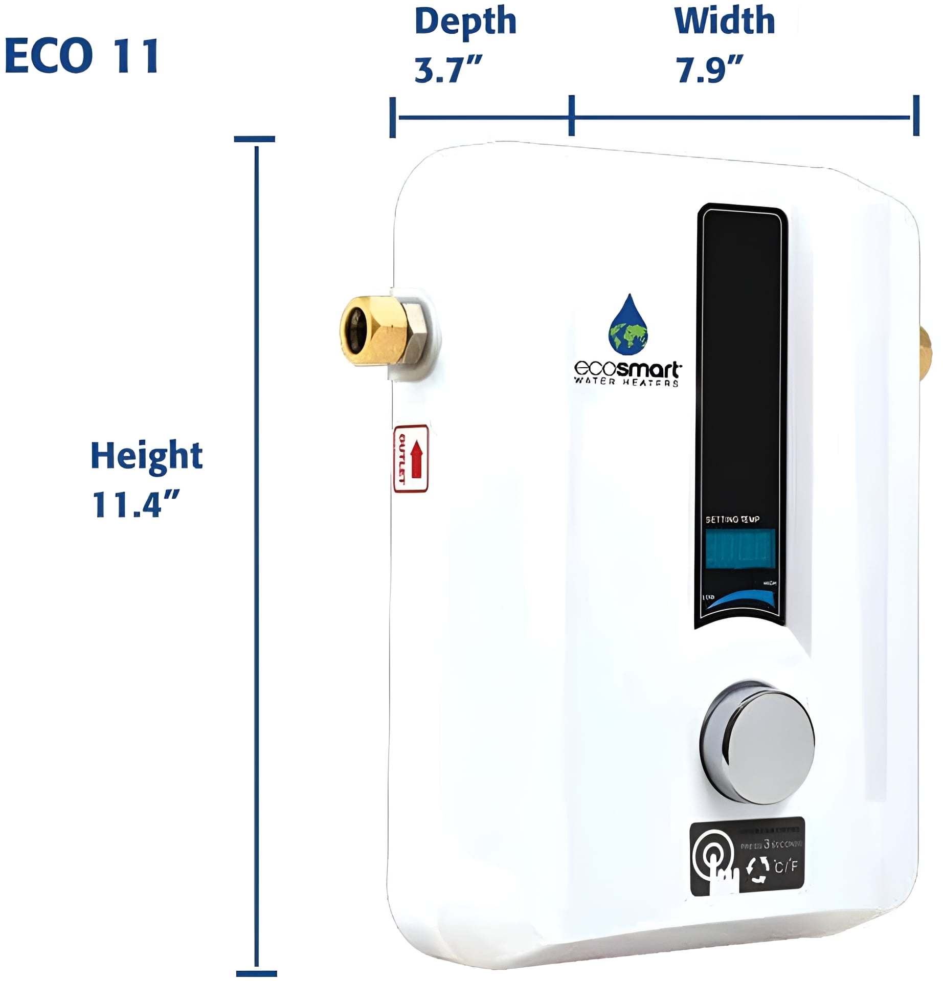 This Smart Technology electric tankless water heater is configured as a “”whole home”” model for climates where incoming water temperature is 67F and above. This model is well suited for heating up to 2-Gallon per minute, which is the equivalent of one shower head (with a 1.5 gpm flow) and one sink with a low inlet water temperature of 67F and an output setting of 105F. Digital Temperature Control allows you to set your temperature in increments of 1 Degree. This model can also be used in colder climates as a Point of Use for a sink or other low flow application. All tankless water heaters are sized based on flow rate and temperature rise, and there is a direct relationship between the two. So if used in a cold area requiring a high temperature rise, it will be more limited in the amount of fixtures (gallons per minute) it can heat at one time compared to a warmer climate. When sized properly this water heater will provide endless hot water and only consume the energy needed, giving the user complete control. Prior to purchase and installation please verify this model is the right size for the expected demand and electrical requirements. The ECO 11 requires a minimum 125 amp electrical panel for installation with (1) 60 amp double pole breaker connected to (1) set of #6 awg wire. Plumbing connections are 1/2″” compression fitting with the option of 1/2″” NPT adapter included. For additional assistance please feel free to contact our support center at 877-474-6473.NOTE : 11Kw at 220 is equal to 13kw at 240. .Activation Flow : 0.3 GPM This Smart Technology electric tankless water heater is configured for climates where incoming water temperature is 67 Degree F and above. This model is well suited for heating up to 2-Gallon per minute, which is the equivalent of one shower head (with a 1.5 gpm flow) and one sink with a low inlet water temperature of 67 Degree F. Digital Temperature Control allows you to set your temperature in increments of 1 Degree. This model can also be used in colder climates as a Point of Use for a sink or other low flow application. Prior to purchase and installation please verify this model is the rights size for your hot water needs and electrical requirements.